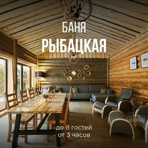Рыбацкая баняРыбацкая баня отвечает всем запросам уставших от суеты городских жителей: тишина, размеренность и ничего лишнего в интерьере — только природные материалы, баня на берёзовых углях и сеновал с мягким запахом лечебных трав.