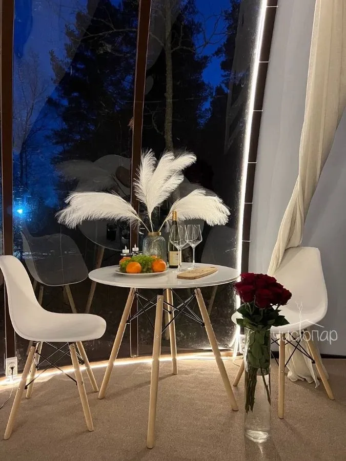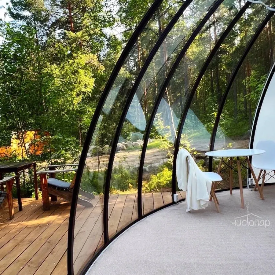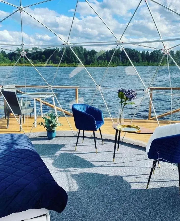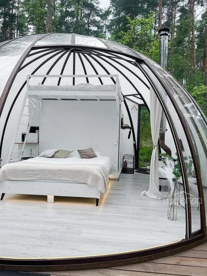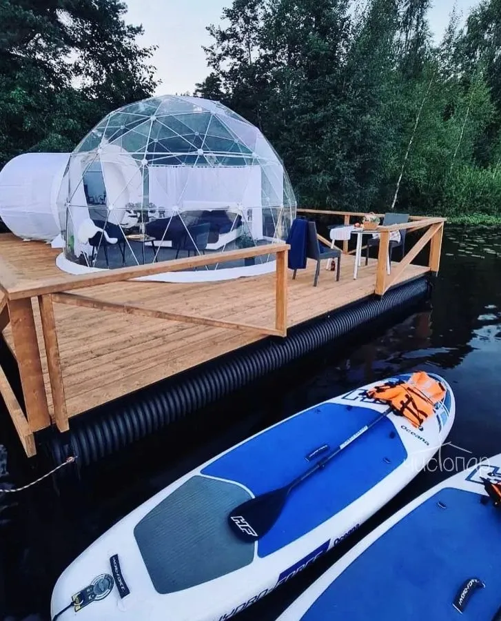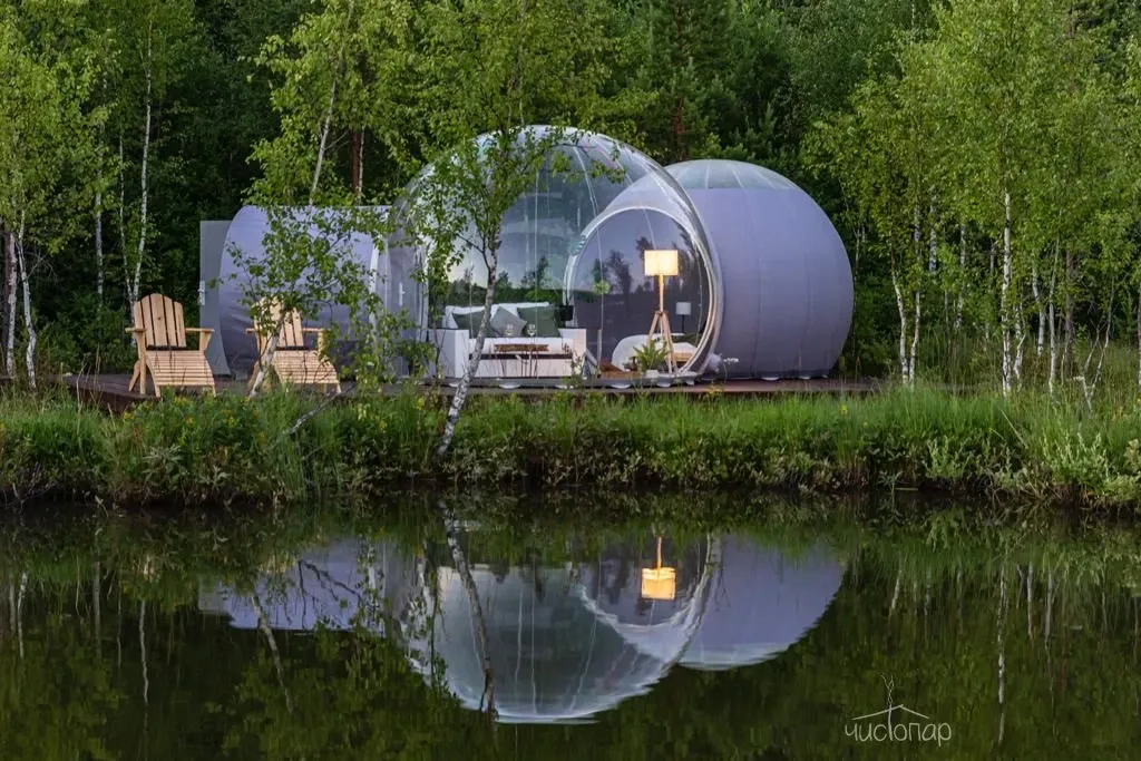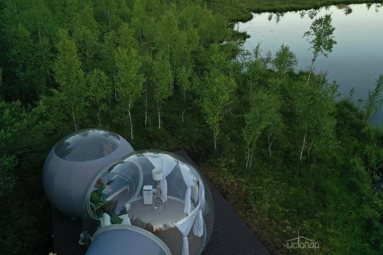 Bubble hotel расположен на берегу озера в 45 минутах от Санкт-Петербурга. В озере можно купаться, плавать на лодке и рыбачить. На территории отеля есть настоящая Русская баня, где можно отдохнуть в специальной комнате, искупаться в купели или озере