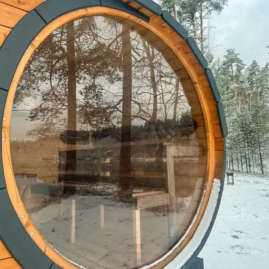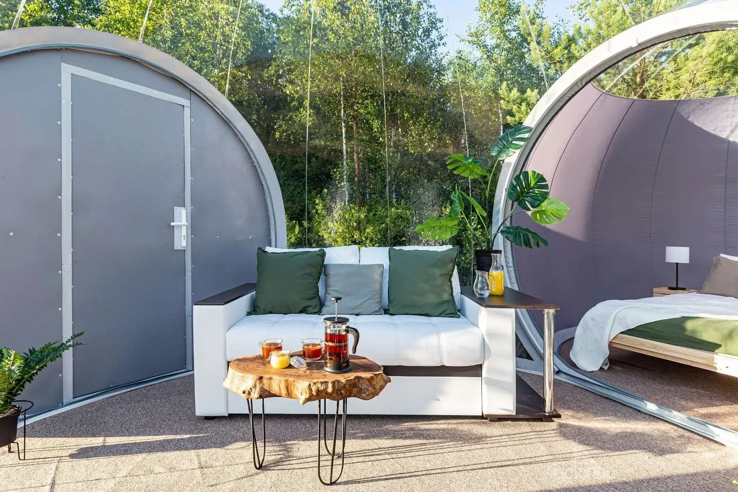 Уединенный номер в лесу на берегу озера. Рядом есть небольшой песчаный пляж. Сфера частично прозрачная. У номера небольшая терраса, где располагается столик со стульями и гамак.