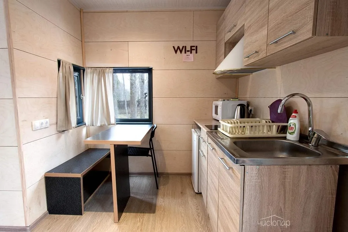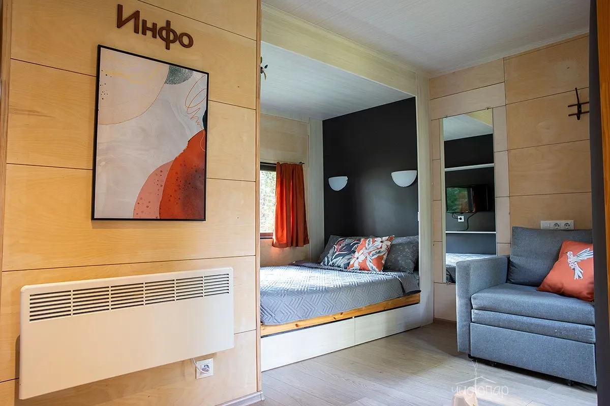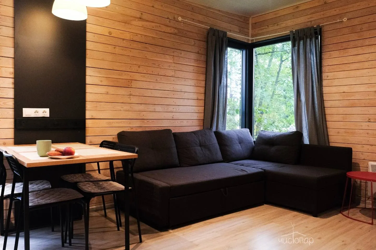 Уютный коттедж на 4 человекаК услугам гостей будут комфортная двуспальная кровать, раскладывающийся диван, собственная кухня, душ, место для хранения и сушки лыж, чистый лесной воздух, а также атмосфера уюта и загородного отдыха. Домик на четверых располагается в непосредственной близости от домиков на двоих.
