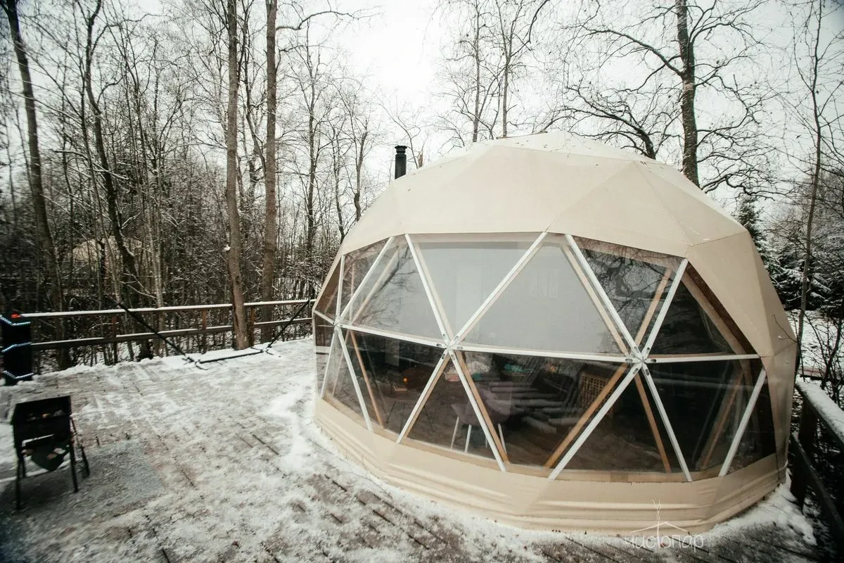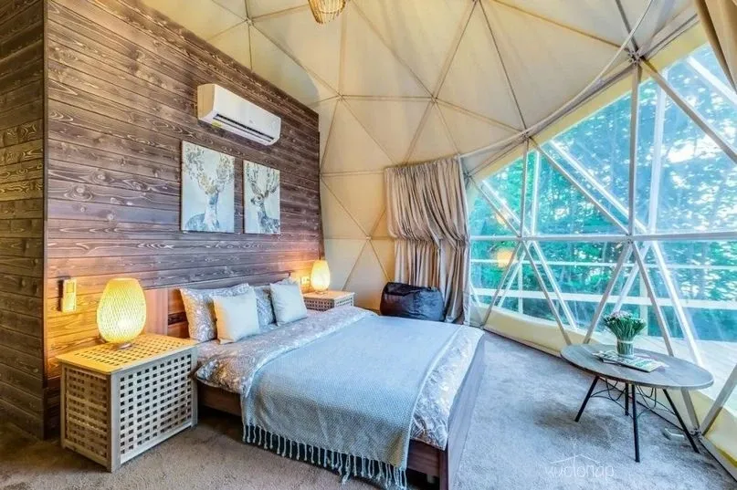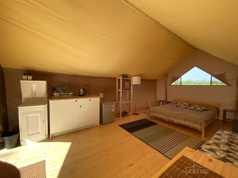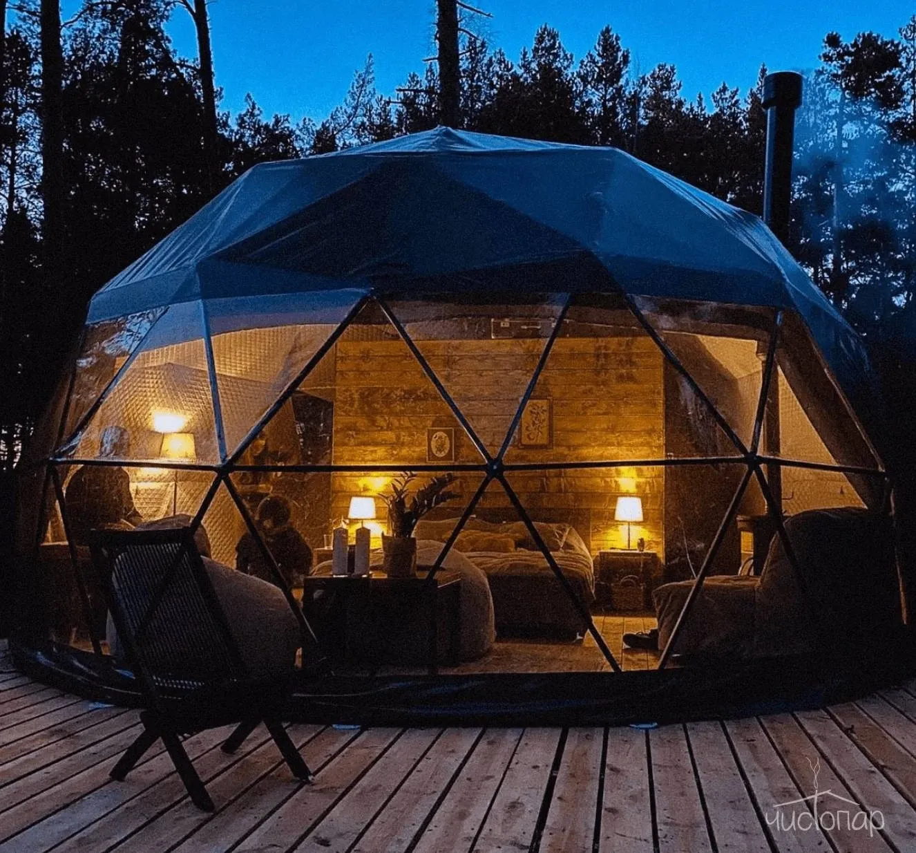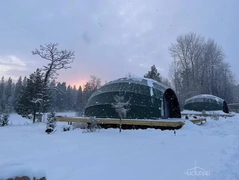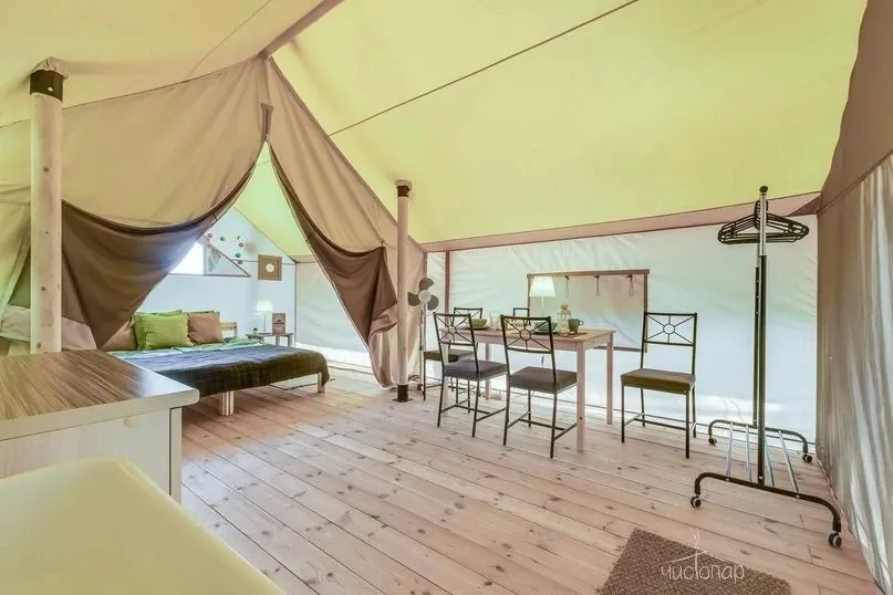 • Комфортное проживание: 3 комфортабельных лоджа с купелью, 5 сфер с панорамными окнами с видом на озеро, 13 стационарных комфортных шатров со всеми удобствами, 2 мини-дома с панорамными окнами с видом на еловый лес, дом в скандинавском стиле, дом в русском стиле из бруса.
