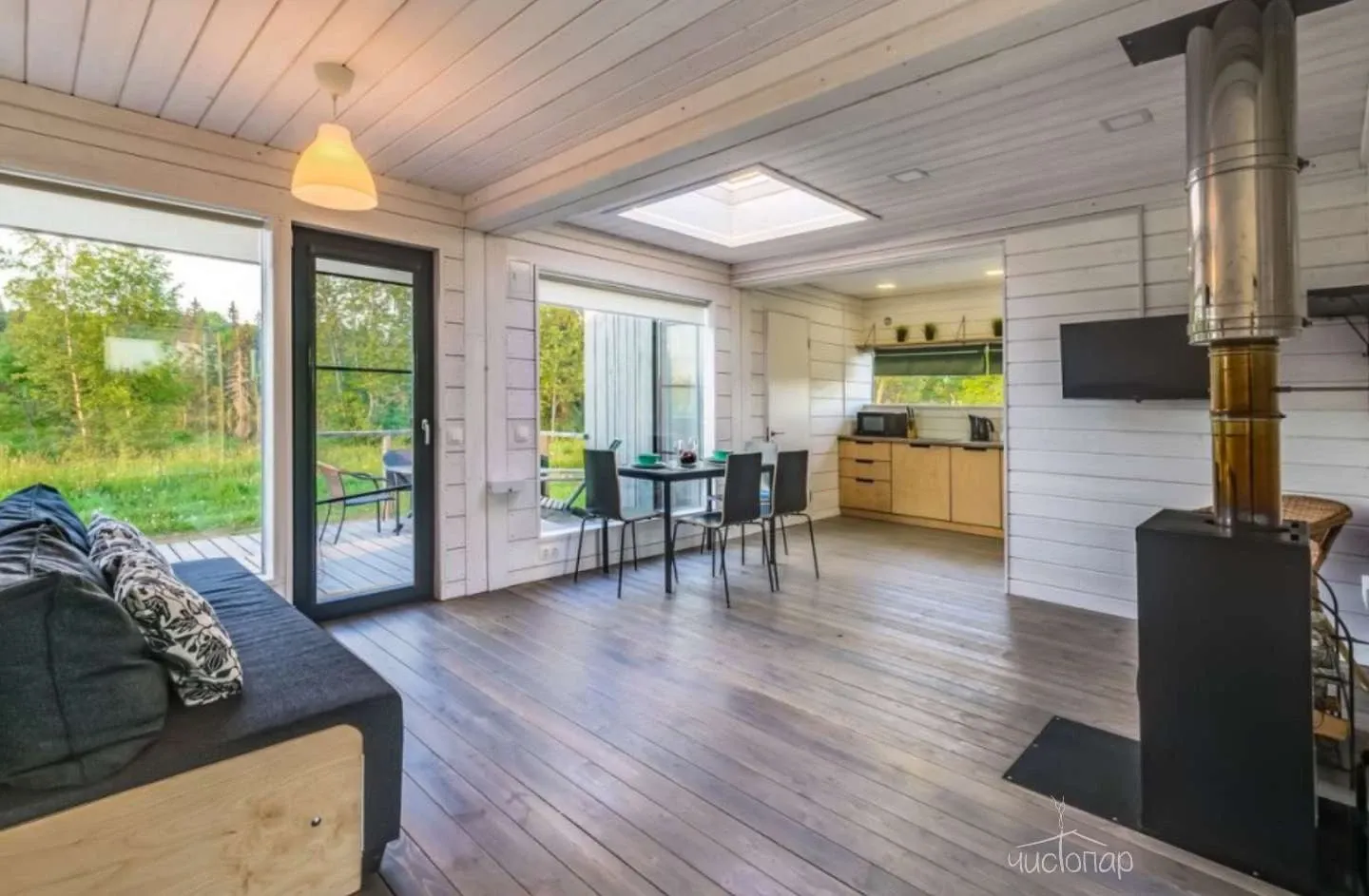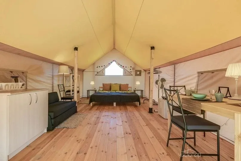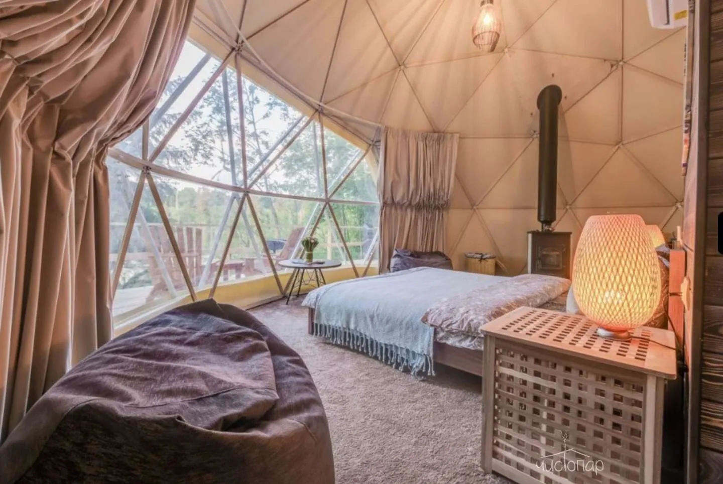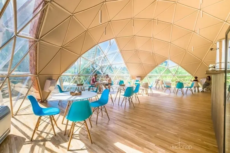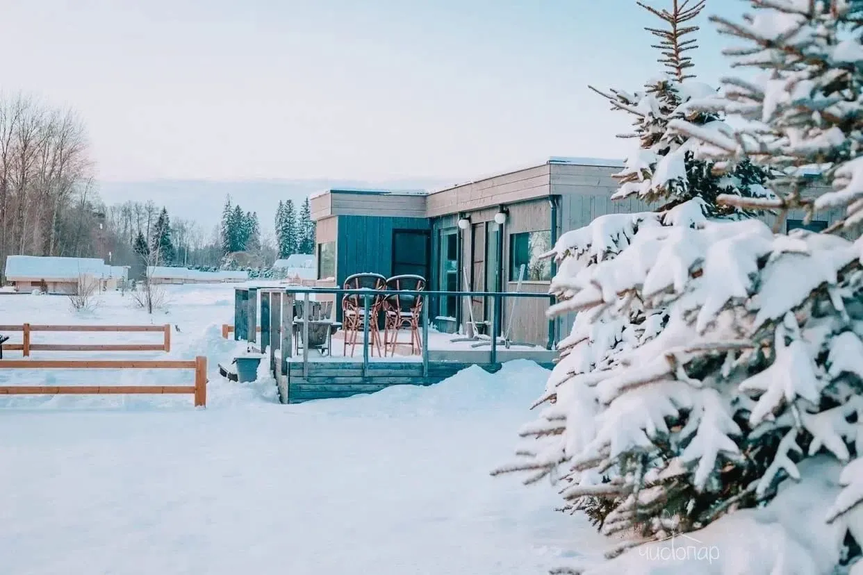 • Комфортное проживание: 3 комфортабельных лоджа с купелью, 5 сфер с панорамными окнами с видом на озеро, 13 стационарных комфортных шатров со всеми удобствами, 2 мини-дома с панорамными окнами с видом на еловый лес, дом в скандинавском стиле, дом в русском стиле из бруса.