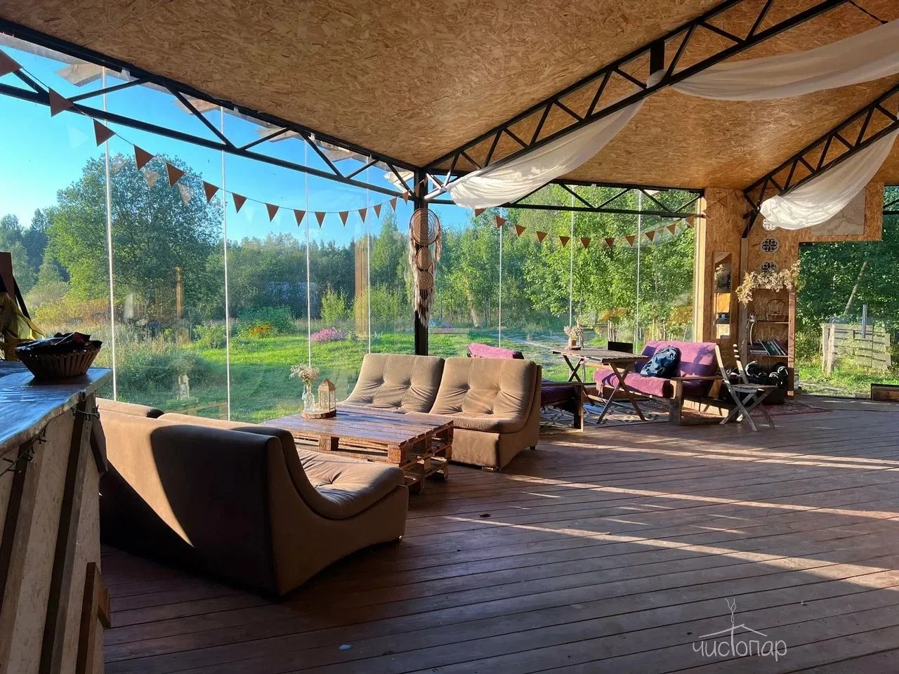 Внутри - комфортное уютное пространство с Hygge и Boho интерьером.