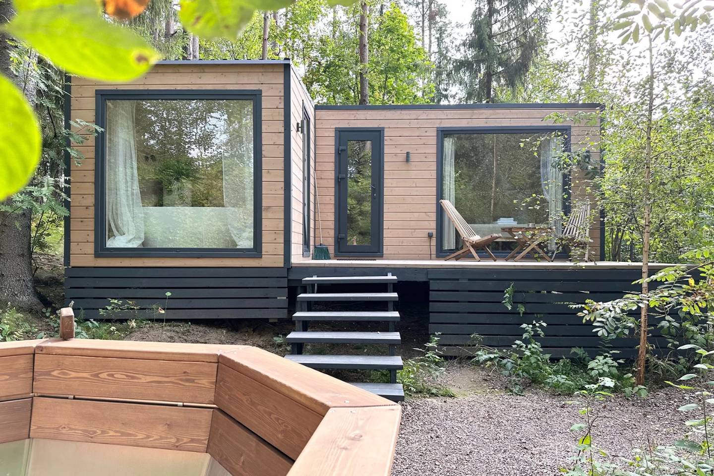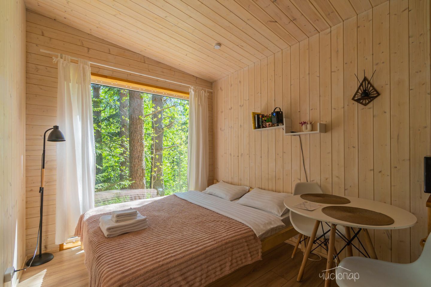 Домики оснащены всем необходимым, теплые в зимнее время и за счет панорамных окон позволяют наслаждаться красотами векового леса, не выходя из домика.