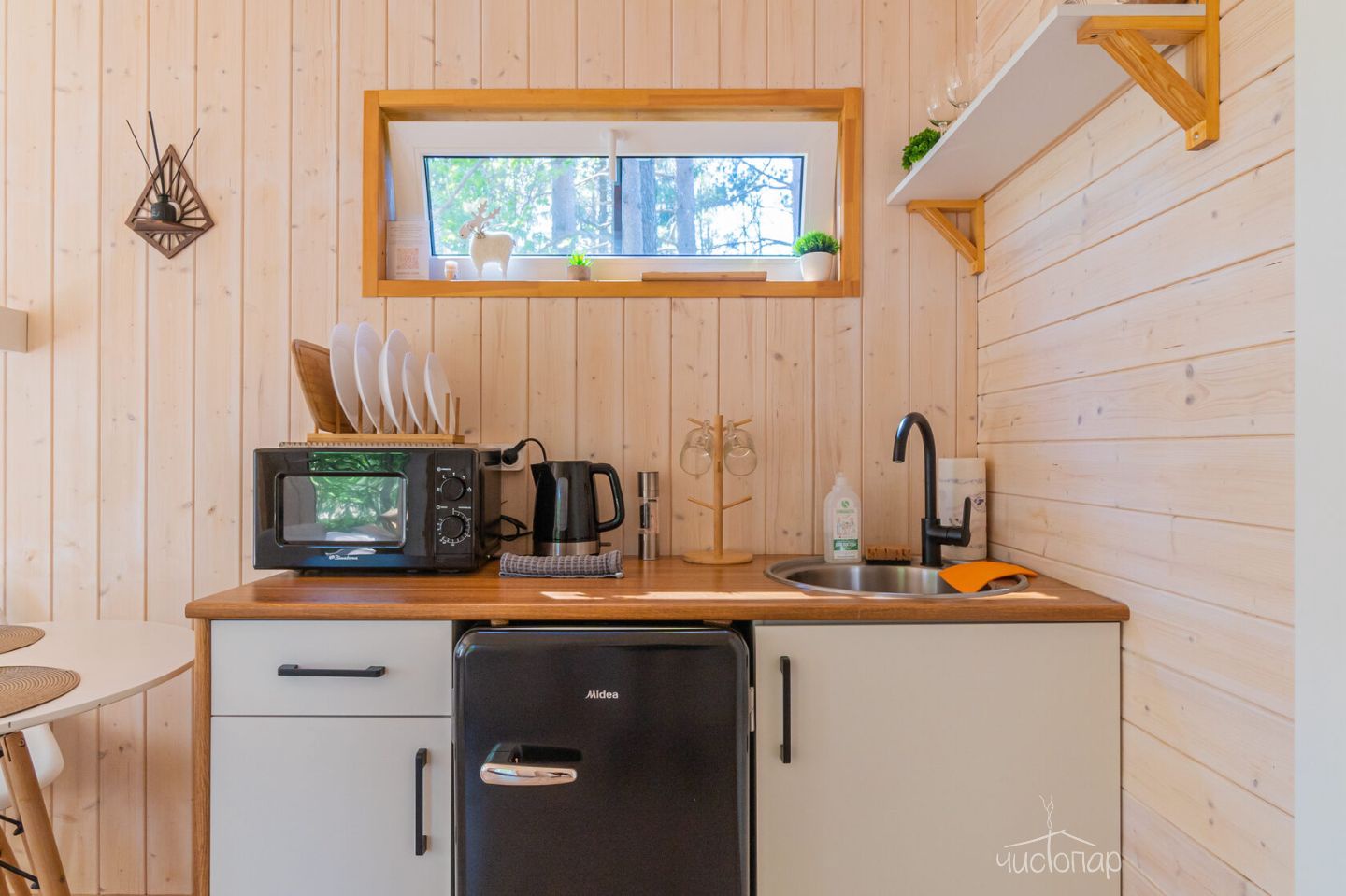 • Кухня полностью оборудована посудой для приготовления и сервировки стола (бокалы для вина, сока, чая). Сковородка, кастрюли, салатница, чайник заварочный