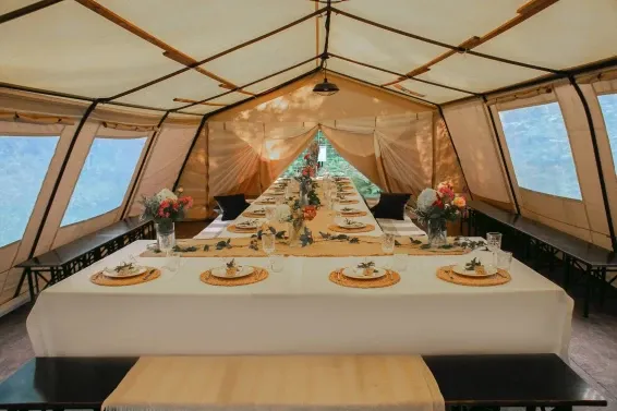 На территории глэмпинга есть СПА-комплекс, который включает в себя финскую сауну, подогреваемый бассейн с подсветкой, соляную пещеру, искусственное солнце. У бассейна оборудована небольшая зона отдыха c удобными шезлонгами.