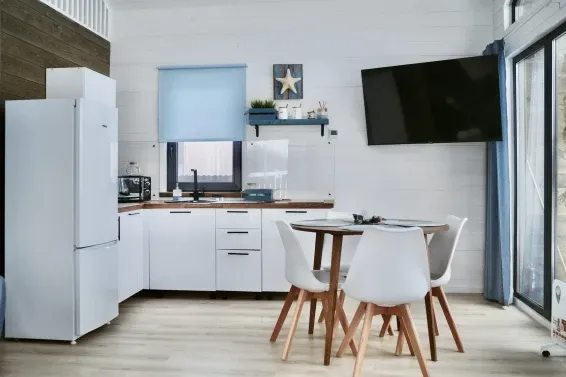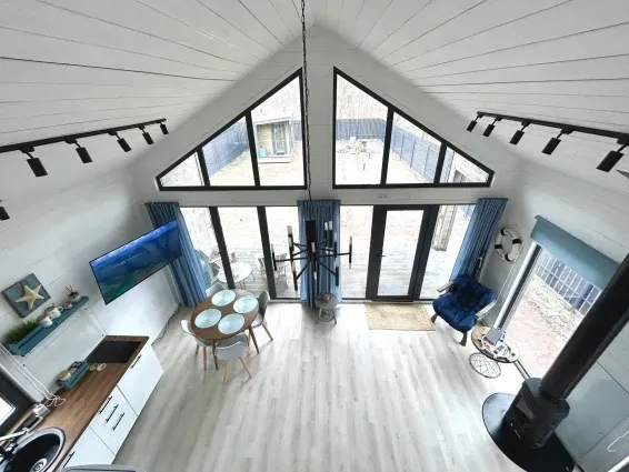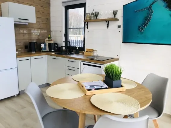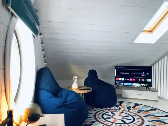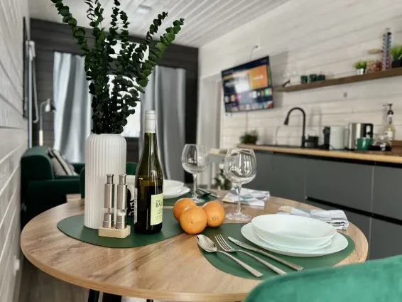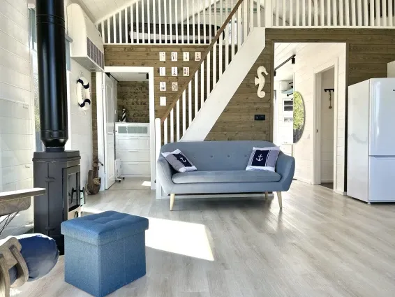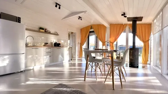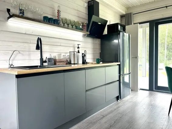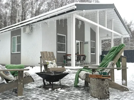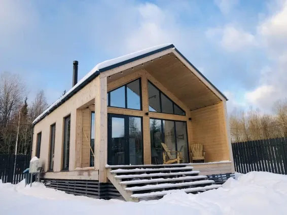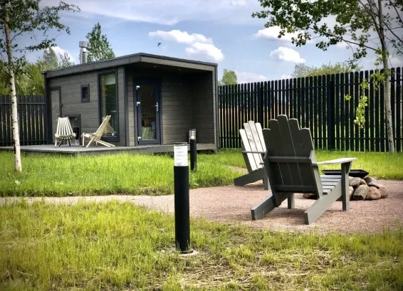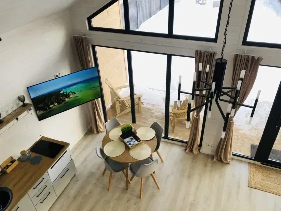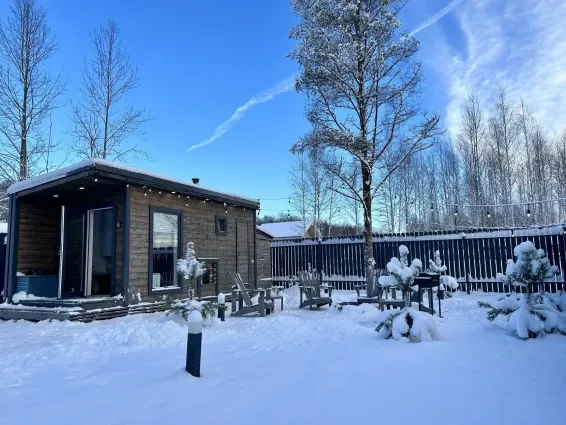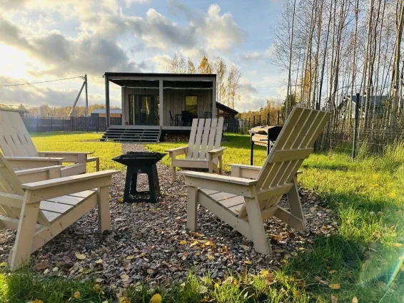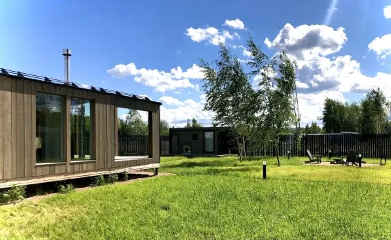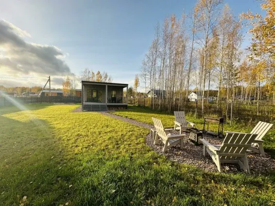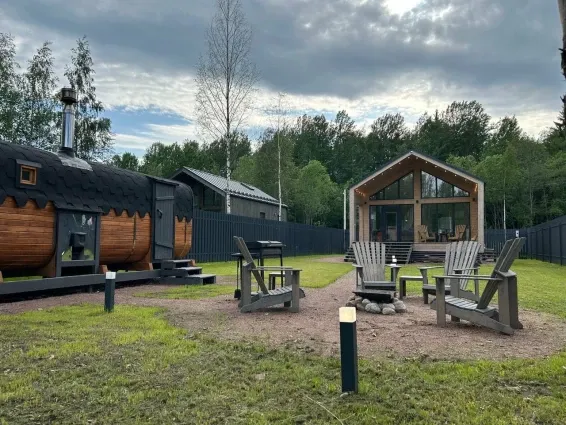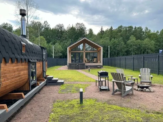 В домах есть панорамные окна, камин, терраса. На первом этаже и на втором лофт-этаже находятся двуспальные кровати, два телевизора с подпиской Кинопоиск (в гостиной и на втором этаже), Wi-Fi, колонка Алиса, настольные игры. На территории коттеджей имеется зона барбекю с костровой чашей и мангалом, предоставляются дрова и пледы для уличных посиделок.