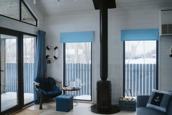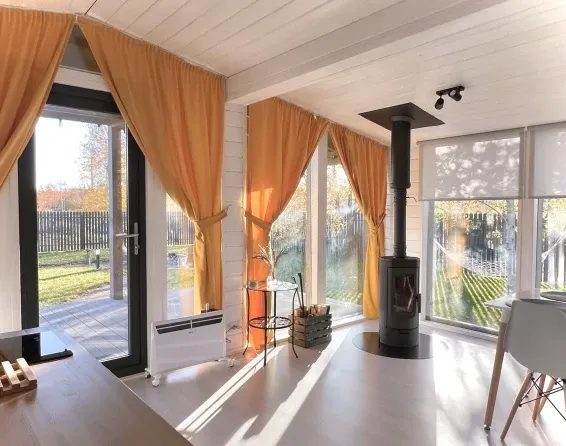 Да, в каждом коттедже есть камин с панорамным стеклом. Можно греться и сидеть с чаем и смотреть на огонь.