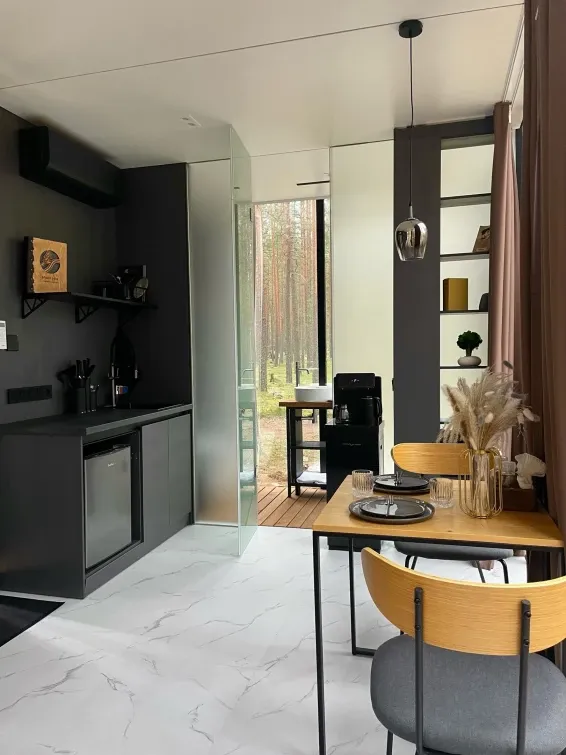 В каждой сфере есть атмосферный пеллетный камин, кондиционер, мягкие стулья у обеденного столика, два дополнительных спальных места на импровизированном втором этаже (мезанине), а в кухонной зоне чайная станция,