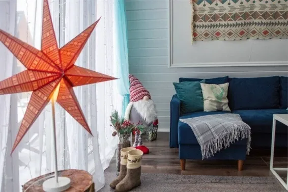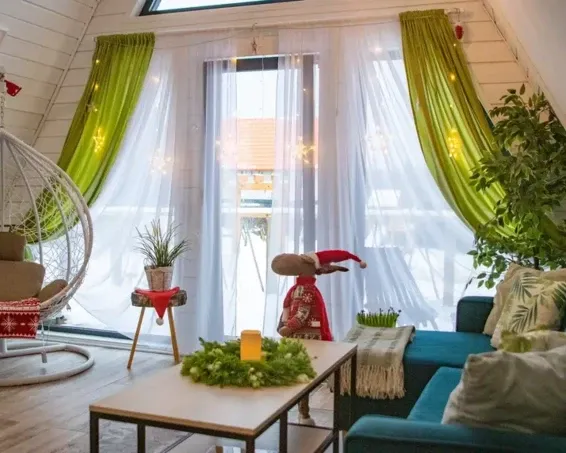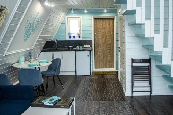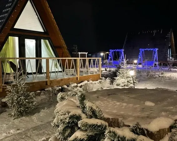 Коттедж "Зима" - новый 4-хместный дизайнерский коттедж А-frame, оформленный в бирюзовых тонах с двуспальной кроватью и раскладным диваном. Бесплатная парковка, Wi-fi, беседки для барбекю.