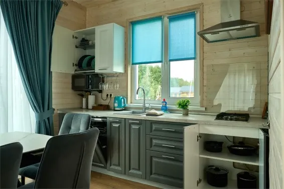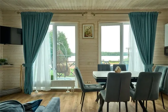 Двухэтажный коттедж с двумя спальнями и полноценной кухней на первом этаже, с видом на озеро и с большой террасой с выходом из кухни