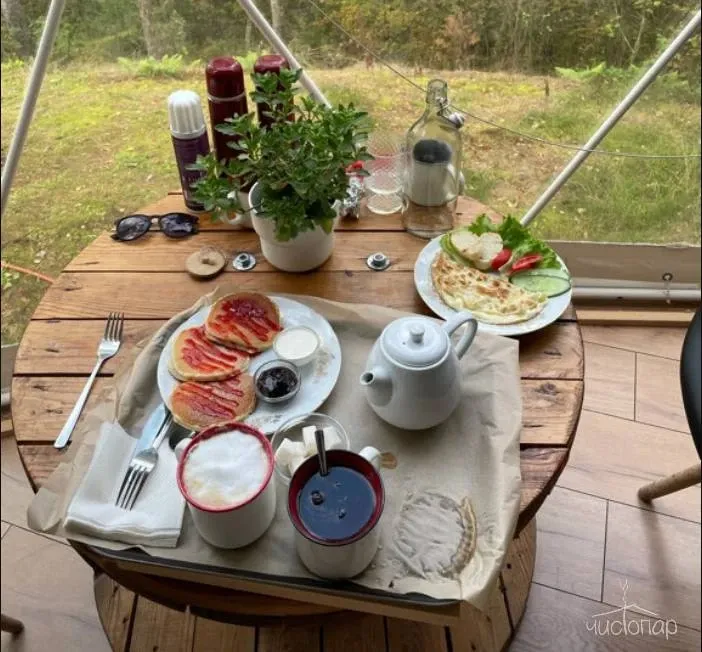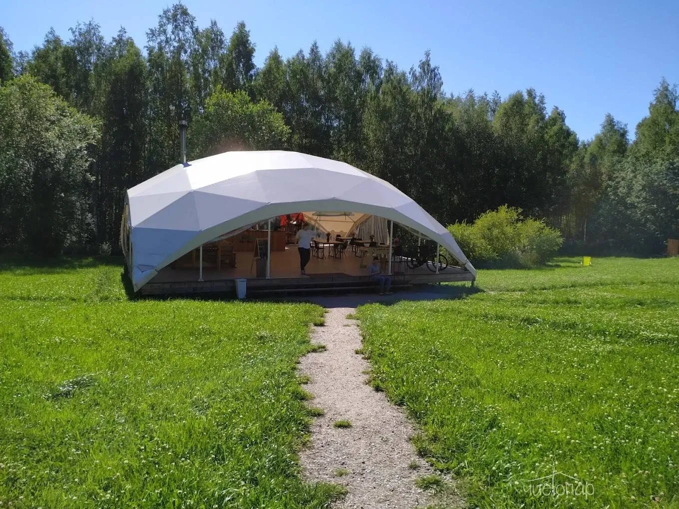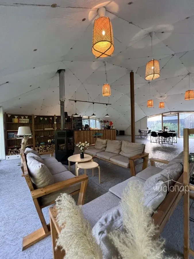 В большом центральном шатре расположен ресепшн, гастробар, где каждый день готовят блюда от шеф-повара, место для отдыха у камина с настольными играми, а также проектор для вечерних киносеансов или презентаций.
