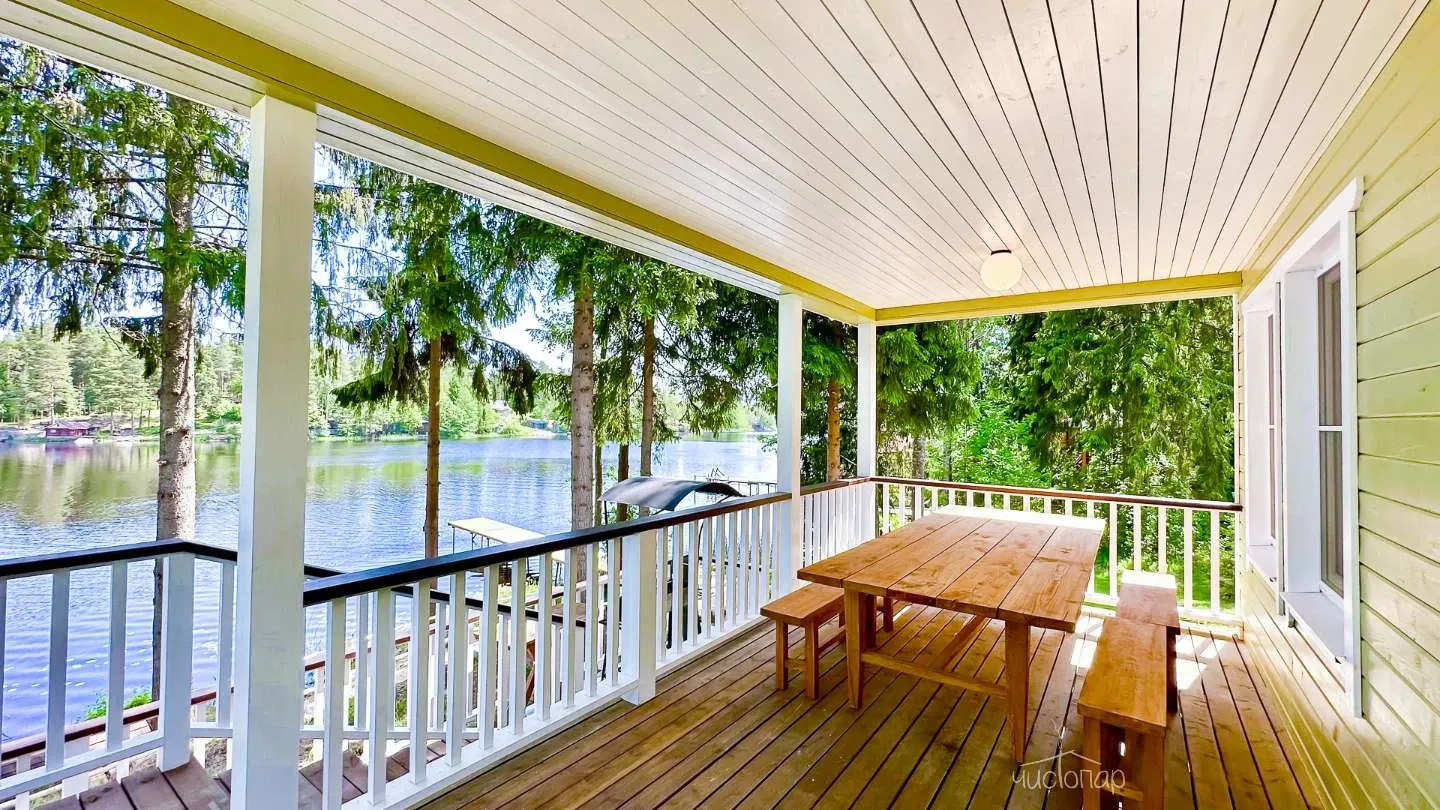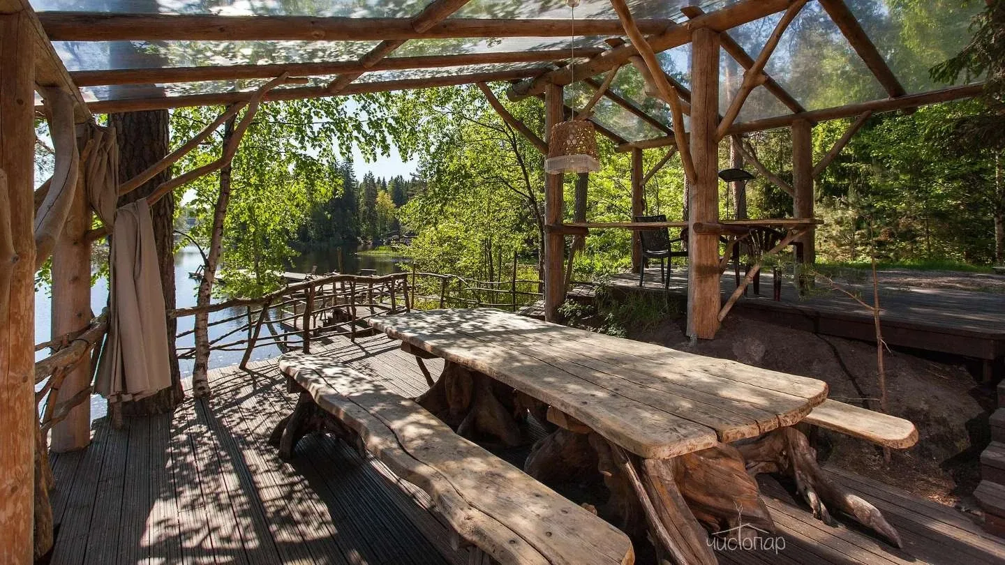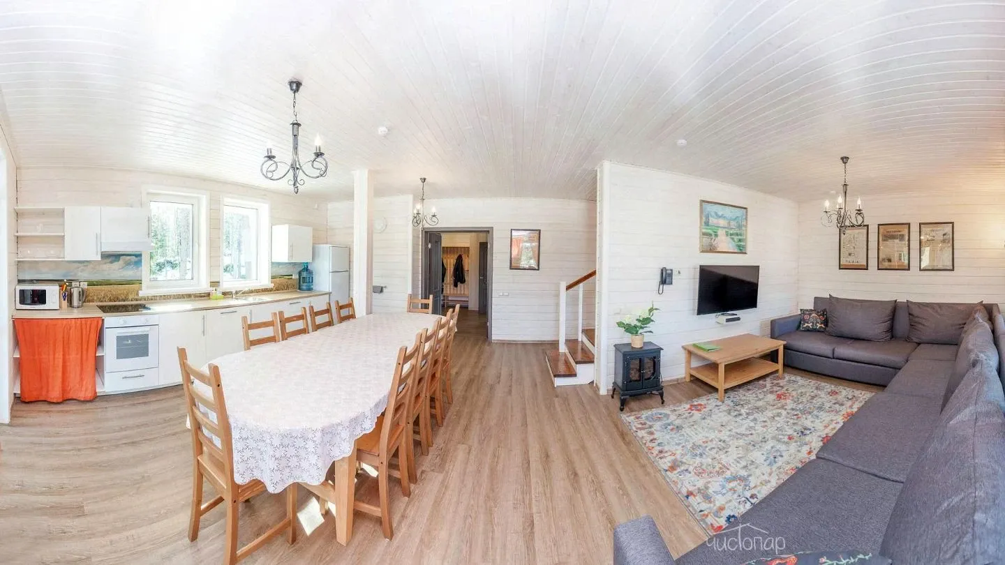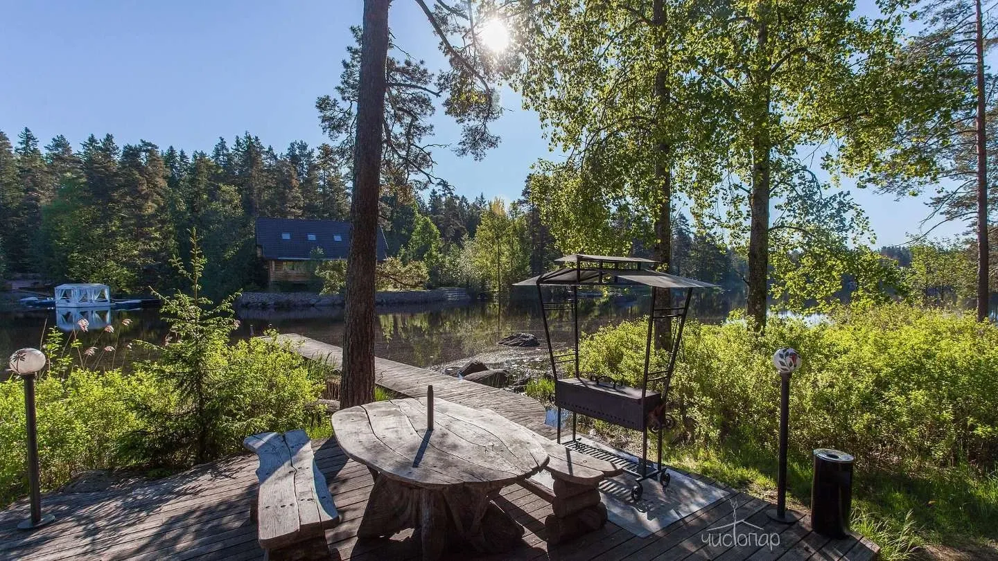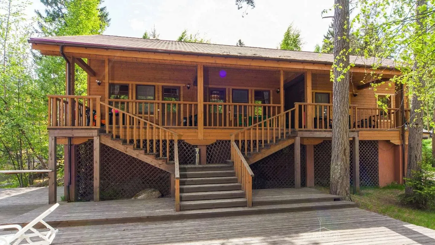 Двухэтажная вилла с пятью спальнями и сауной. Зона барбекю с изумительным видом на озеро. Просторная кухня-гостиная с обеденным столом на 12 человек и огромным диваном. Прямо из гостиной можно попасть на открытую террасу со столом и лавками.