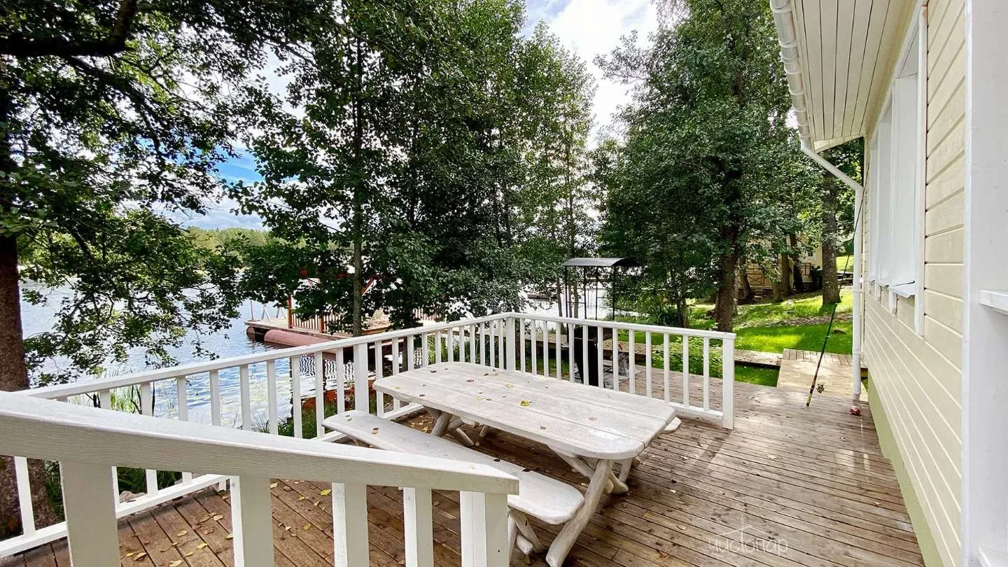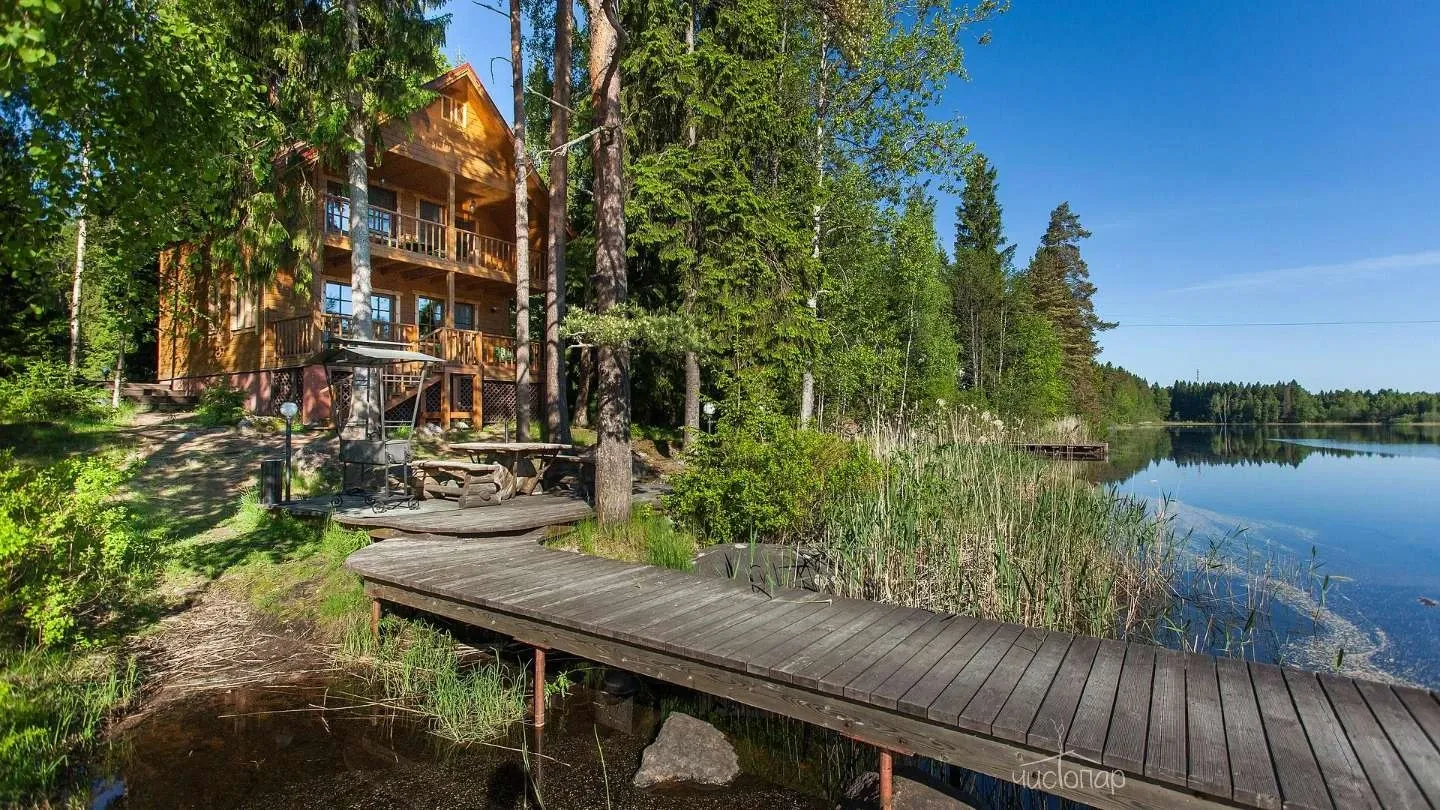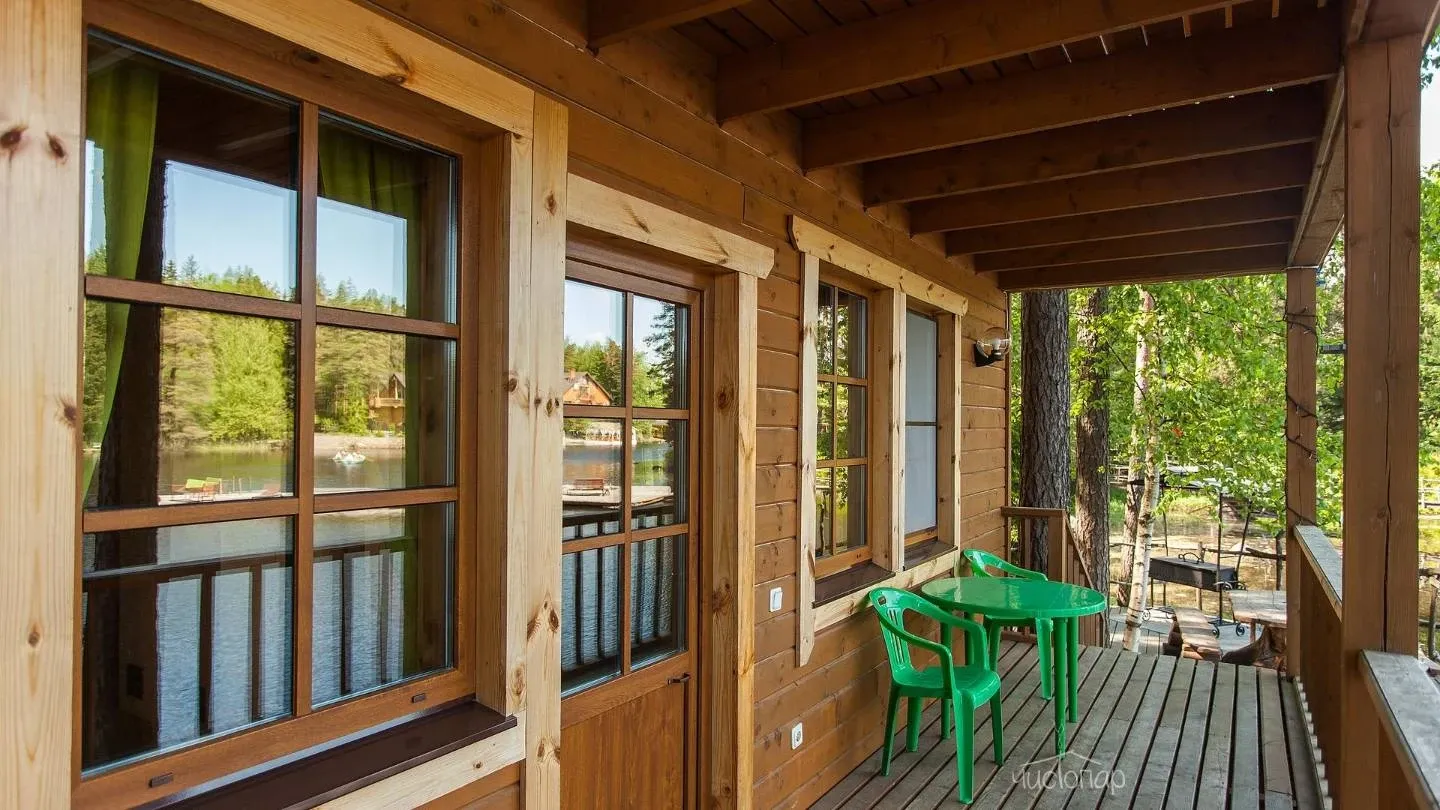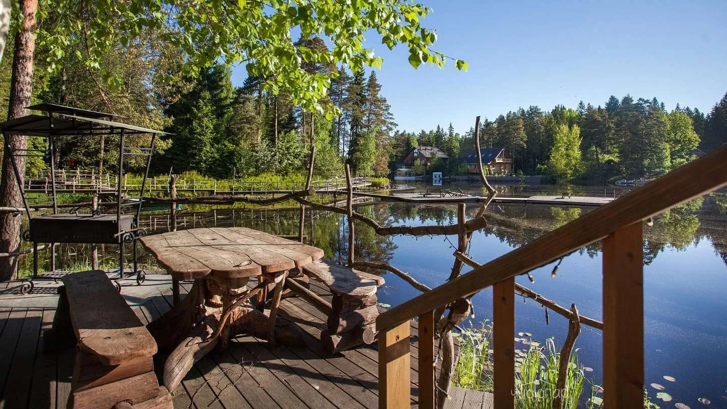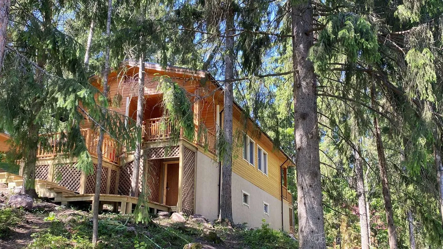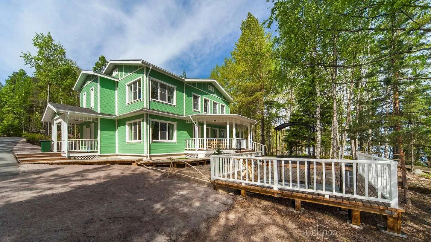 Двухэтажная вилла с пятью спальнями и сауной. Зона барбекю с изумительным видом на озеро. Просторная кухня-гостиная с обеденным столом на 12 человек и огромным диваном. Прямо из гостиной можно попасть на открытую террасу со столом и лавками.