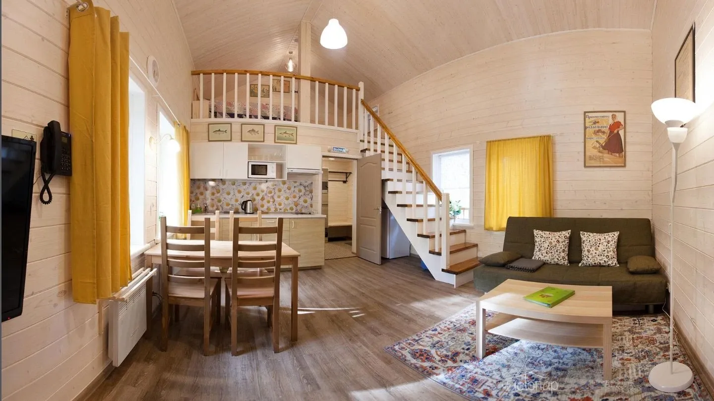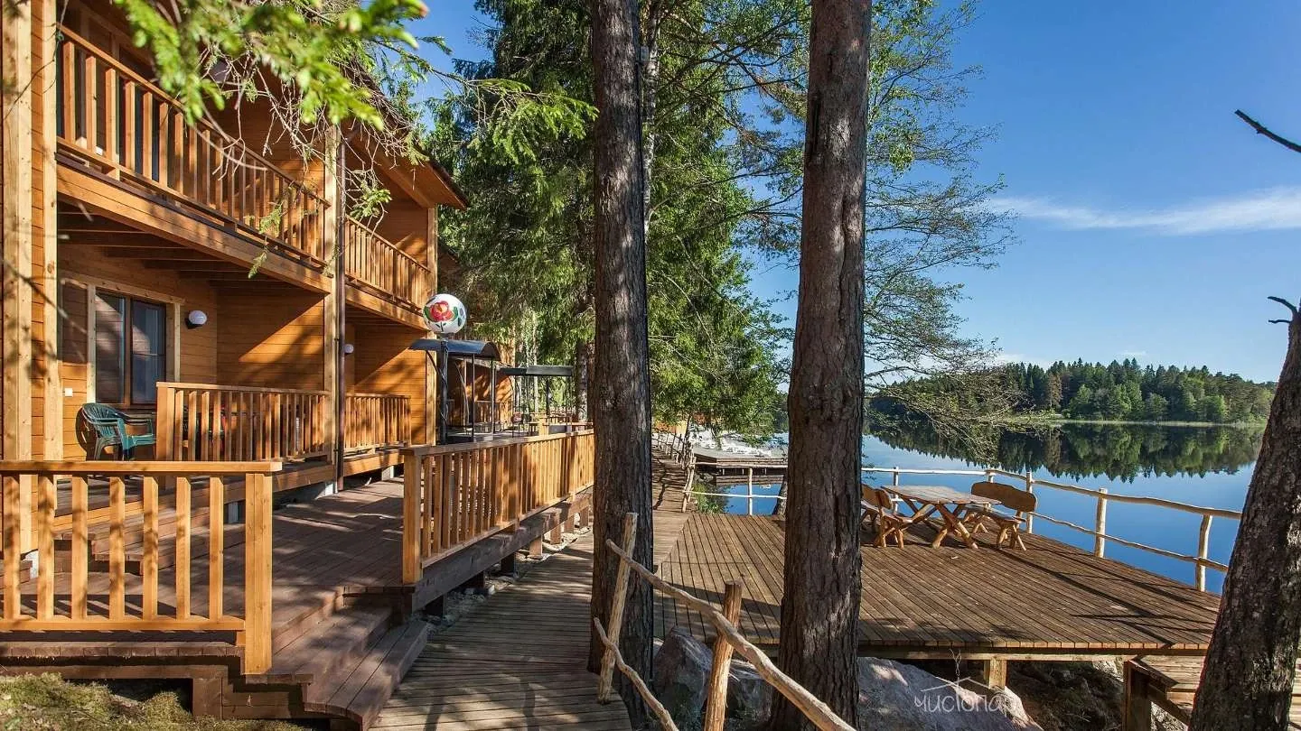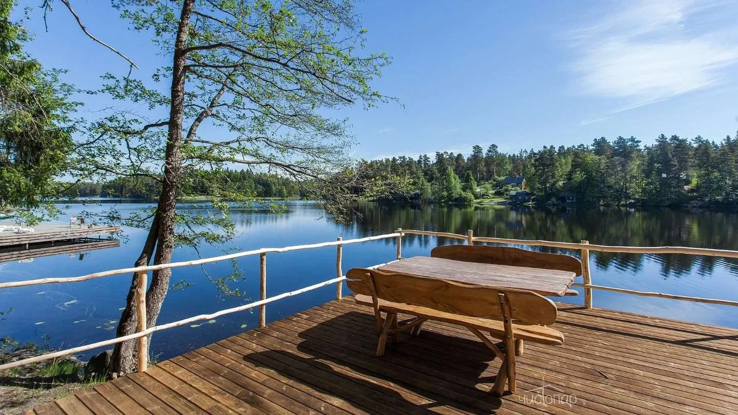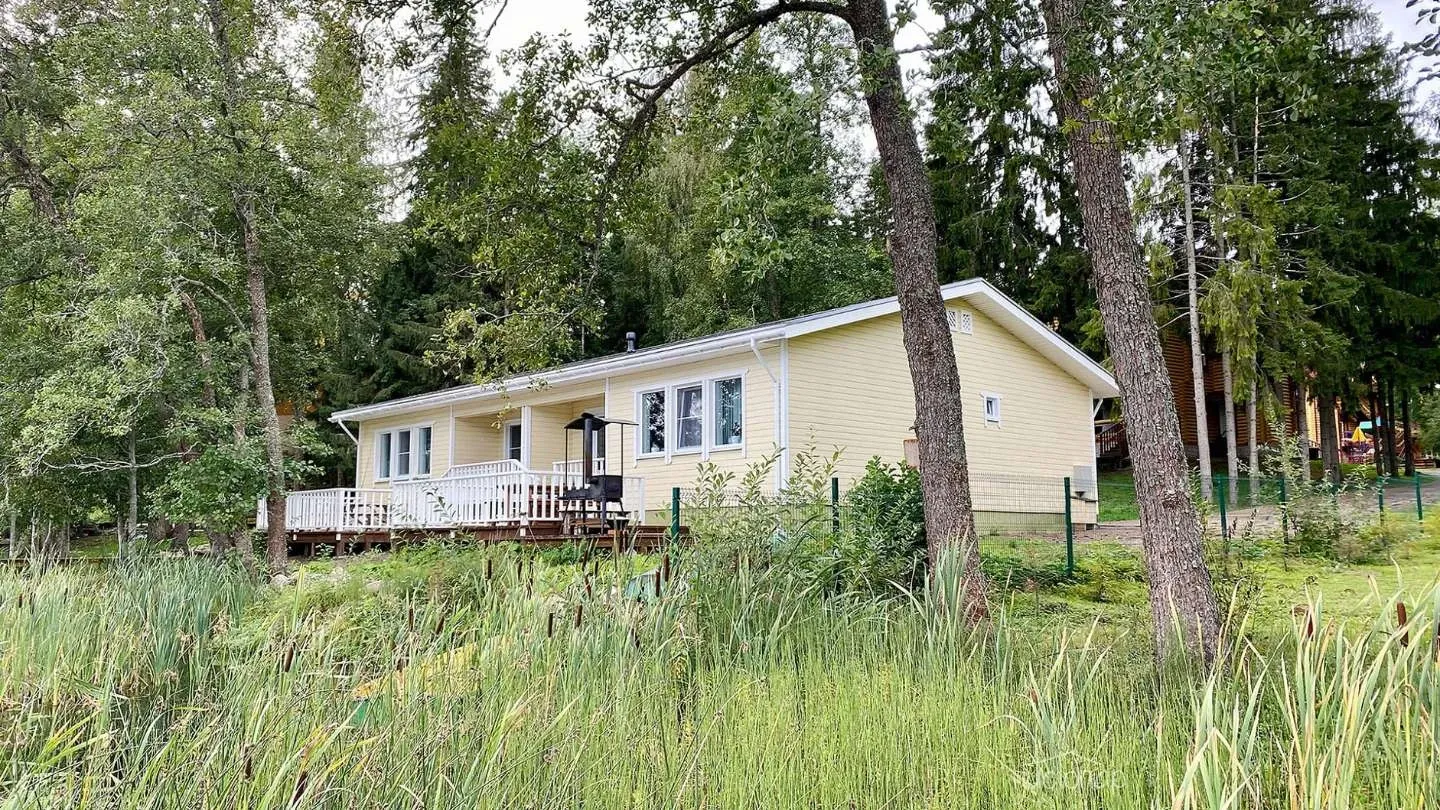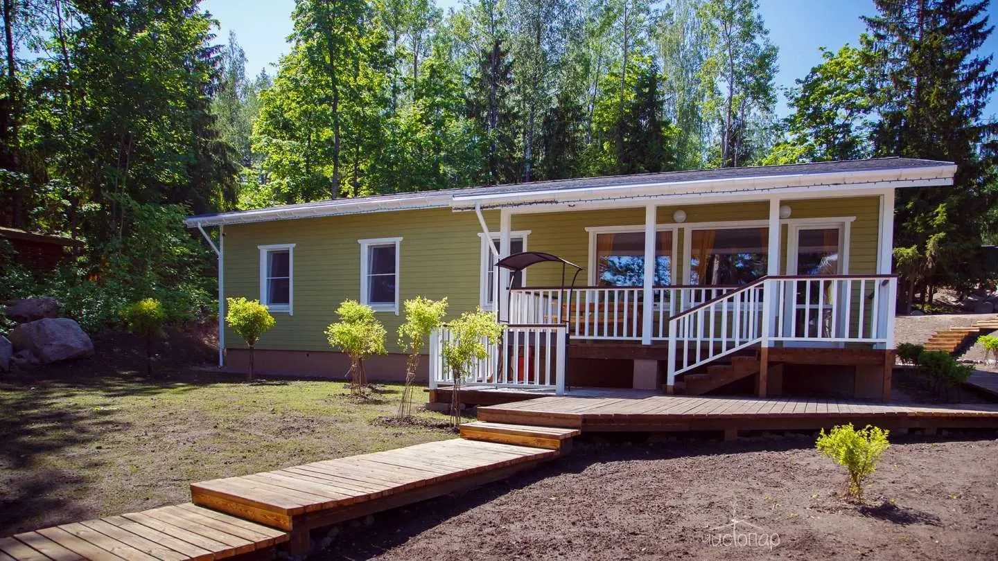 Двухэтажная вилла с пятью спальнями и сауной. Зона барбекю с изумительным видом на озеро. Просторная кухня-гостиная с обеденным столом на 12 человек и огромным диваном. Прямо из гостиной можно попасть на открытую террасу со столом и лавками.