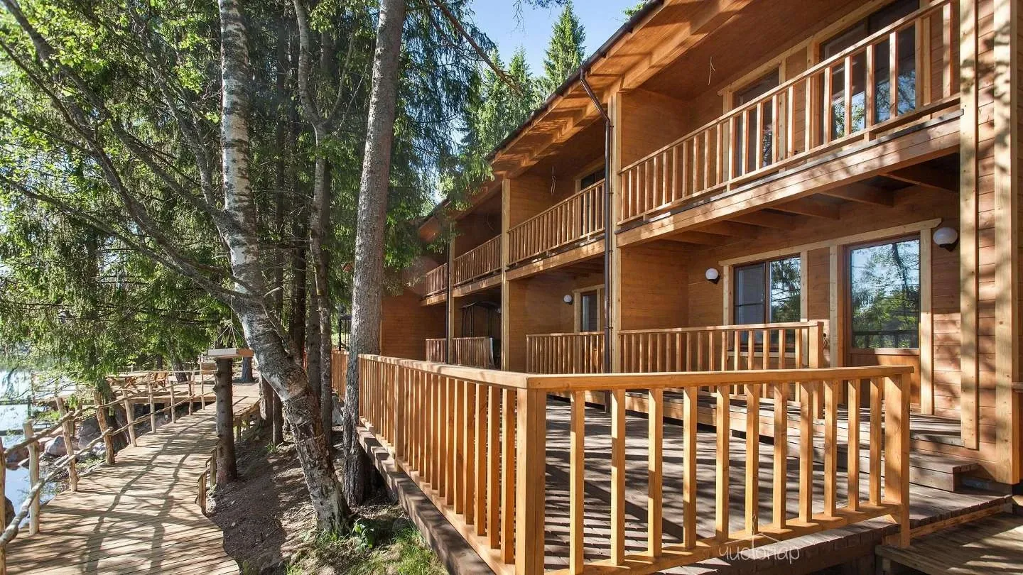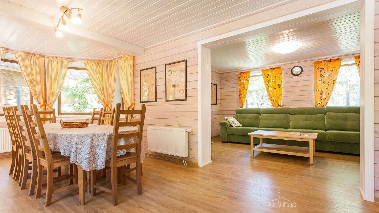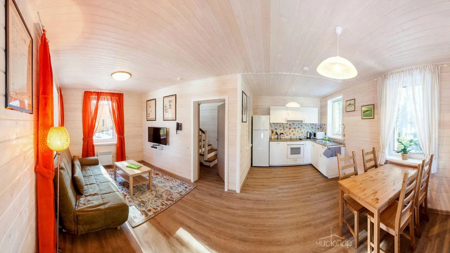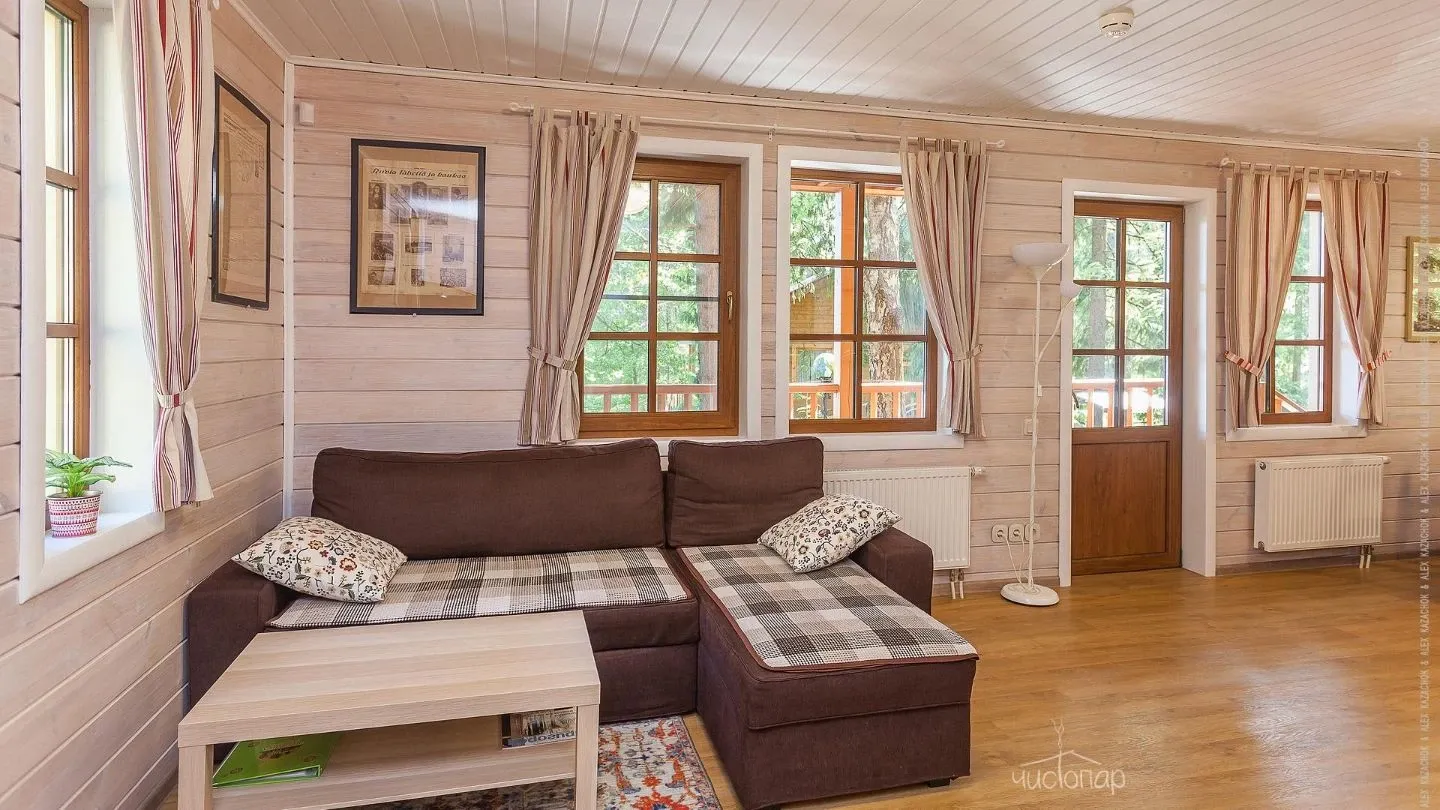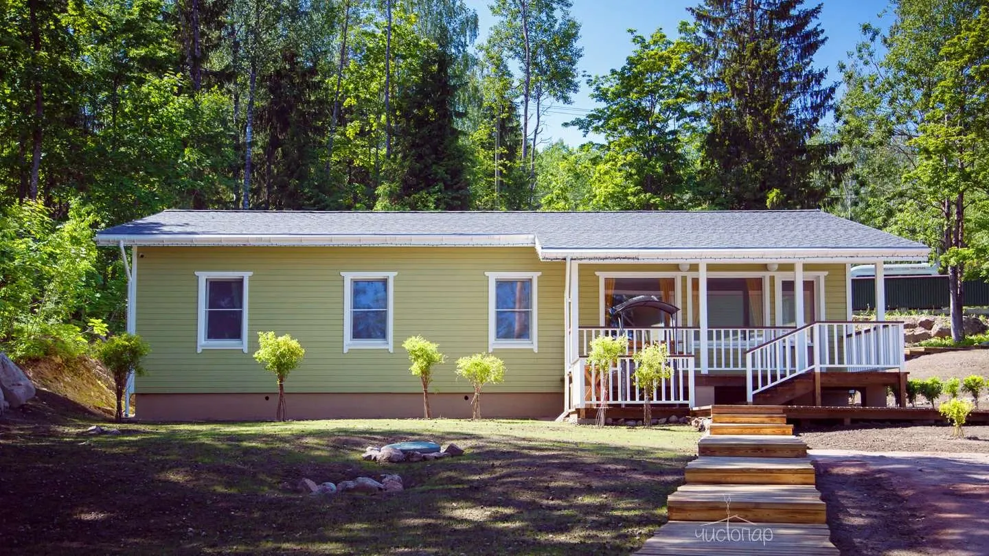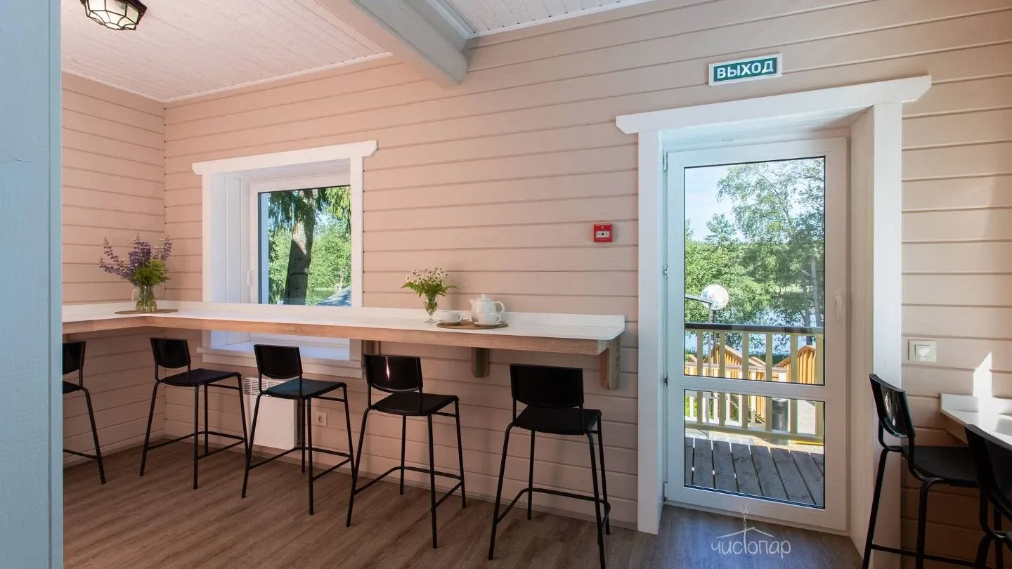 Двухэтажная вилла с пятью спальнями и сауной. Зона барбекю с изумительным видом на озеро. Просторная кухня-гостиная с обеденным столом на 12 человек и огромным диваном. Прямо из гостиной можно попасть на открытую террасу со столом и лавками.