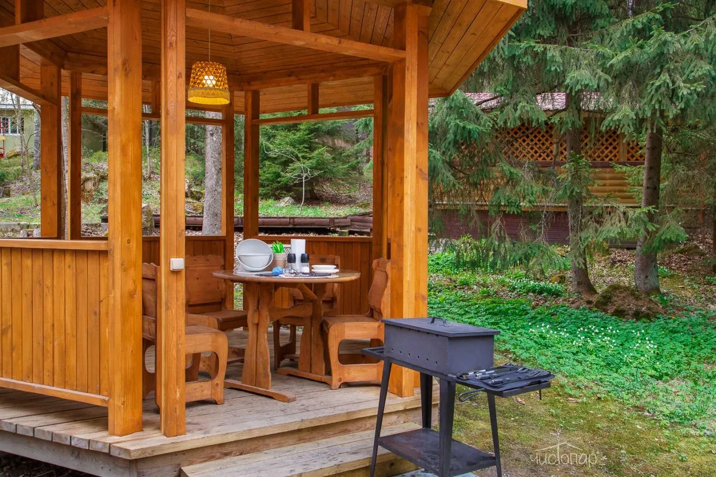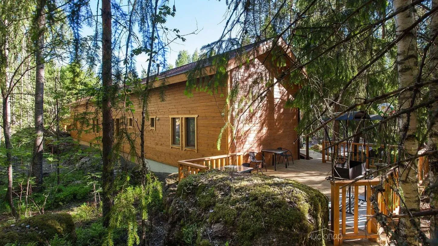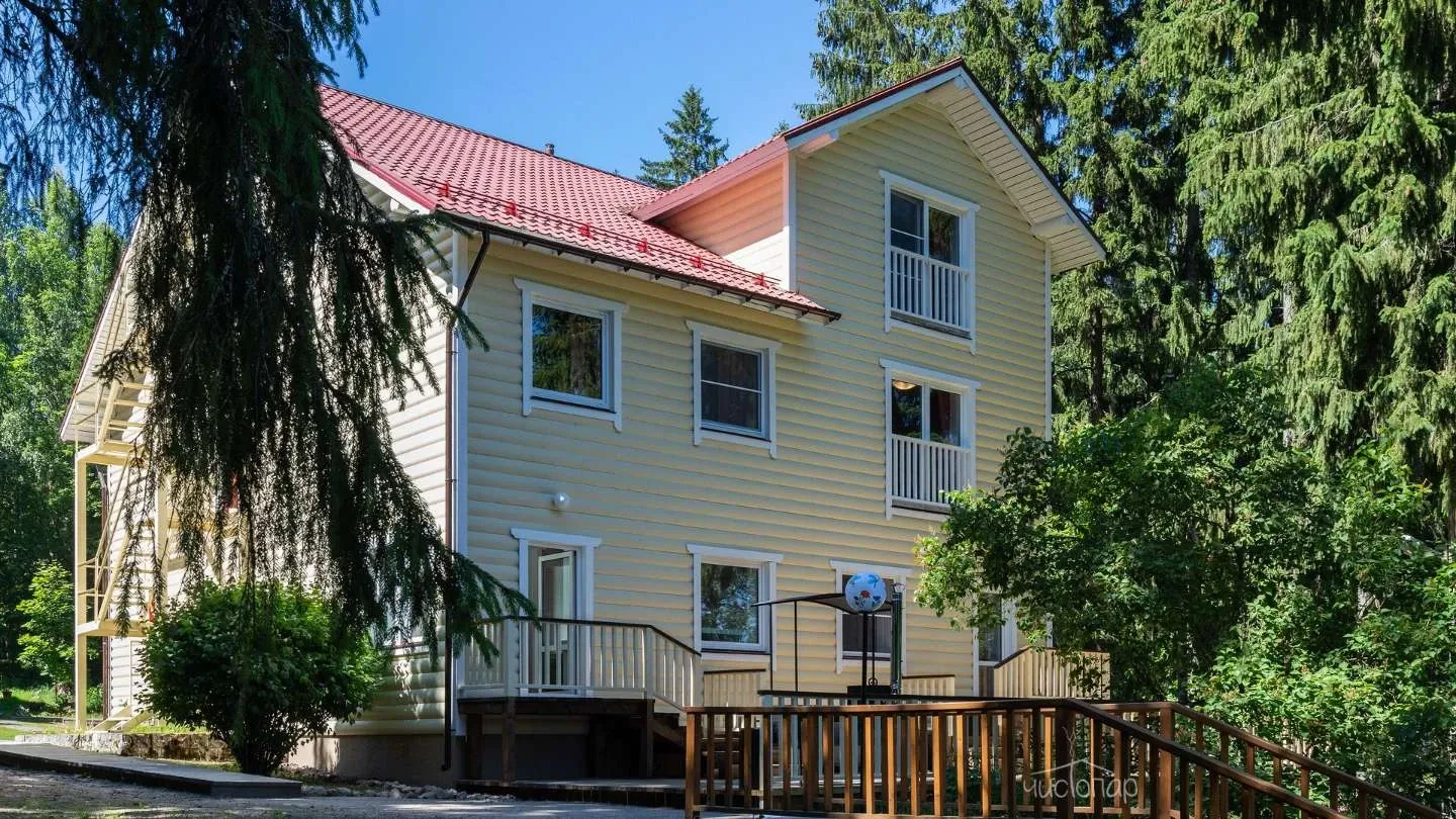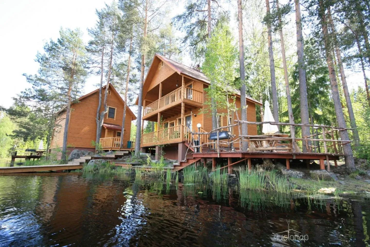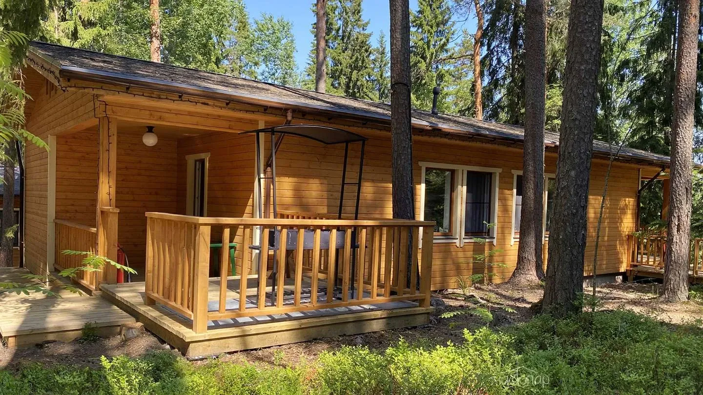 Двухэтажная вилла с пятью спальнями и сауной. Зона барбекю с изумительным видом на озеро. Просторная кухня-гостиная с обеденным столом на 12 человек и огромным диваном. Прямо из гостиной можно попасть на открытую террасу со столом и лавками.