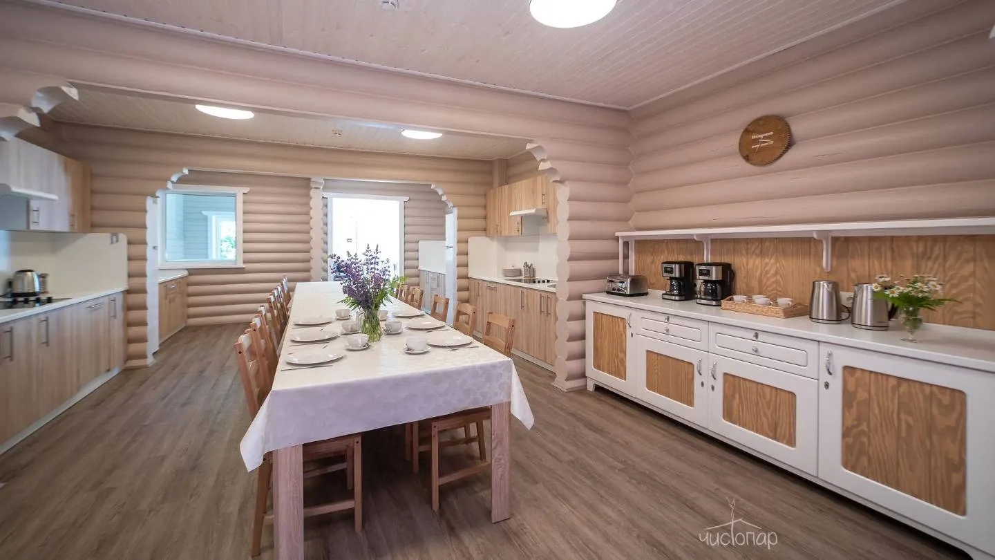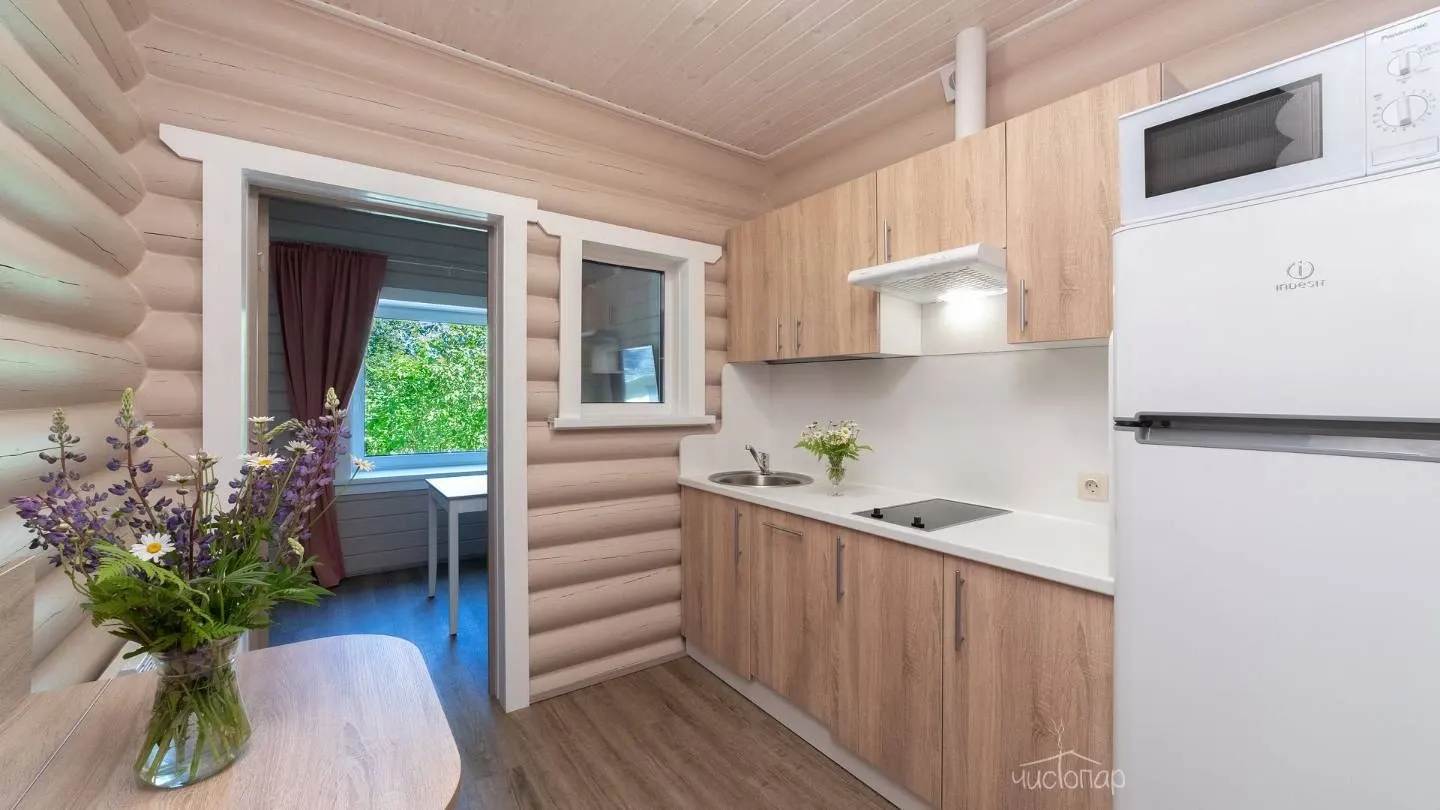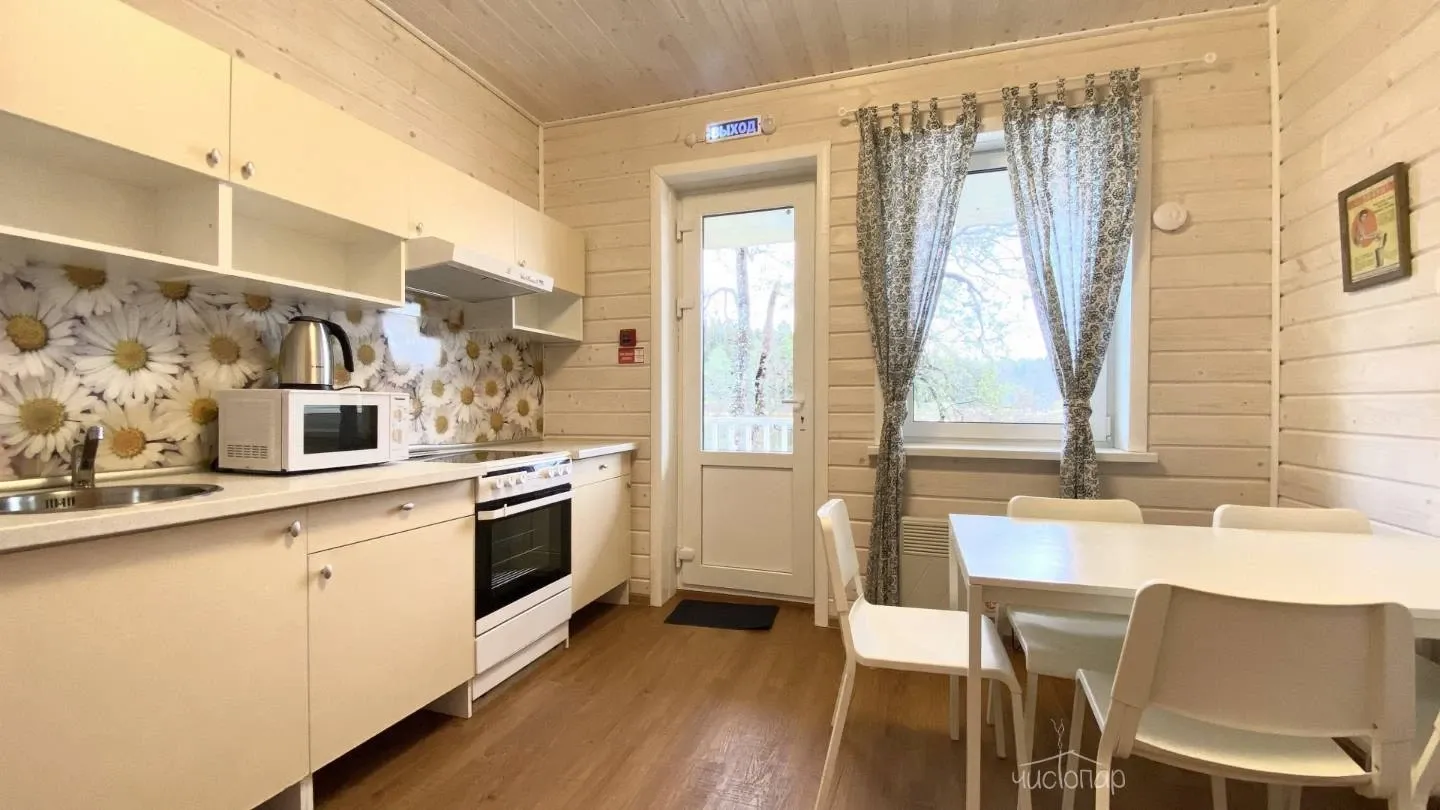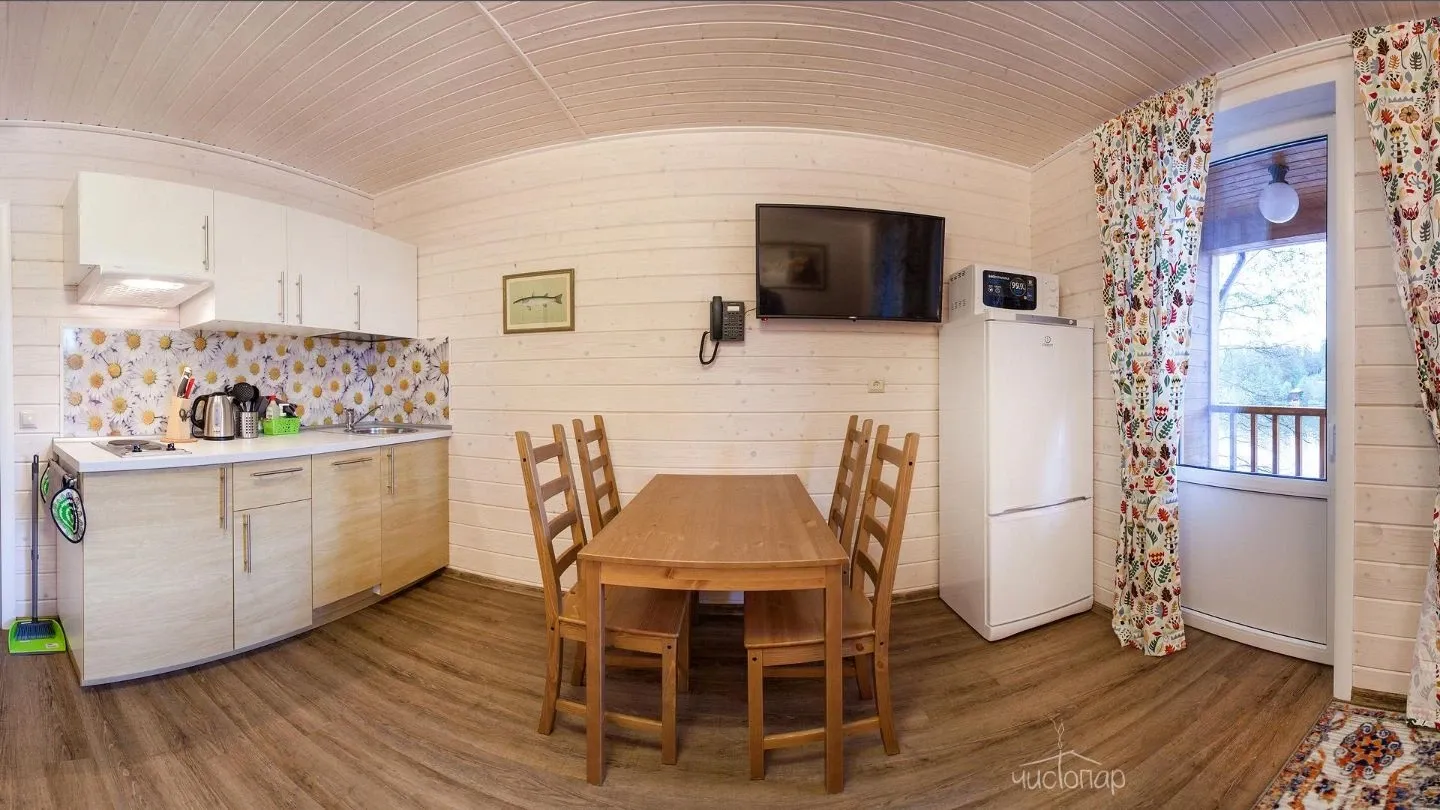 •	Кухня-столовая, оборудованная варочной панелью, электродуховкой, микроволновой печью, посудомоечной машиной, холодильником, электрочайником, кухонной посудой, комплектом столовой посуды на 12 персон.
