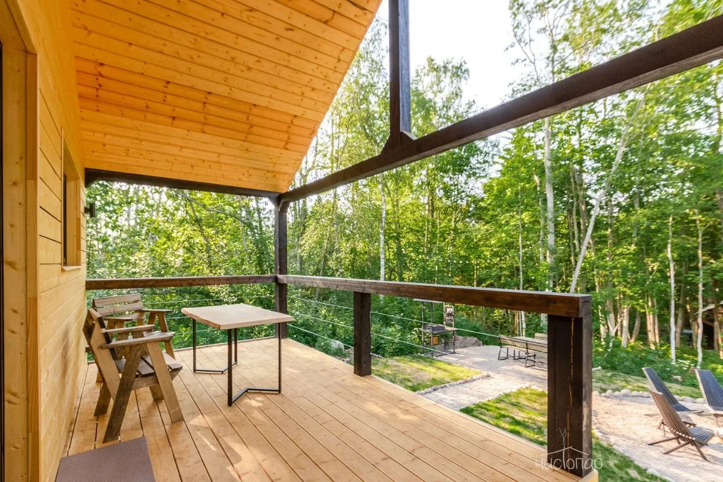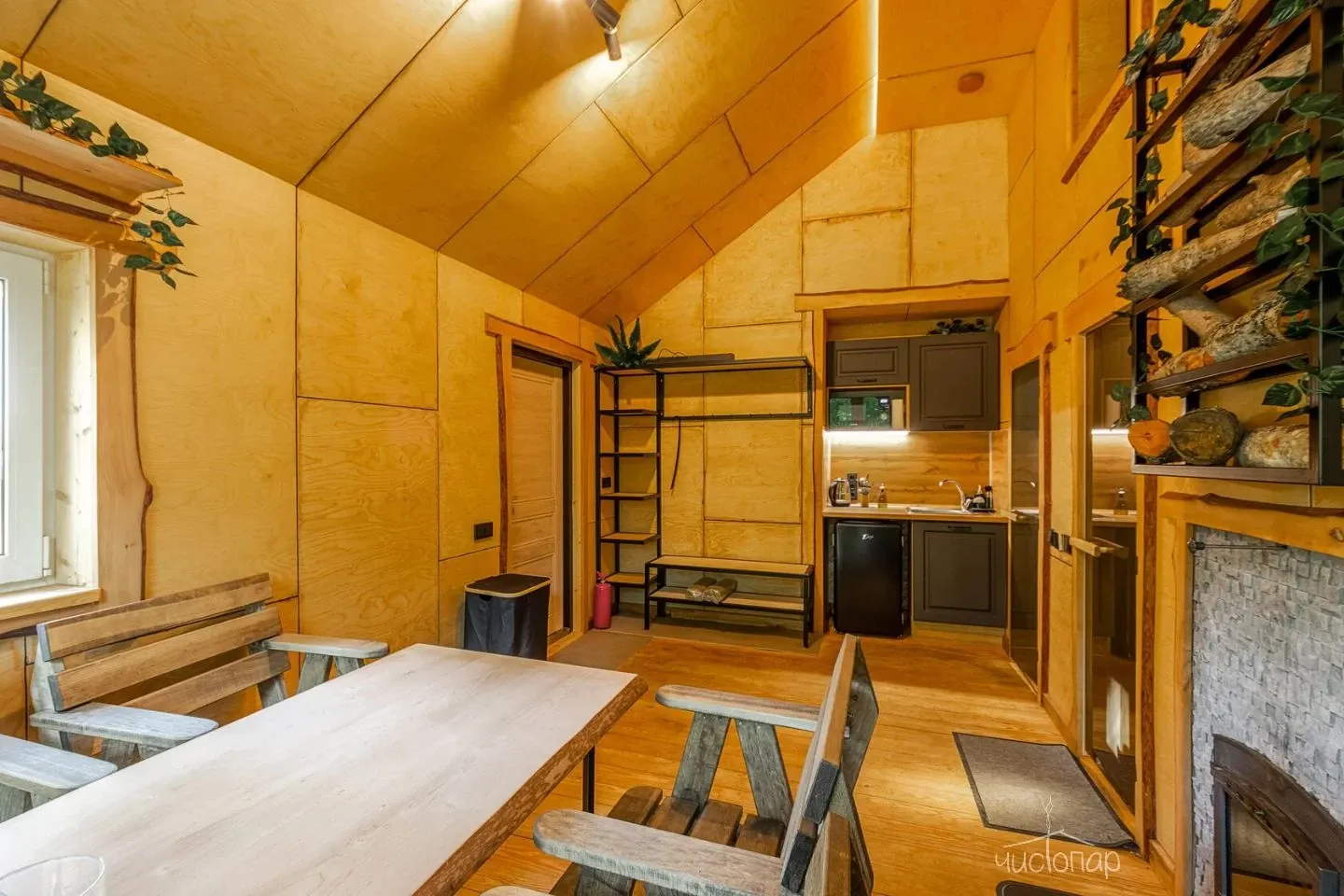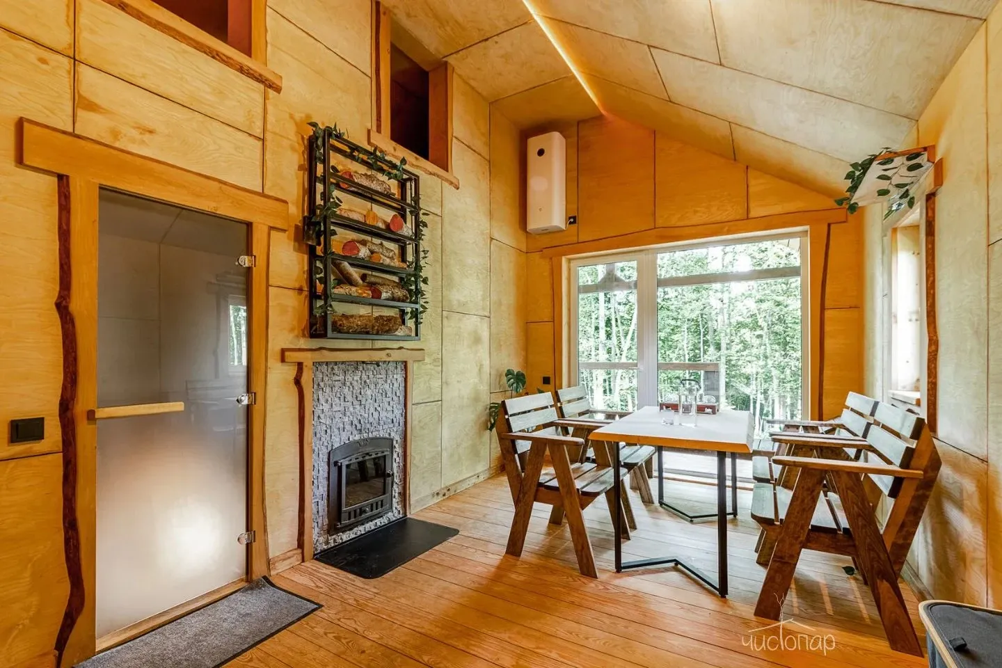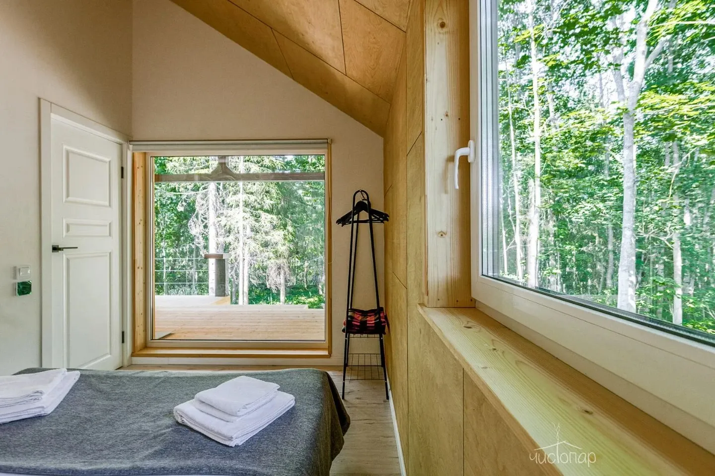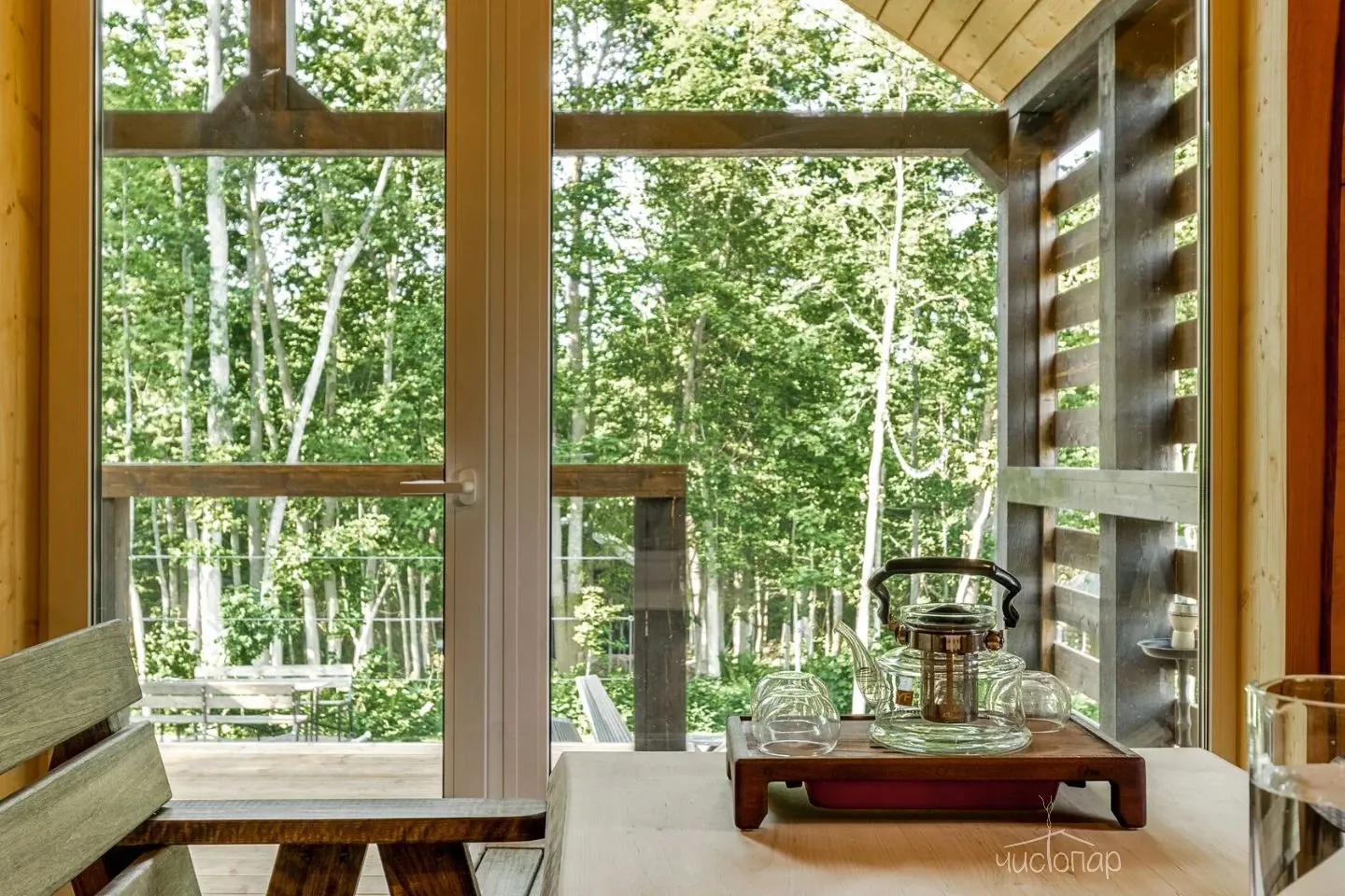 Каждый дом располагает крытой террасой с прекрасным видом на лес, оборудованной зоной для времяпровождения у костра и мангальной площадкой, где можно приготовить шашлык и другие любимые блюда. Внутри гостей ждут светлые комнаты с огромным окнами, современной мебелью и техникой. В оформлении интерьера преобладает древесина.