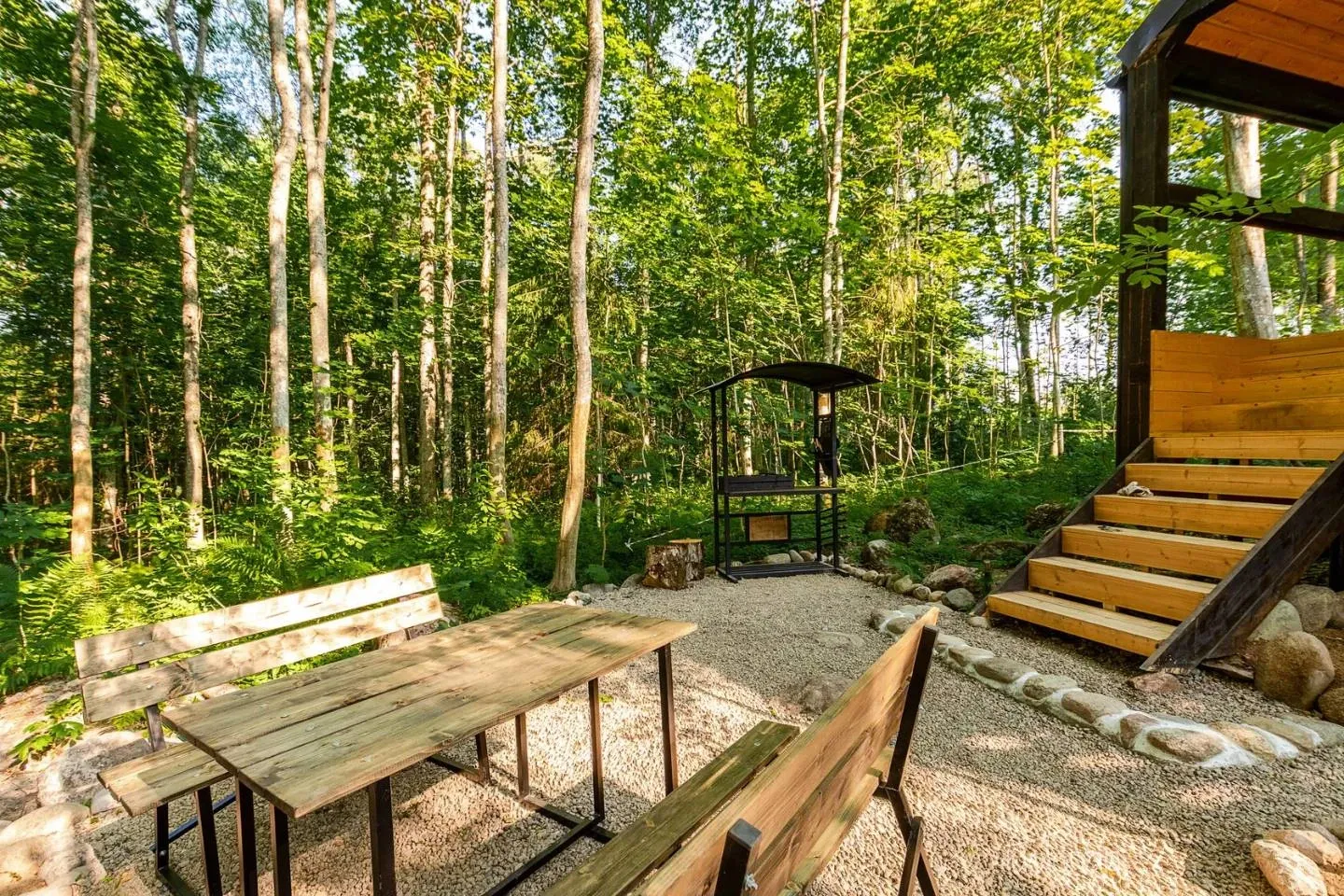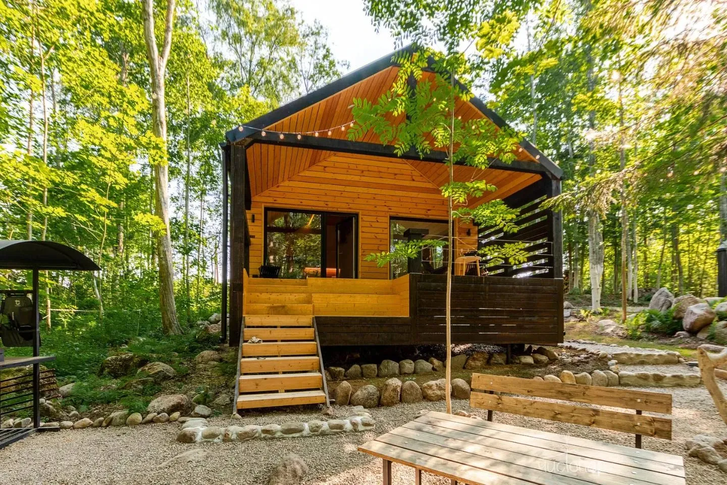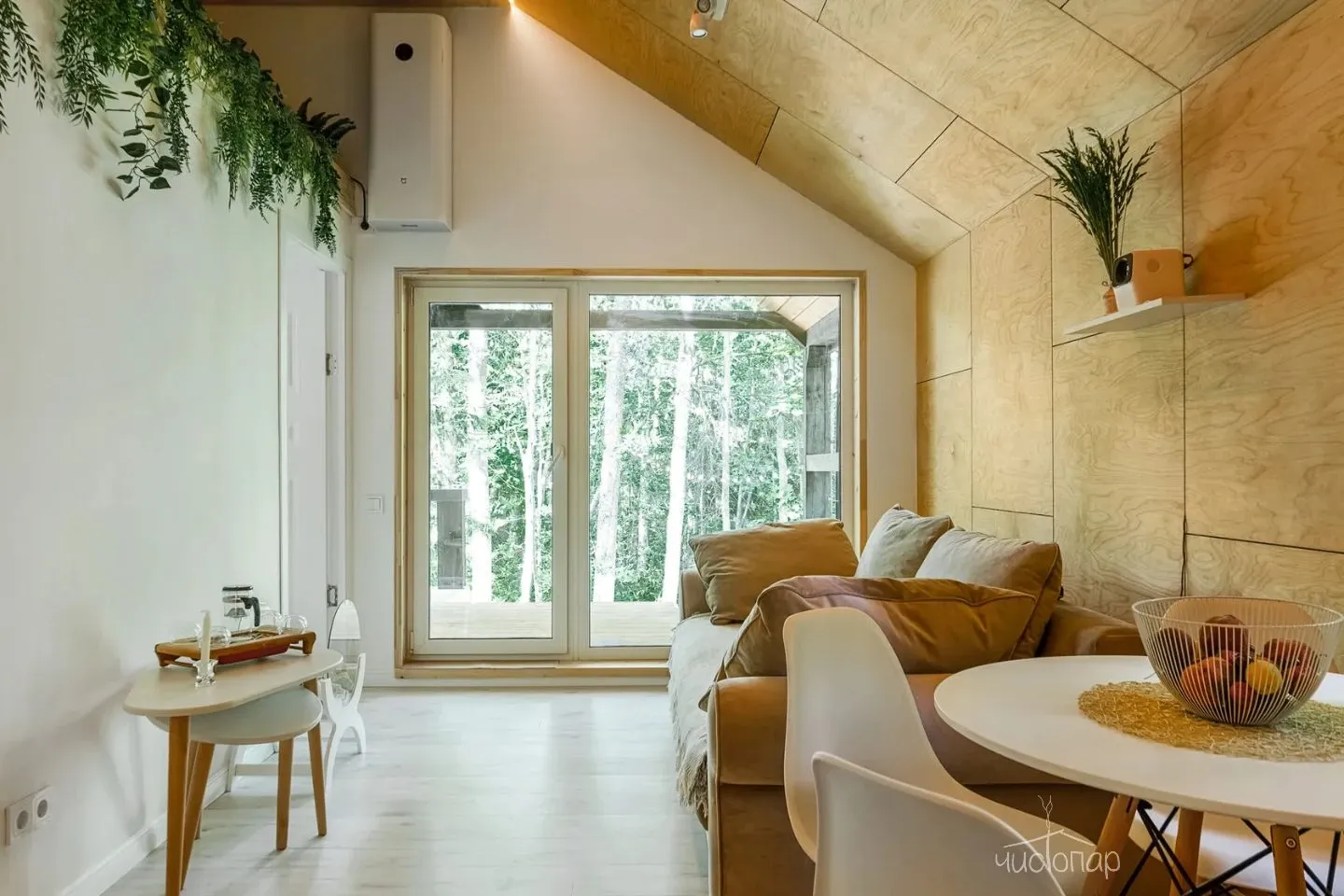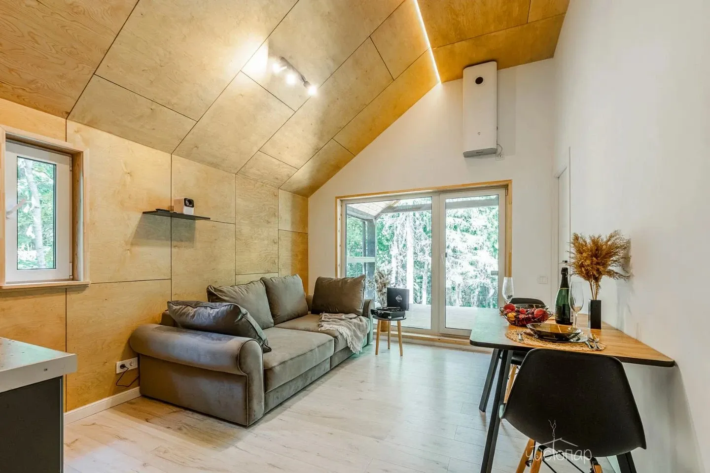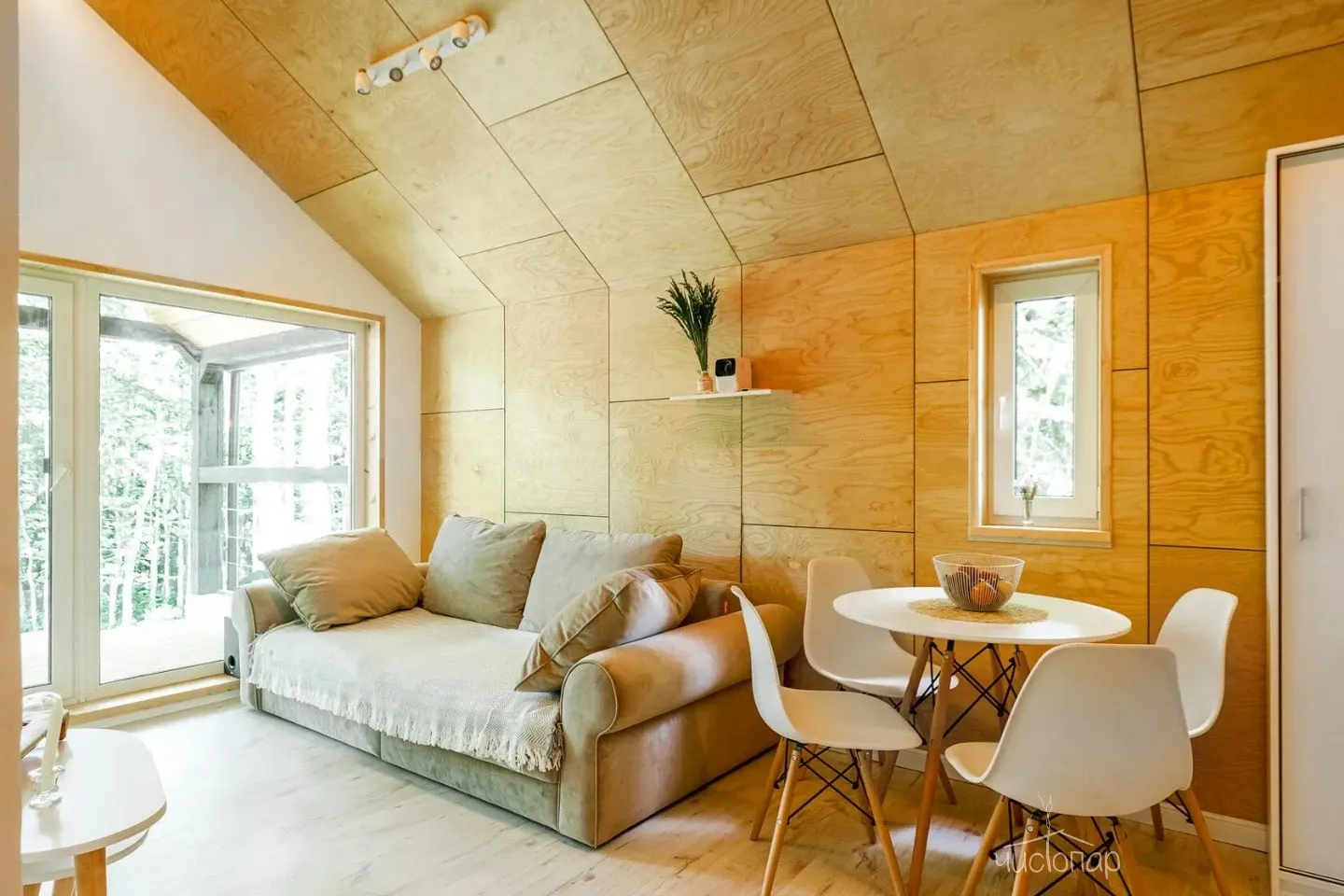 Каждый дом располагает крытой террасой с прекрасным видом на лес, оборудованной зоной для времяпровождения у костра и мангальной площадкой, где можно приготовить шашлык и другие любимые блюда. Внутри гостей ждут светлые комнаты с огромным окнами, современной мебелью и техникой. В оформлении интерьера преобладает древесина.