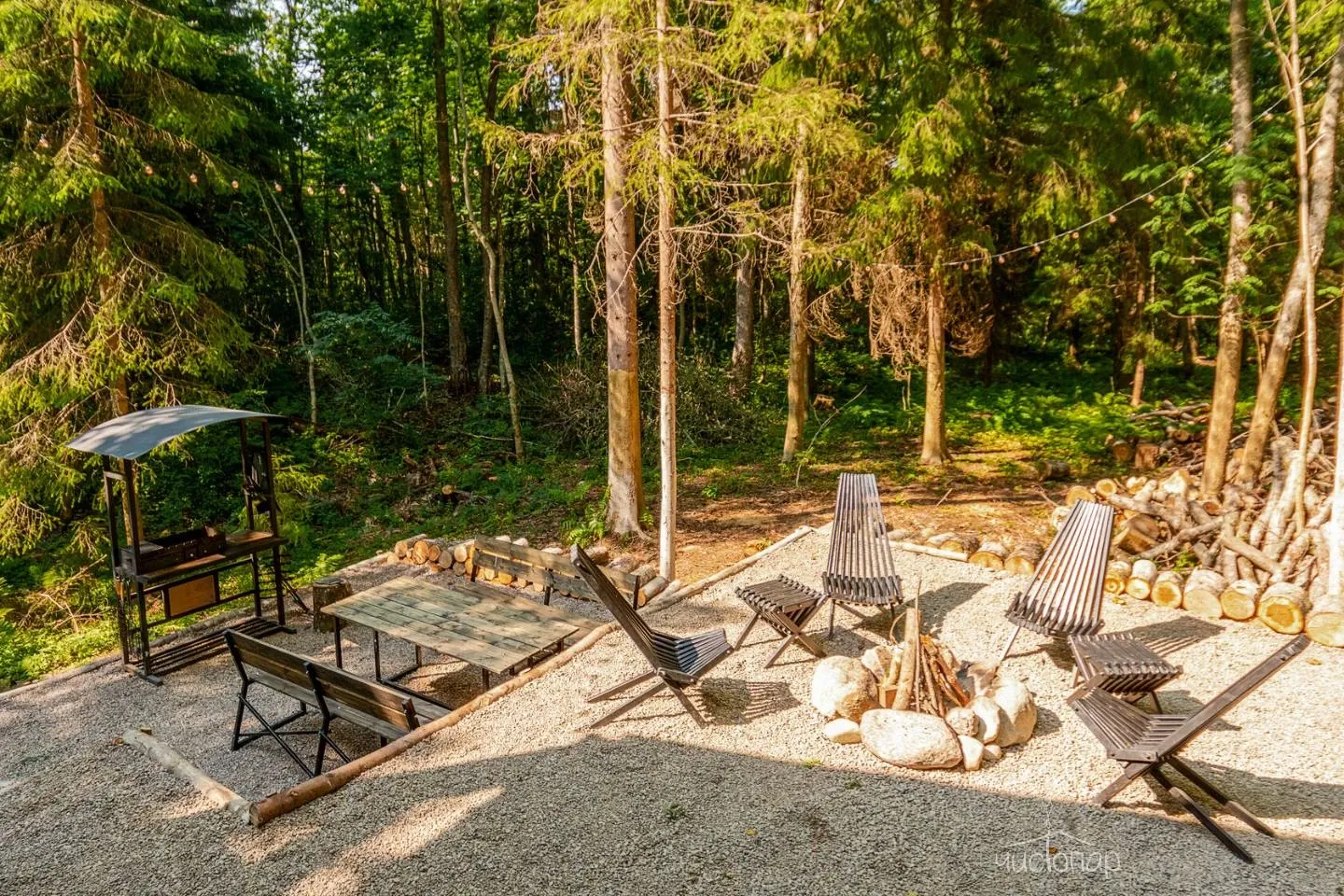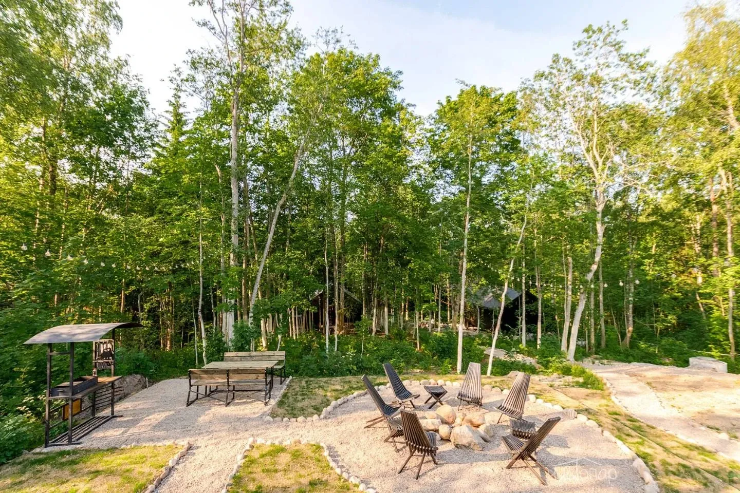 Дом расположен в окружении высоких деревьев. Из панорамных окон открывается прекрасный вид на дикий лес. Крытая терраса 18 м2. У дома располагается костровая зона с кострищем и креслами, мангал с навесом.