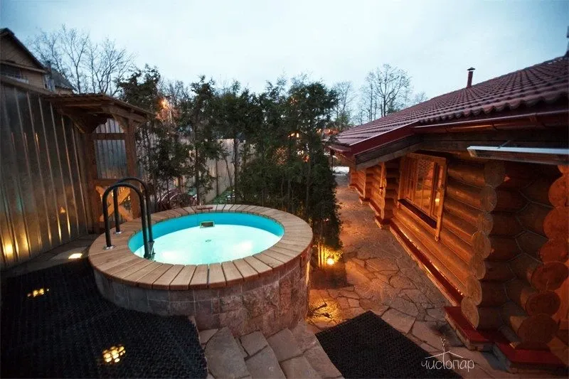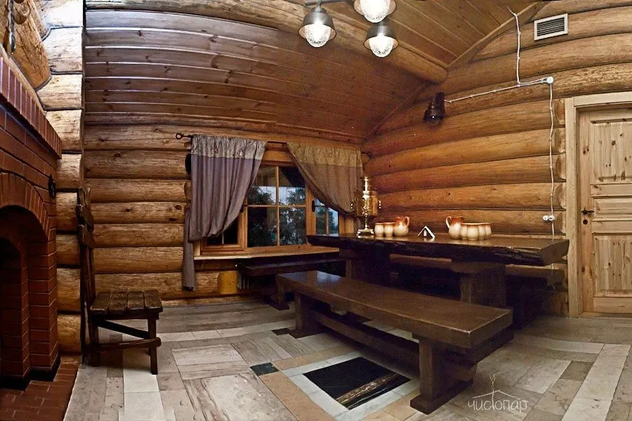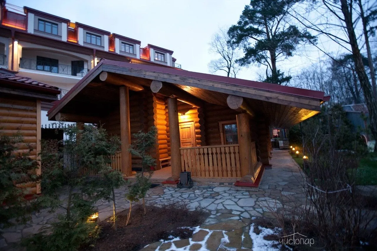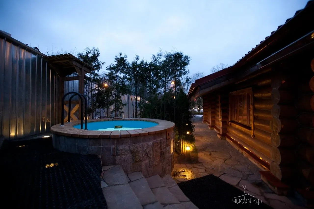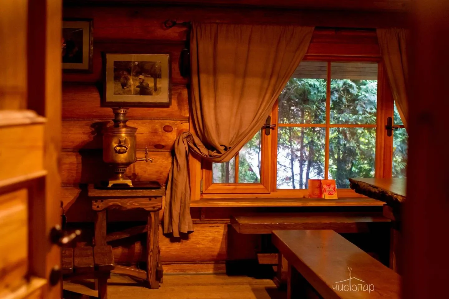Для отдыха гостей предназначен бревенчатый коттедж, сливающийся с окружающей экосистемой. В нем имеются: сауна, оборудованная уникальной печью с особым мягким паром, незамерзающая купель с системой фильтрации, баня по-черному и душ Виши для получения более полной релаксации. Помывочное помещение оборудовано тремя душевыми кабинами, есть также обливочная кадушка и две раздевалки - для мужчин и женщин.