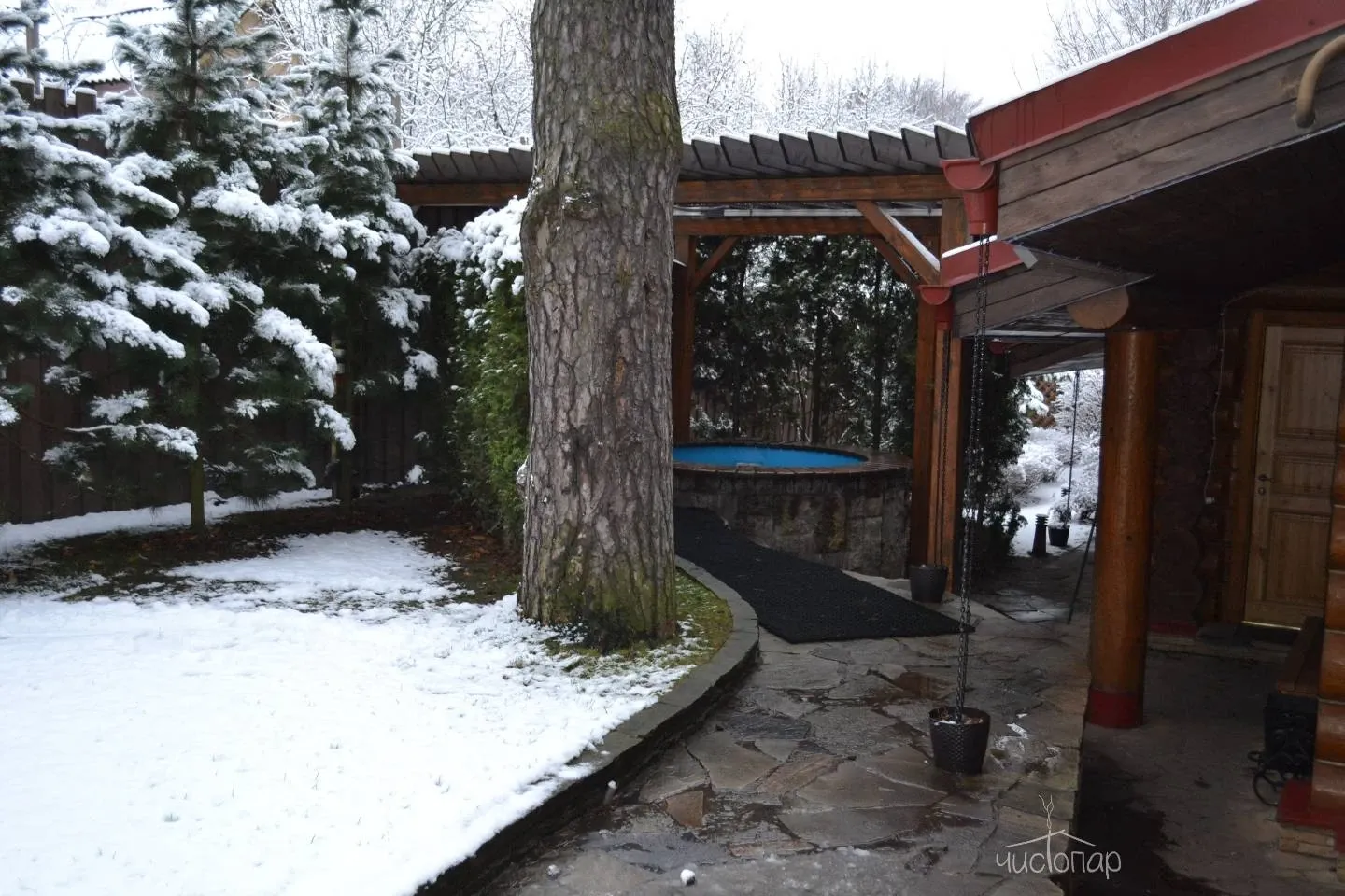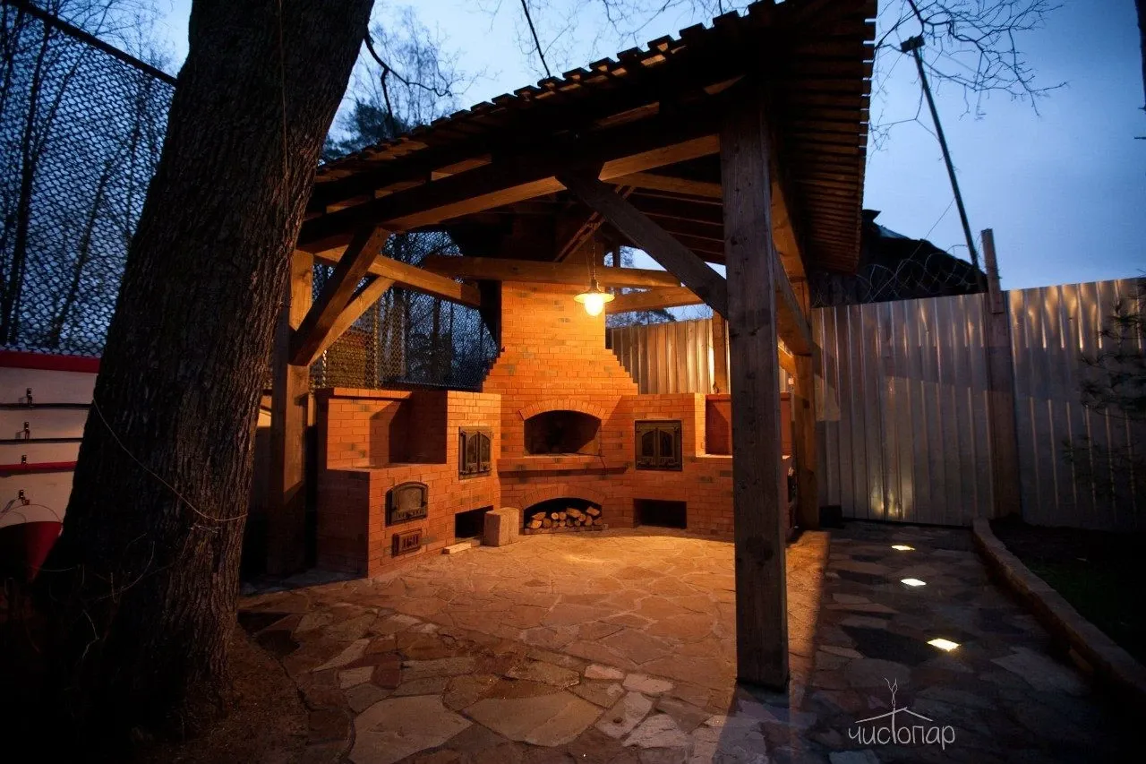 Коттедж оборудован летней кухней и круглогодичной террасой, которая обустроена тёплыми полами и обогревается газовой горелкой.
