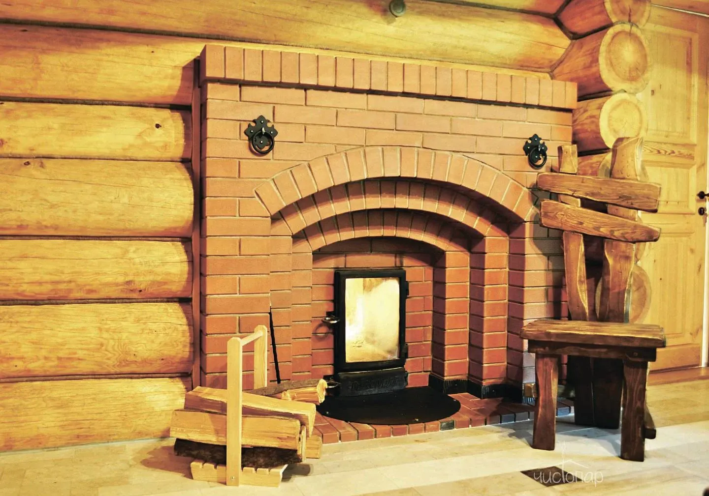 Банкетный зал с огромным столом из цельного массива краснодарского дуба, камин с живым огнём.