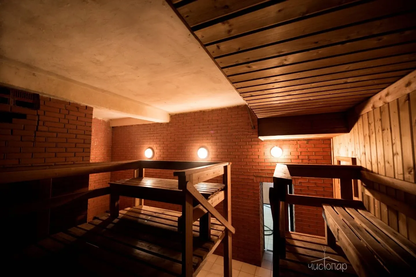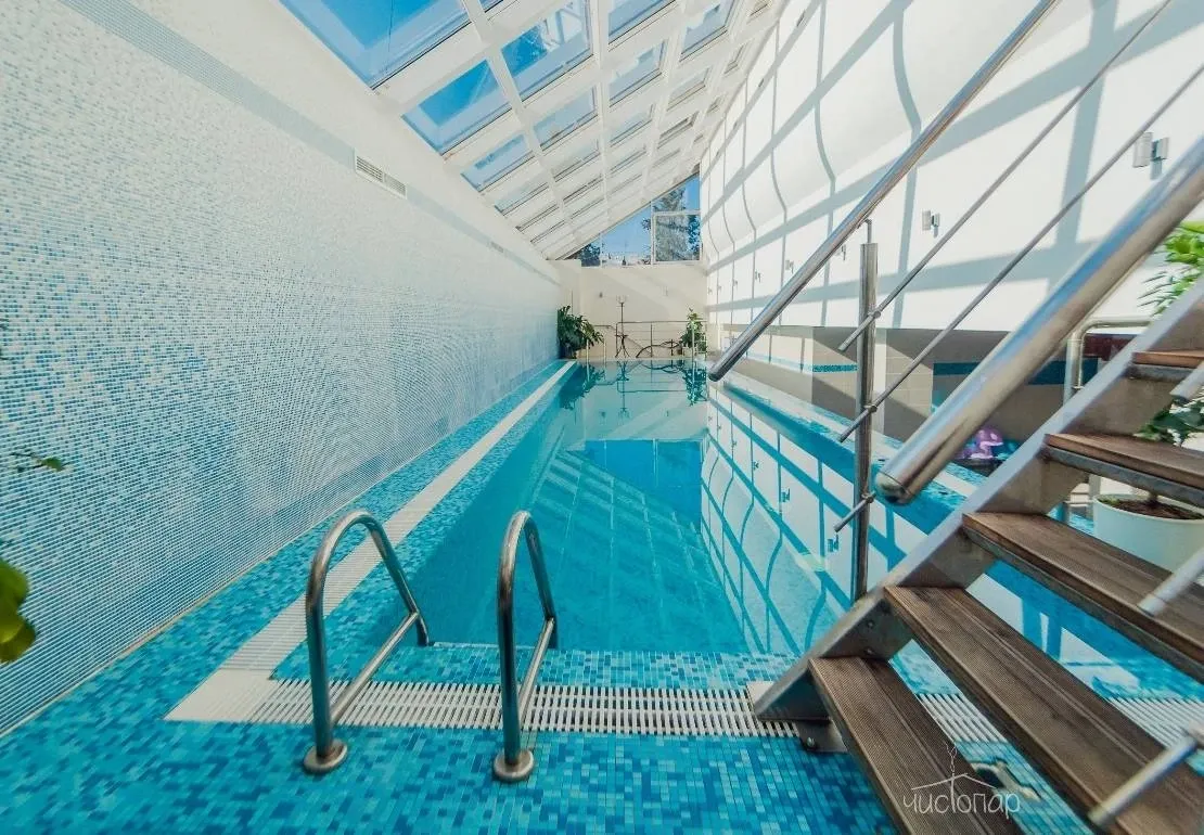 2 русские парные (одна из них на дровах), турецкая парная, бассейны на открытом воздухе и в закрытом помещении, купели с холодной водой, обливочные ведра, услуги профессиональных парильщиков, уютное кафе с ресторанным меню, большие ТВ панели.