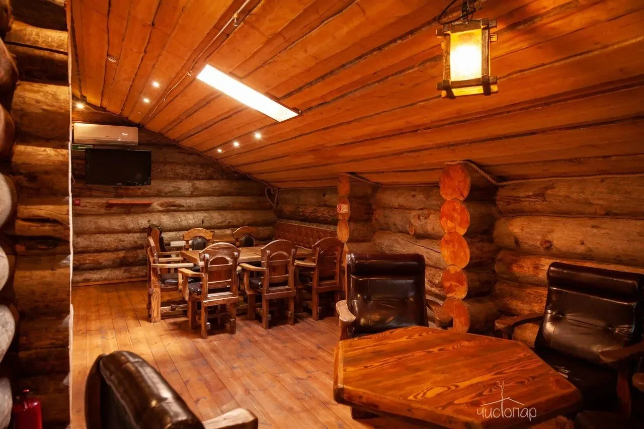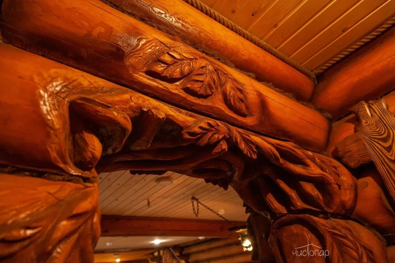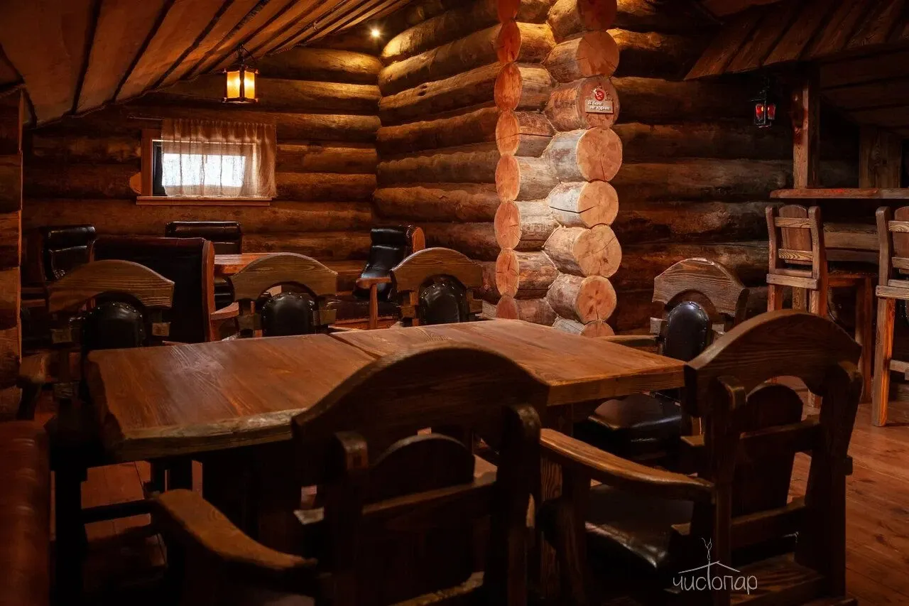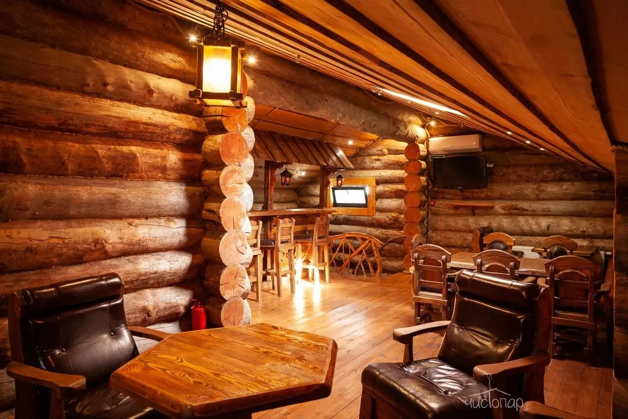 Все новое и как в сказке - все выполнено под древне-русскую старину. Дорогая деревянная мебель, массивные тяжелые двери, столы и стулья... Все выдержано в одном стиле.