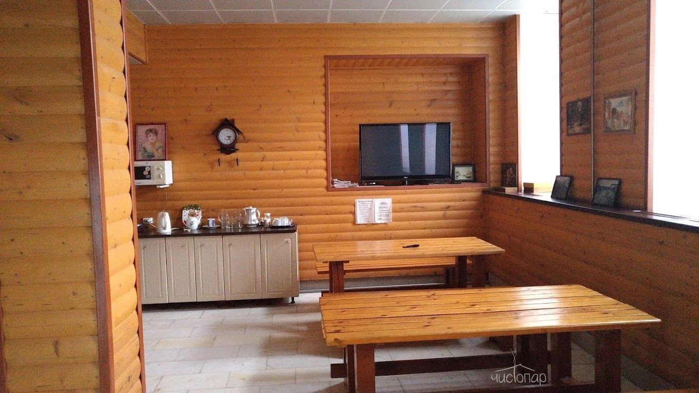 • На втором этаже в бане работает уютное кафе с хорошей домашней кухней, в кафе можно продолжить свой отдых после и во время посещения парной, кафе может предложить клиентам напитки, разливной квас, пиво, закуски, комплексные обеды, также в кафе можно посмотреть спортивные программы спутникового ТВ.