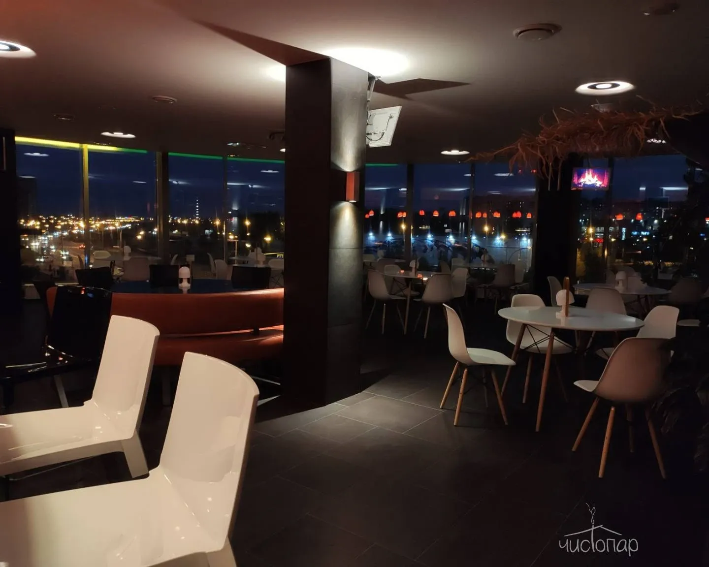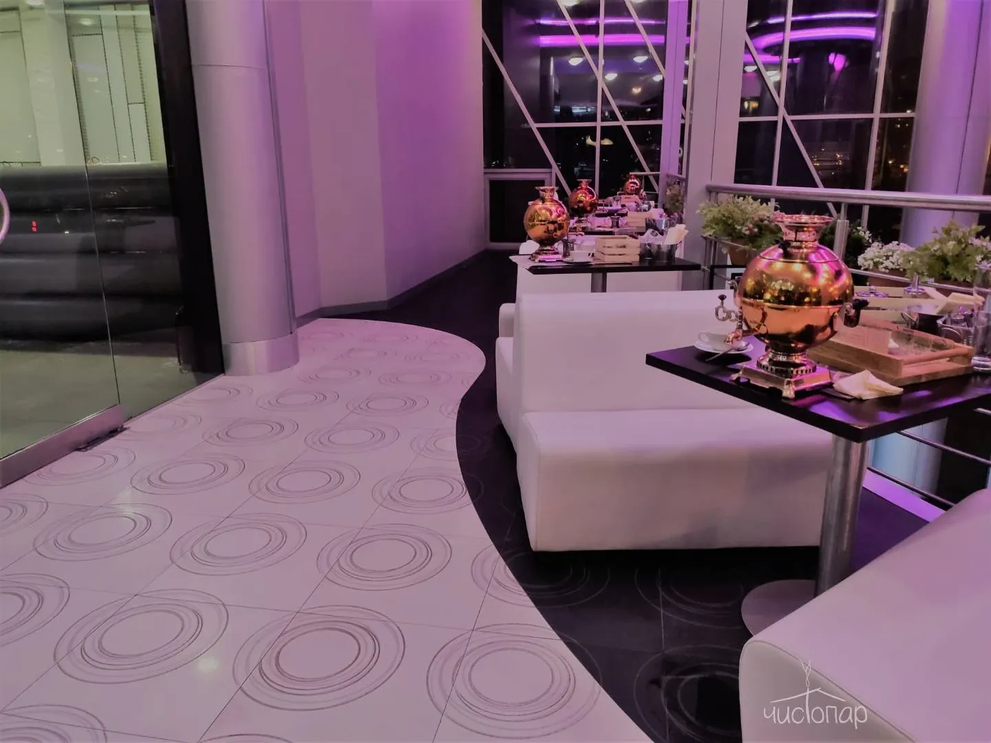 Панорамные виды из душевой, саун, кафе, свободный выход на крышу здания.