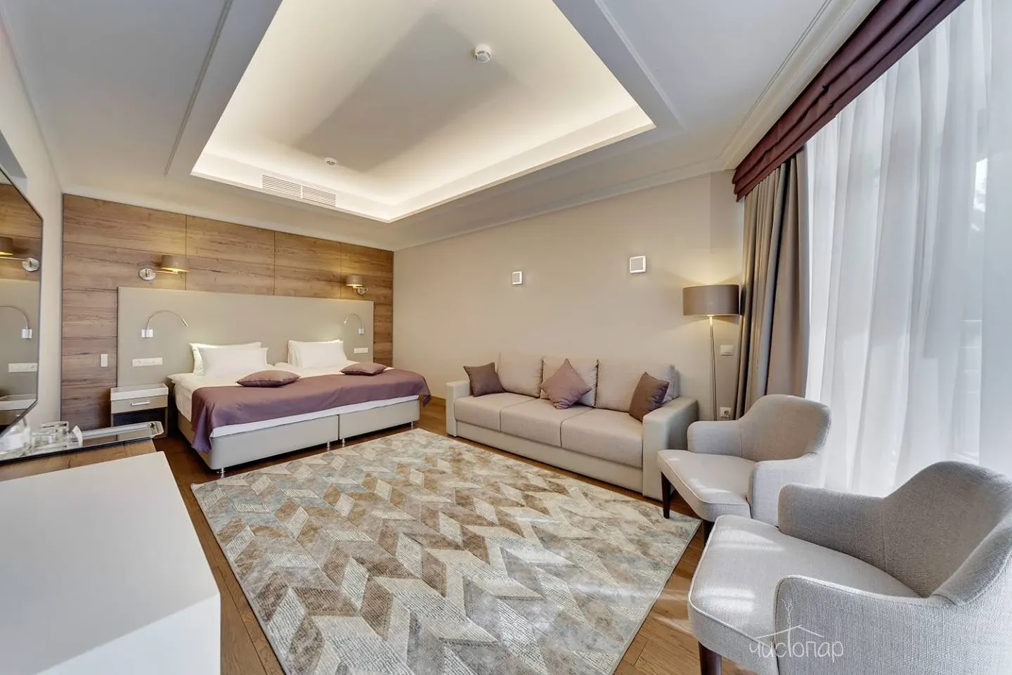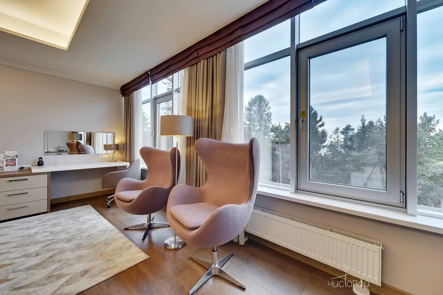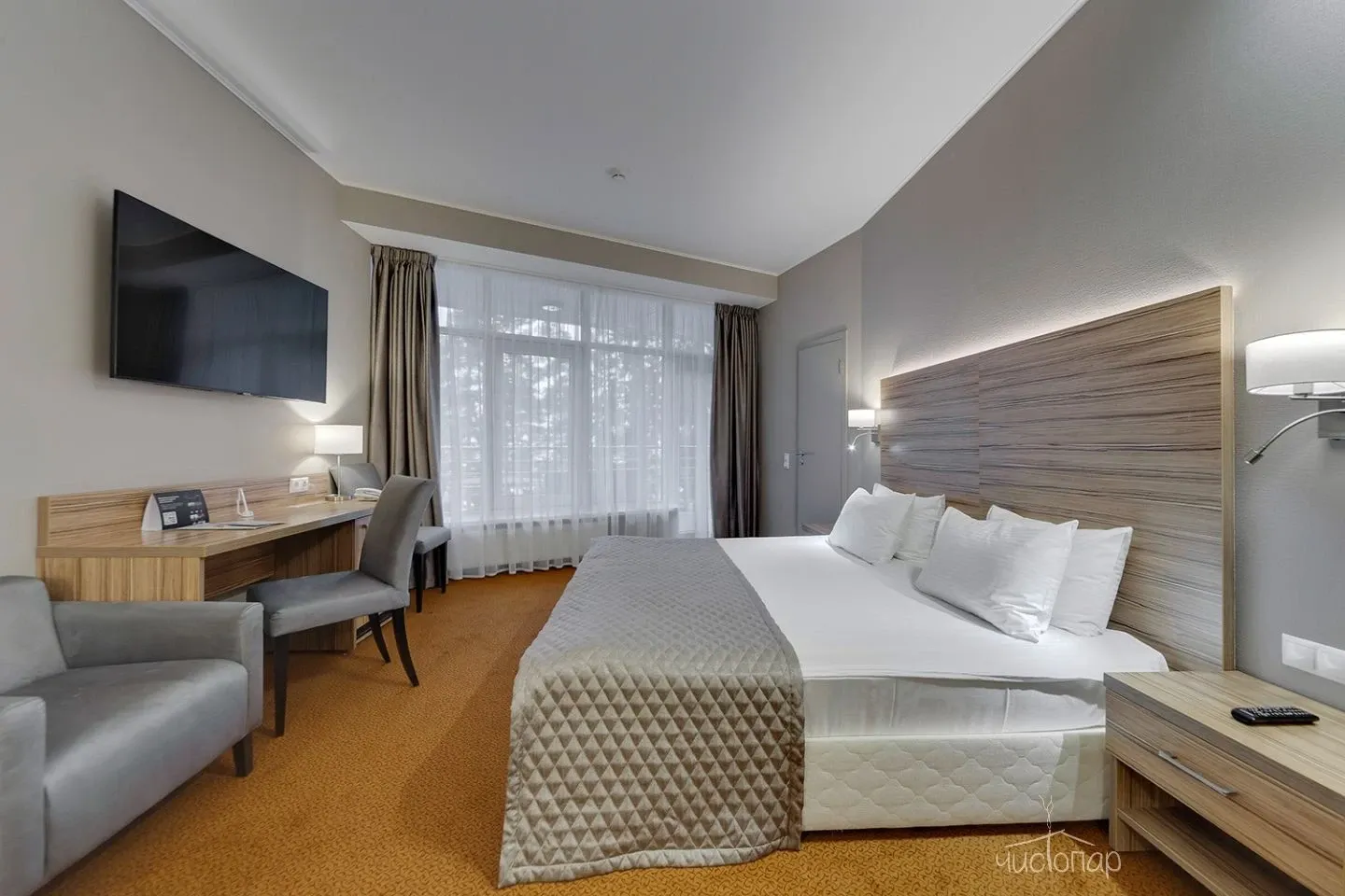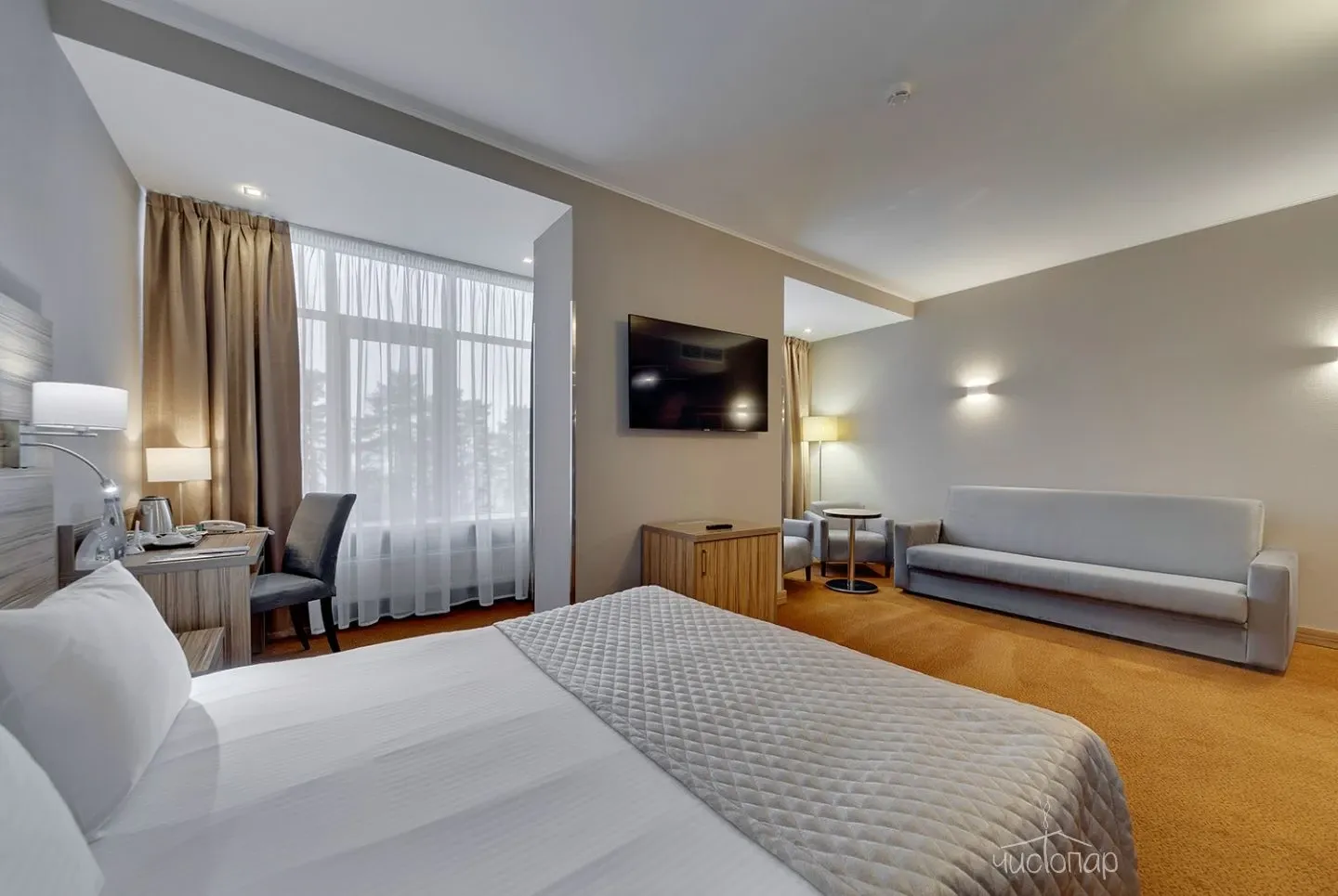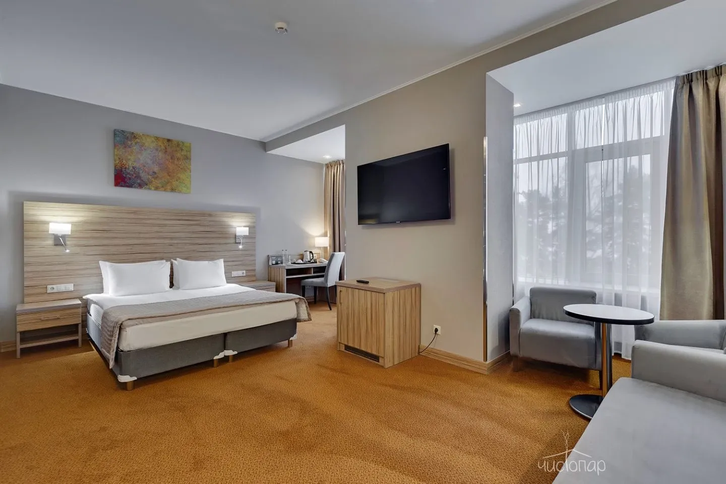 Стильные и просторные двухкомнатные номера категории «Люкс Супериор» расположены на 5 этаже отеля и состоят их двух комнат: гостиной и спальни. Окна номеров выходят на кроны деревьев за которыми виднеется Финский залив.