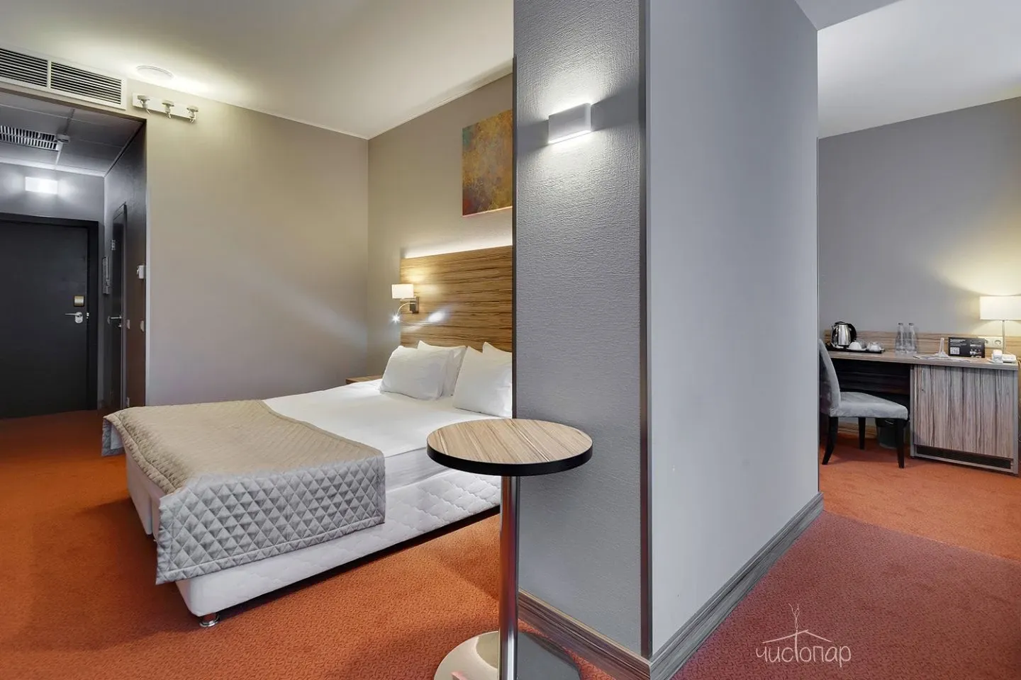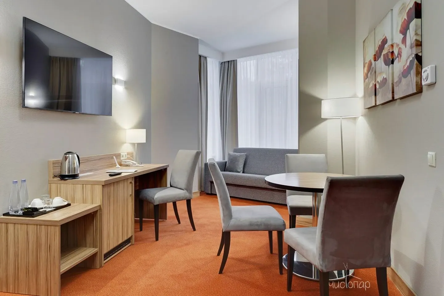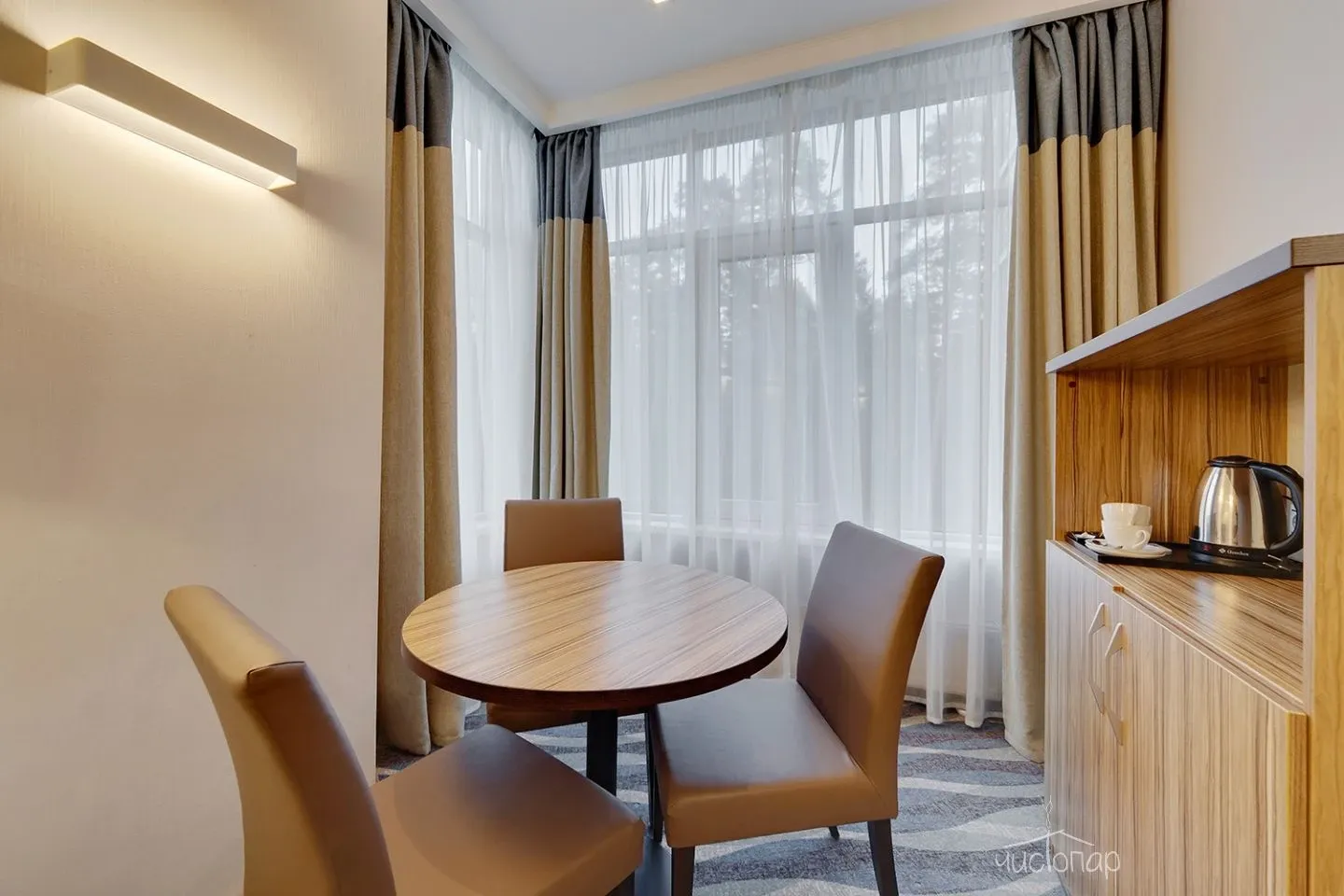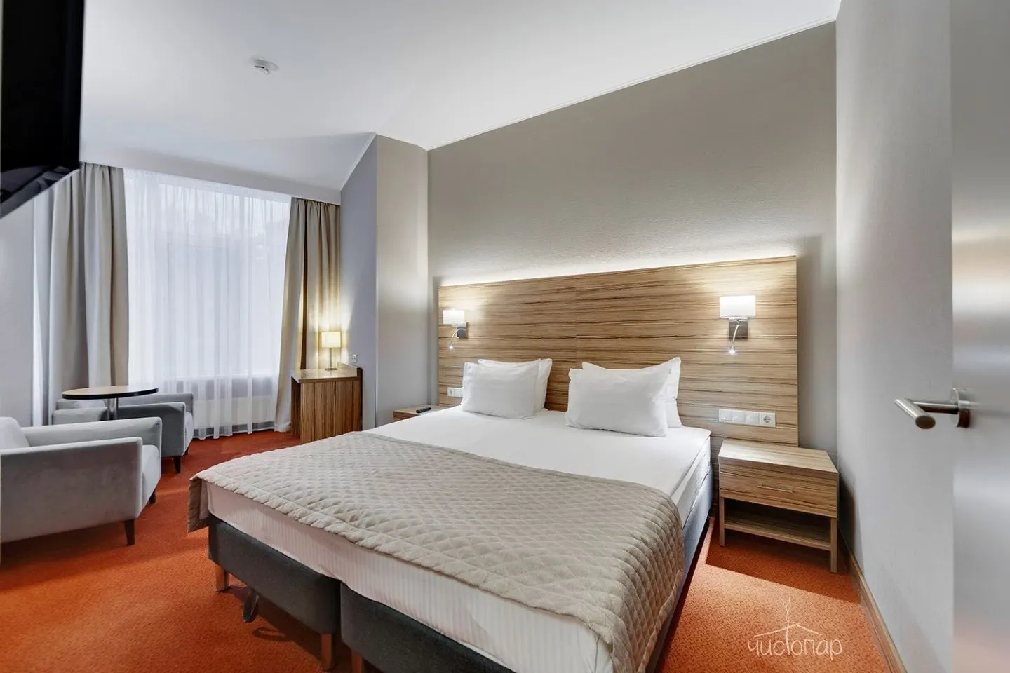 Стильные и просторные двухкомнатные номера категории «Люкс Супериор» расположены на 5 этаже отеля и состоят их двух комнат: гостиной и спальни. Окна номеров выходят на кроны деревьев за которыми виднеется Финский залив.