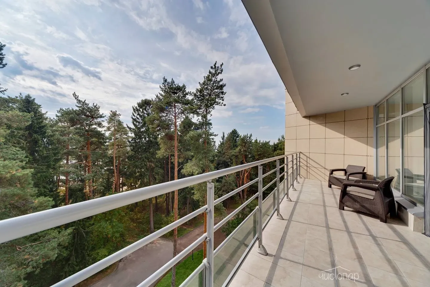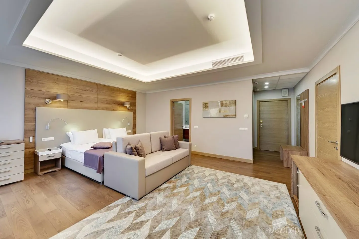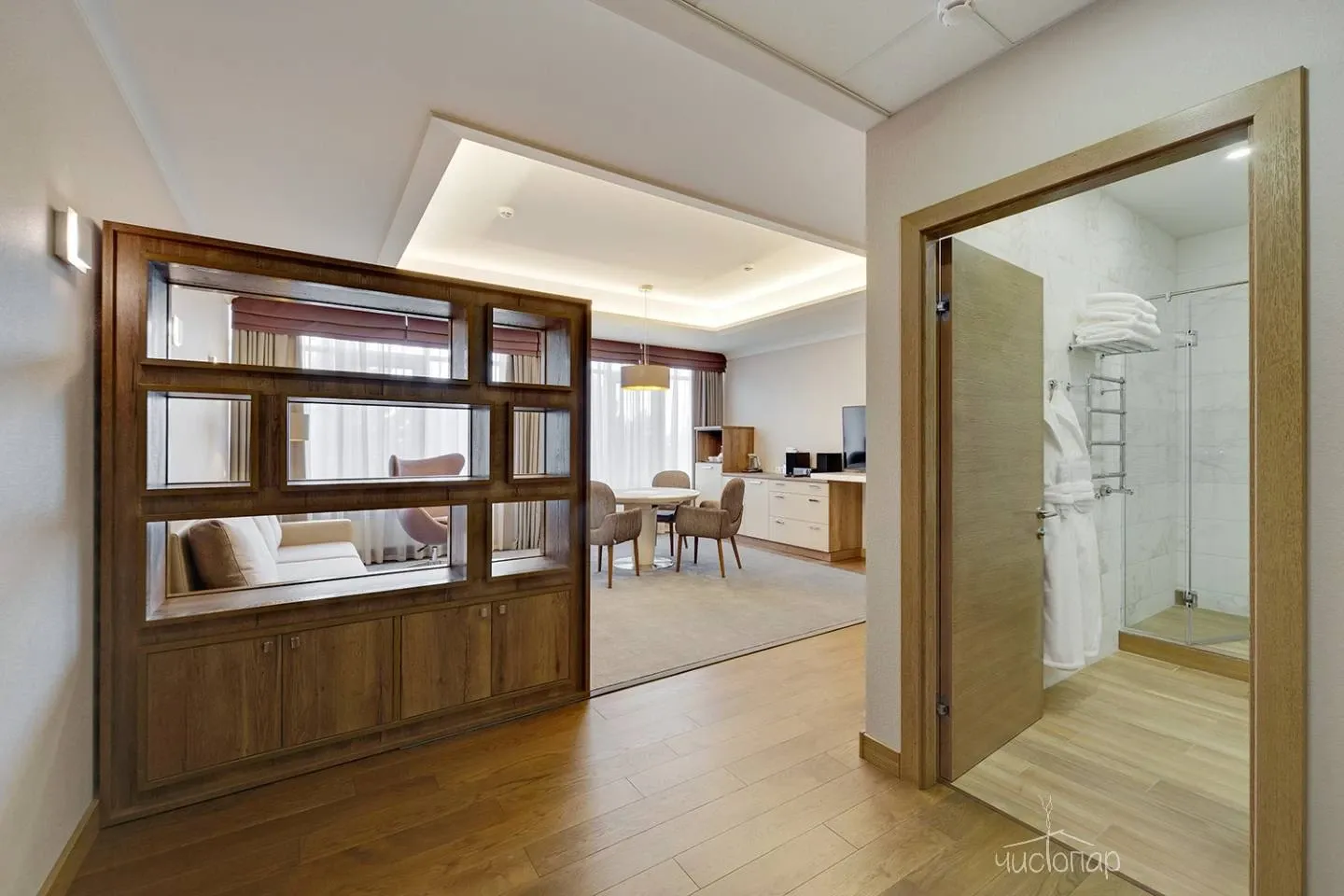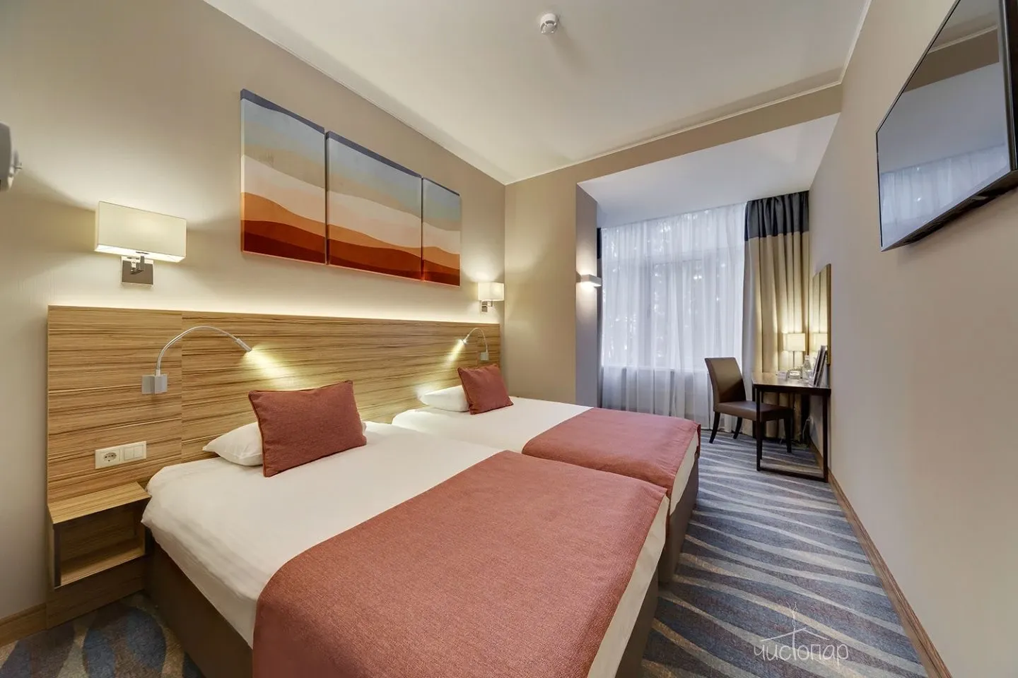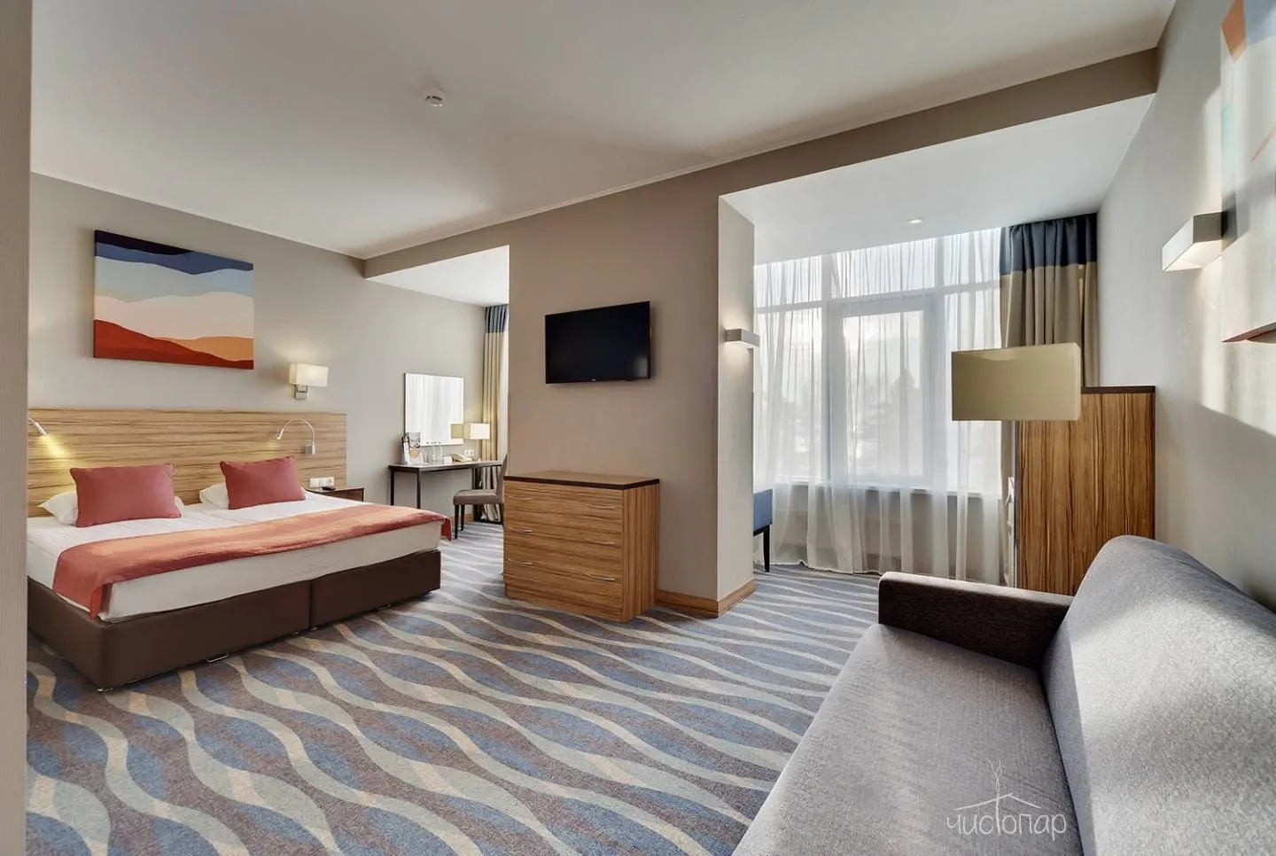 Стильные и просторные двухкомнатные номера категории «Люкс Супериор» расположены на 5 этаже отеля и состоят их двух комнат: гостиной и спальни. Окна номеров выходят на кроны деревьев за которыми виднеется Финский залив.