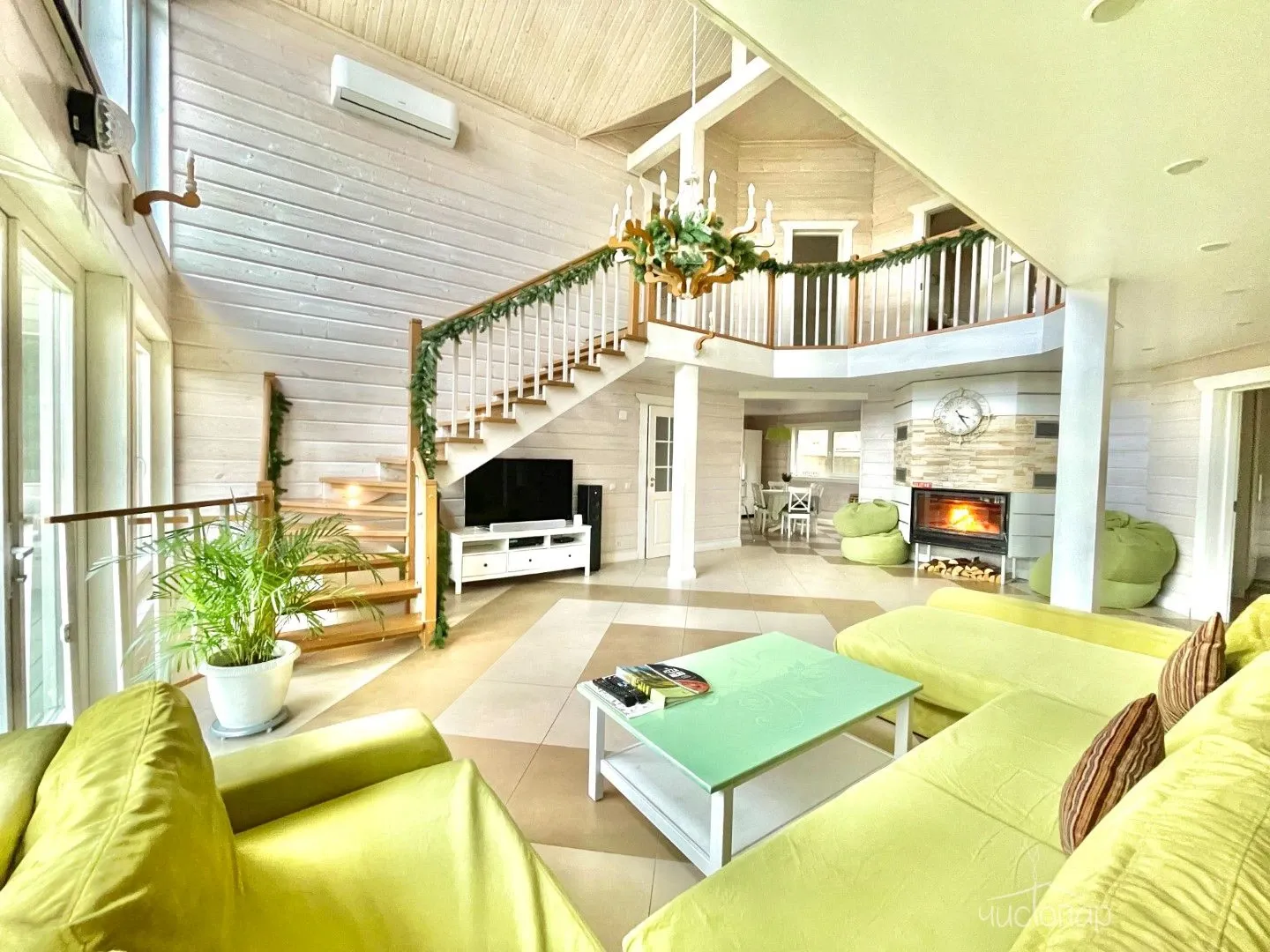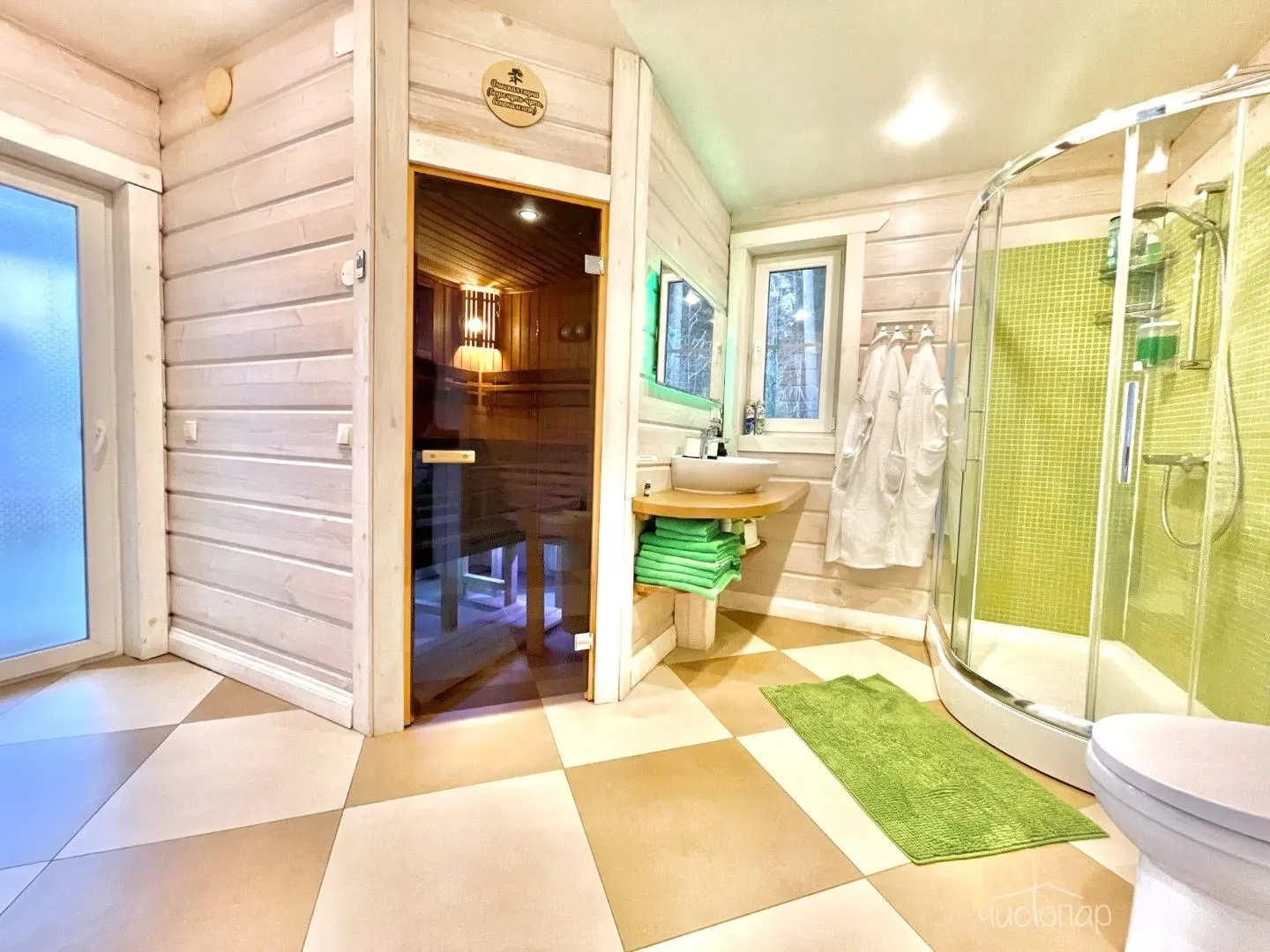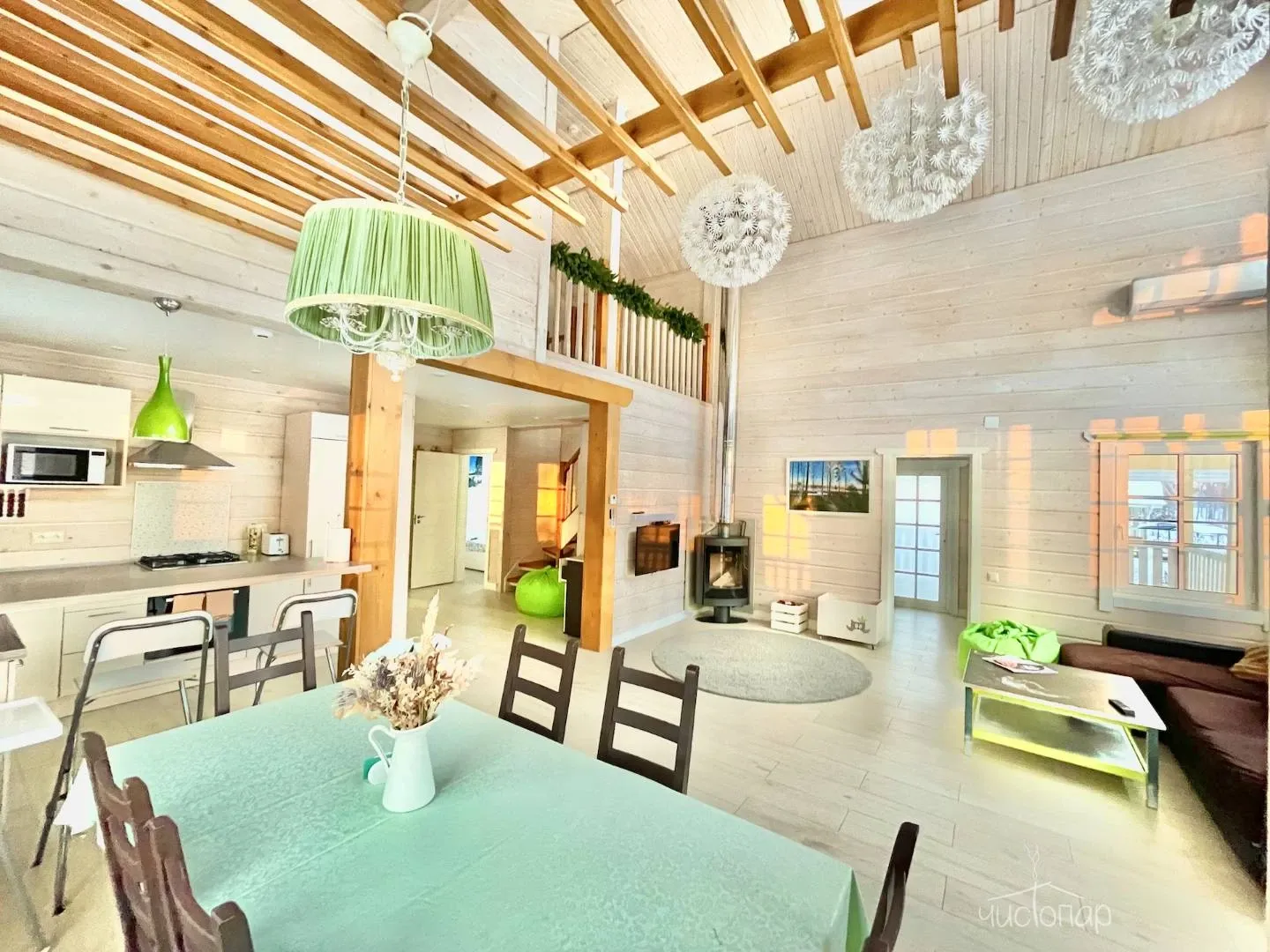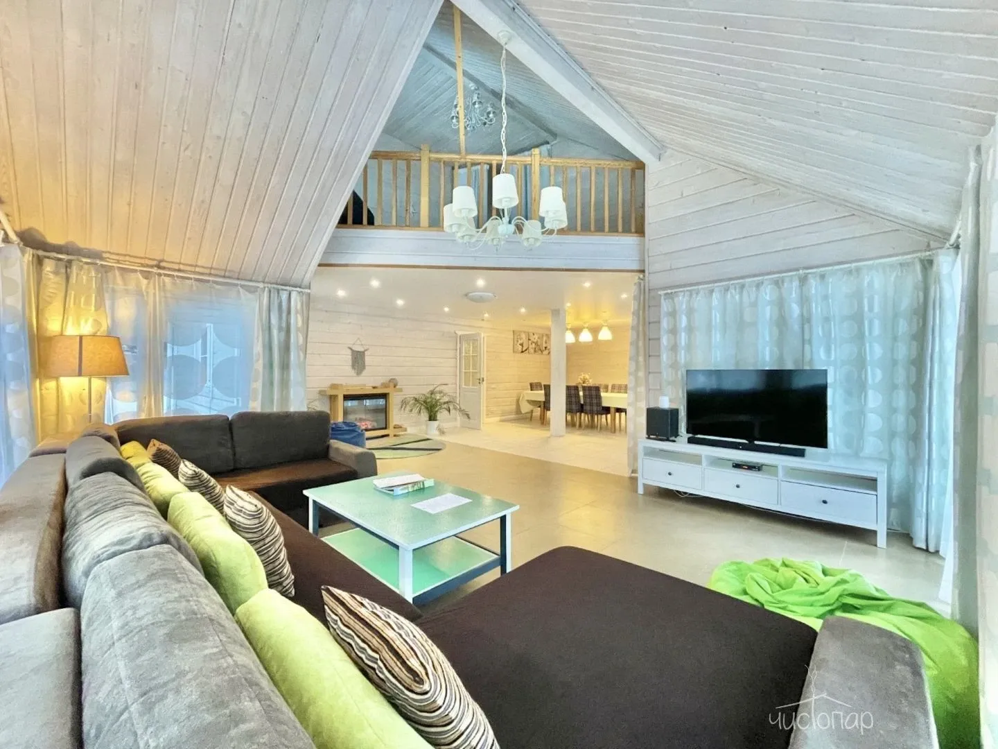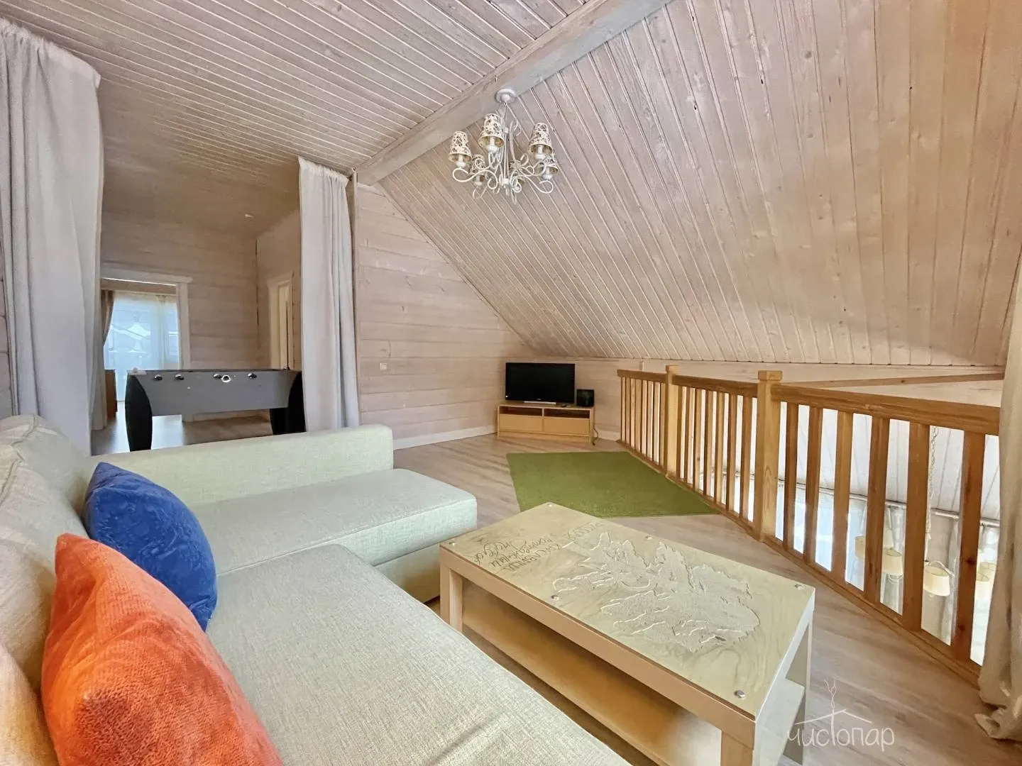 1 этаж - прихожая, кухня-столовая (газовая плита, духовка, холодильник, посудомоечная машина, стиральная машина, микроволновая печь, чайник, тостер, посуда для приготовления и сервировки на 8 персон), гостиная с камином, кондиционер, 1 спальня с двуспальной кроватью, 1 спальня с 2 односпальными кроватями, санузел с душем, сауна, большая терраса.