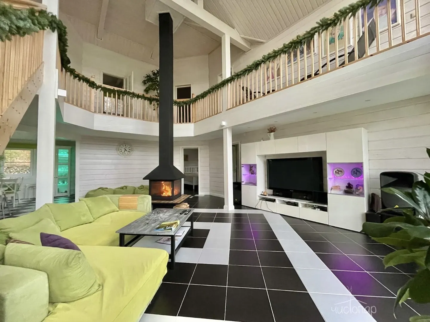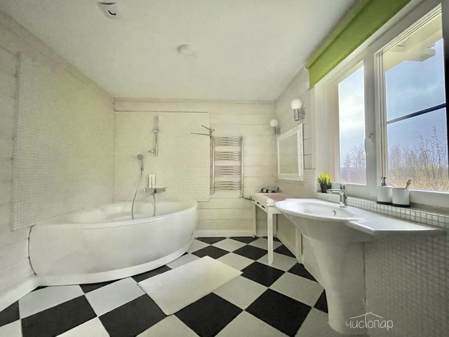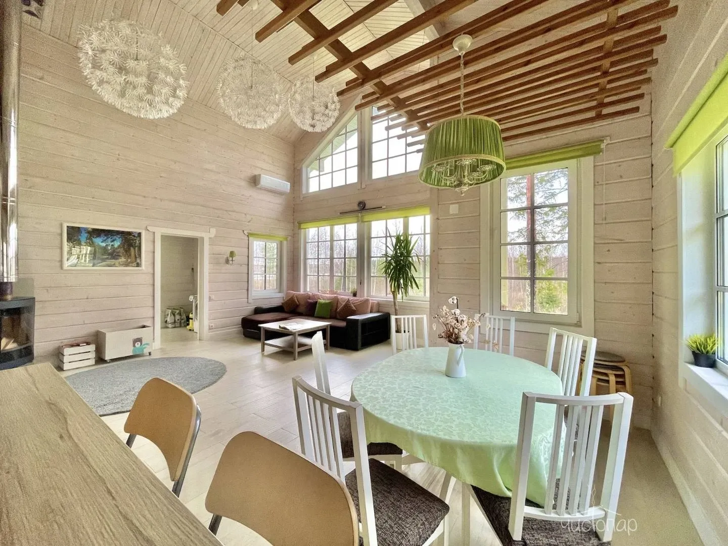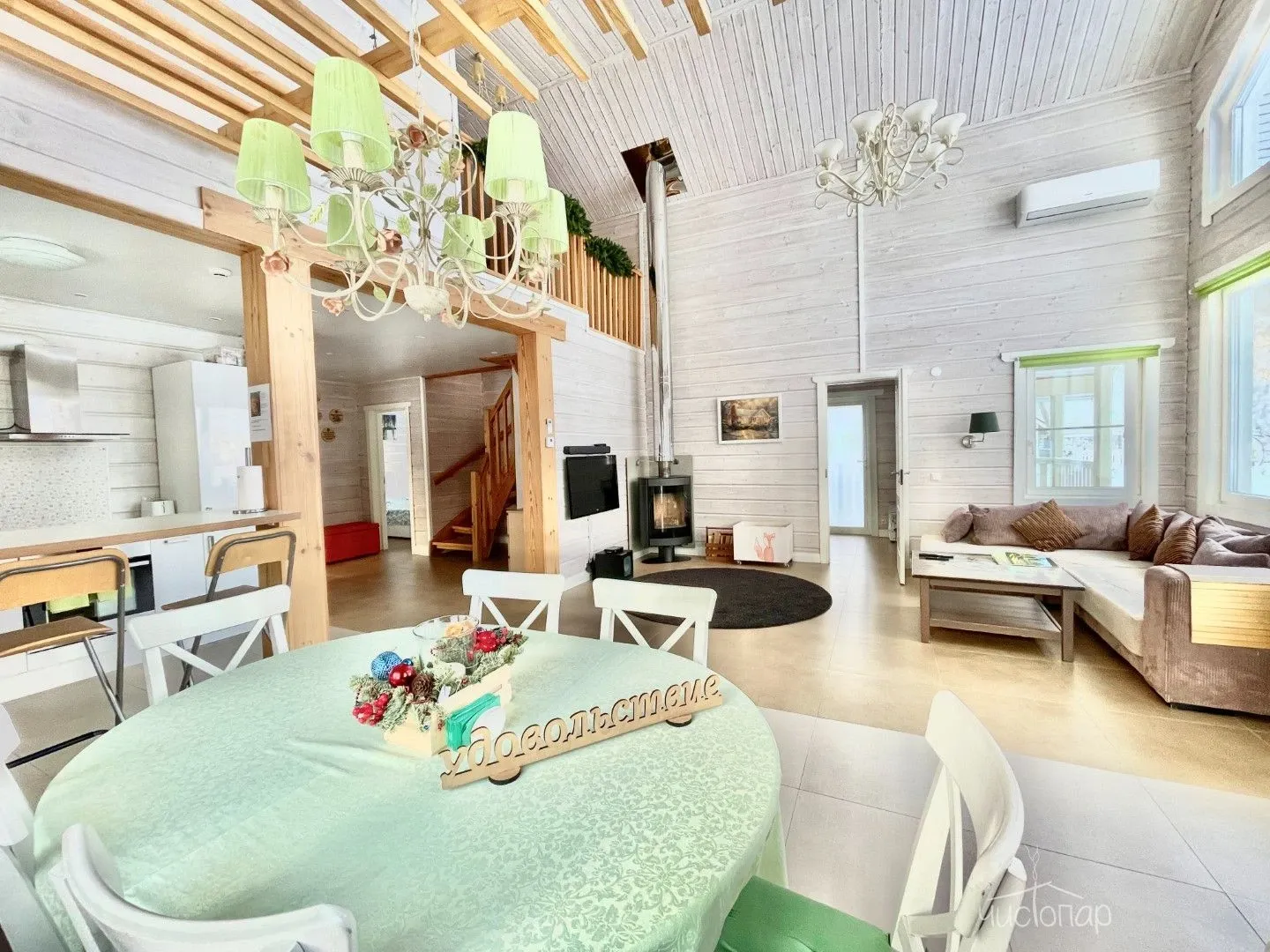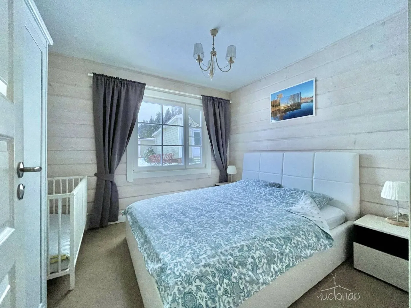 1 этаж - прихожая, кухня-столовая (газовая плита, духовка, холодильник, посудомоечная машина, стиральная машина, микроволновая печь, чайник, тостер, посуда для приготовления и сервировки на 8 персон), гостиная с камином, кондиционер, 1 спальня с двуспальной кроватью, 1 спальня с 2 односпальными кроватями, санузел с душем, сауна, большая терраса.