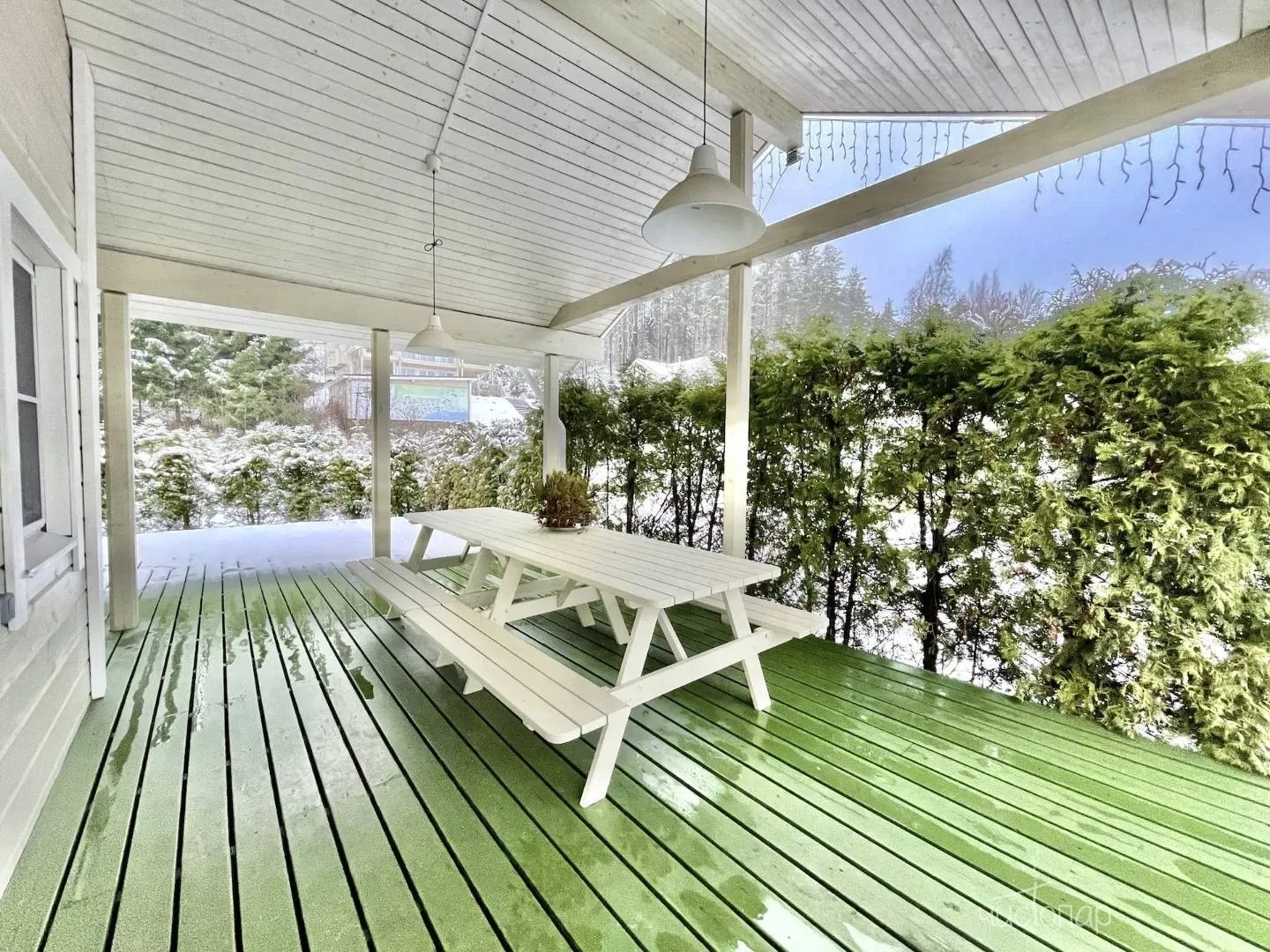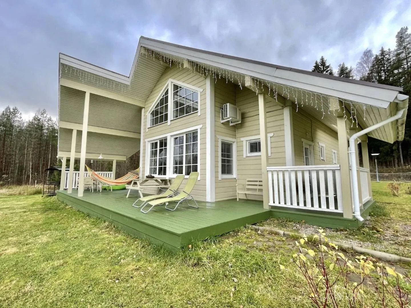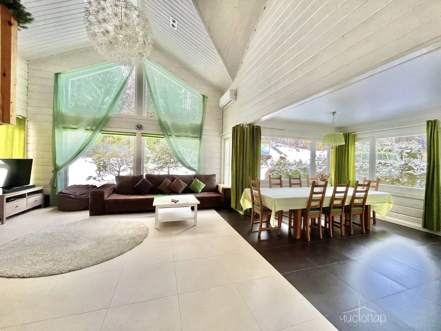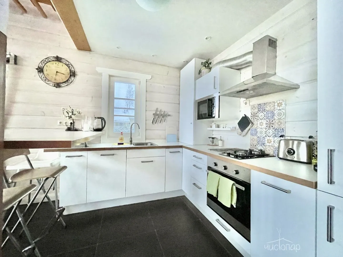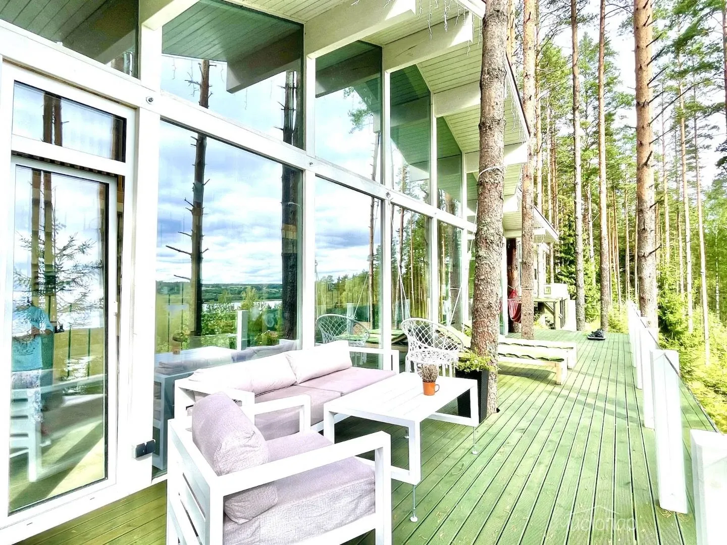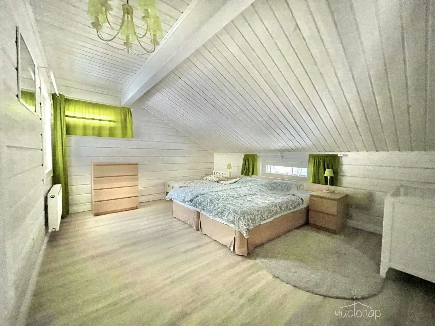 1 этаж - прихожая, кухня-столовая (газовая плита, духовка, холодильник, посудомоечная машина, стиральная машина, микроволновая печь, чайник, тостер, посуда для приготовления и сервировки на 8 персон), гостиная с камином, кондиционер, 1 спальня с двуспальной кроватью, 1 спальня с 2 односпальными кроватями, санузел с душем, сауна, большая терраса.