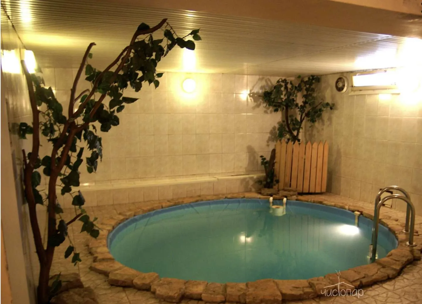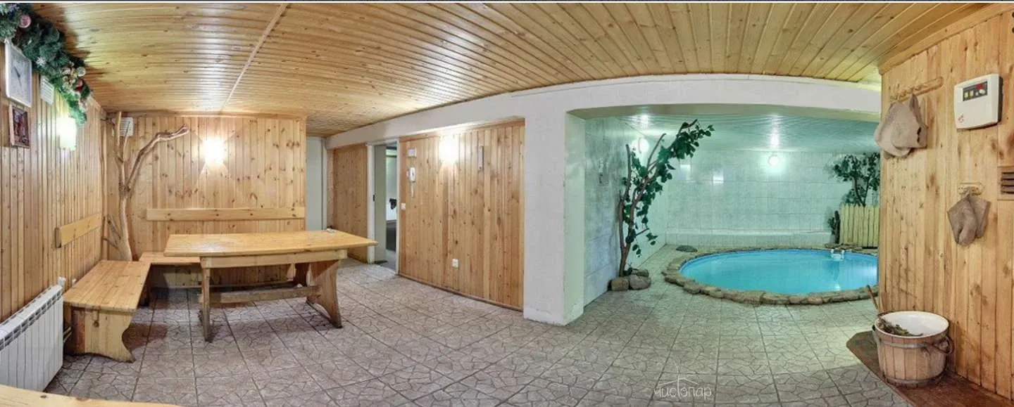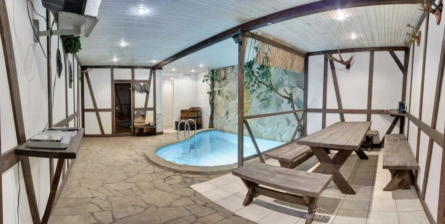 Большая баняРазмер основного помещения "Большой бани" составляет более 40 м2 и способна вместить до 10 человек. К услугам клиентов просторная парная, бассейн 3х4 метра, бильярдная с русским столом размером 35 м2. Интерьер выполнен в средневековом стиле "Шале" и посвящен теме охоты.