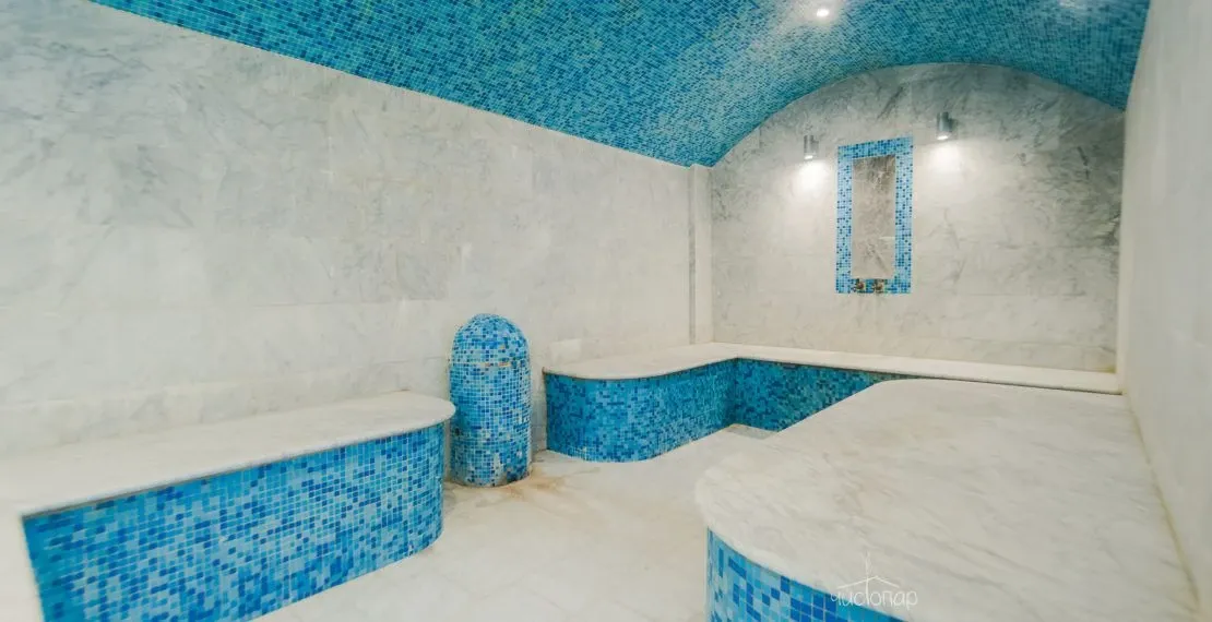 Женский люкс оборудован персональными раздевалками с вещевыми шкафчиками, уютными креслами. К Вашим услугам традиционная русская парная или турецкий хамам на теплых плитах. Из парной Вы сразу можете окунуться в прохладной купеле с проточной водой и расслабившись отдохнуть в холле у телевизора за чашечкой чая.