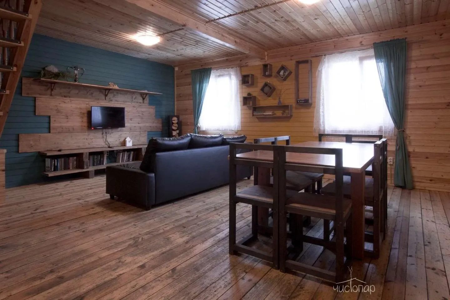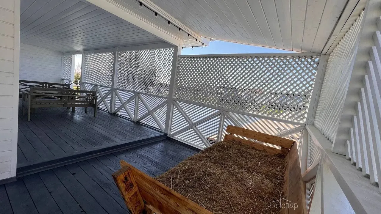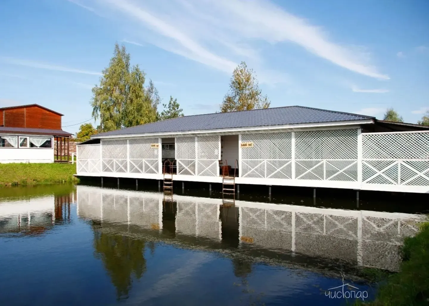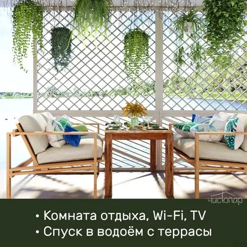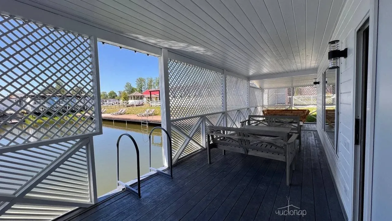 Просторная зона для застолий с диванами и большим столом и телевизором, комната отдыха, терраса со столиками и спуском на воду по лесенке. В зимнее время функционирует прорубь.