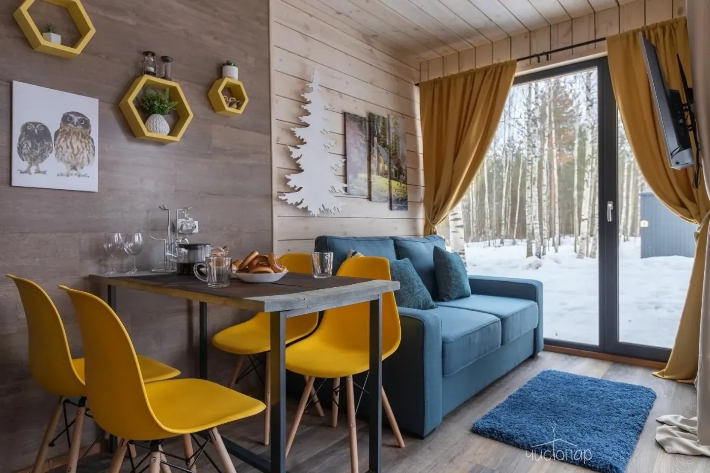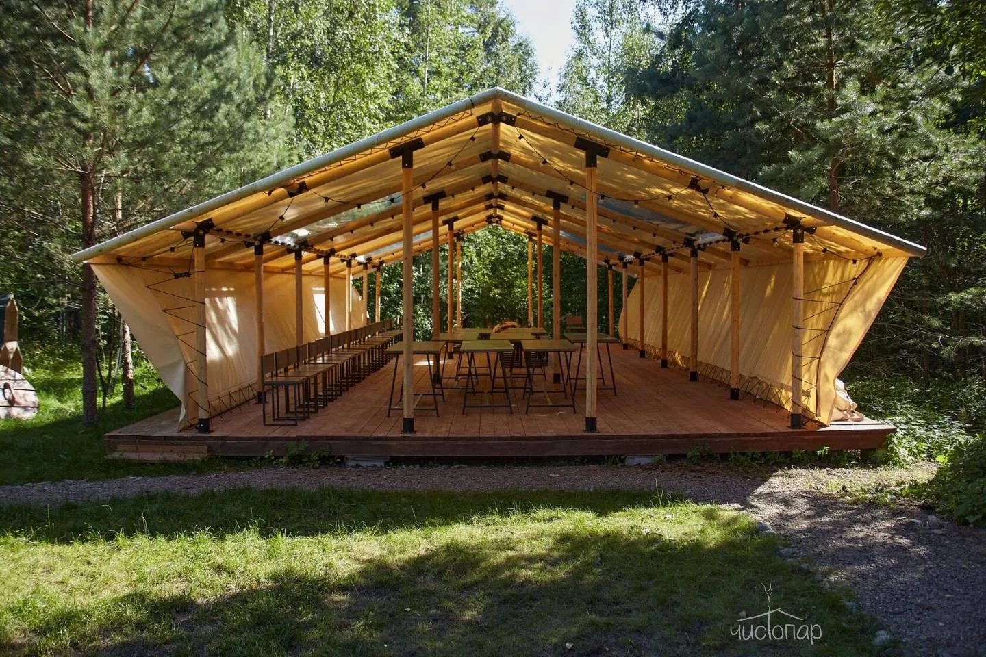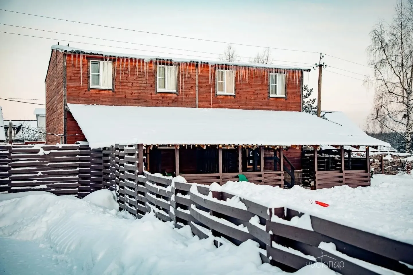 Просторная зона для застолий с диванами и большим столом и телевизором, комната отдыха, терраса со столиками и спуском на воду по лесенке. В зимнее время функционирует прорубь.