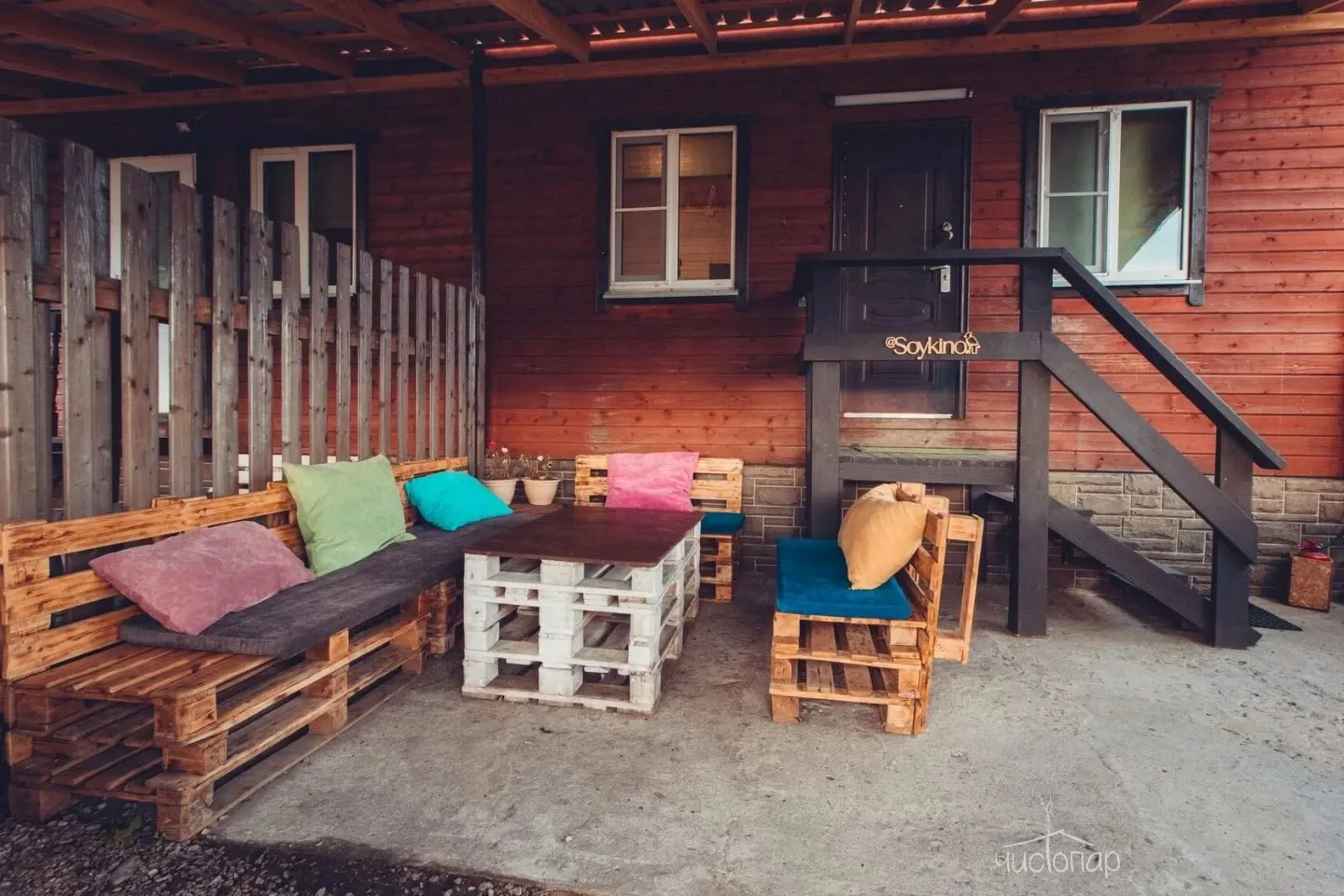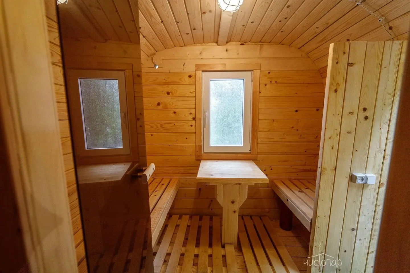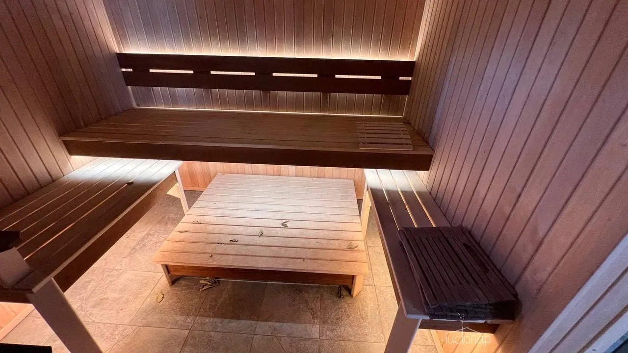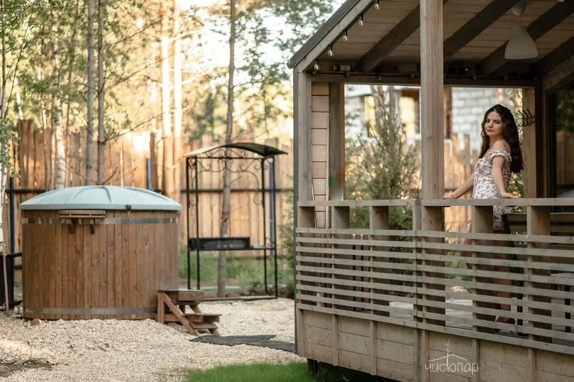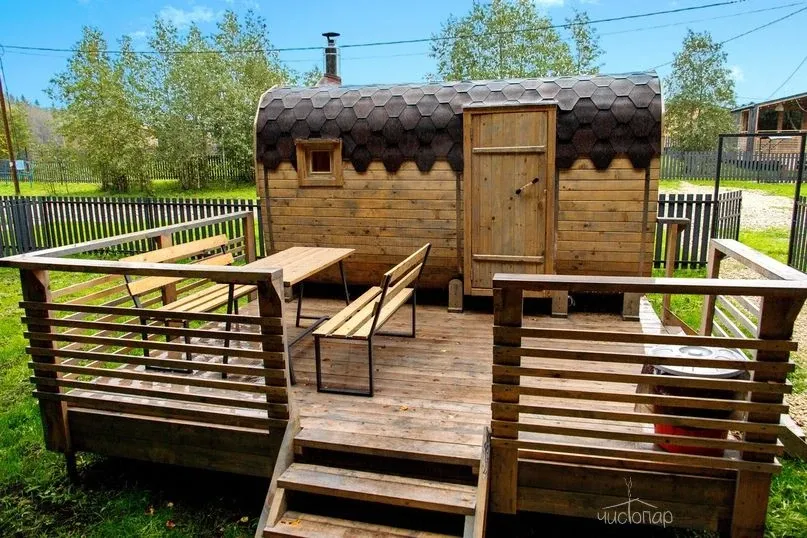 Имеют парную, помещение со столиком и уличную террасу со столом и скамейками.