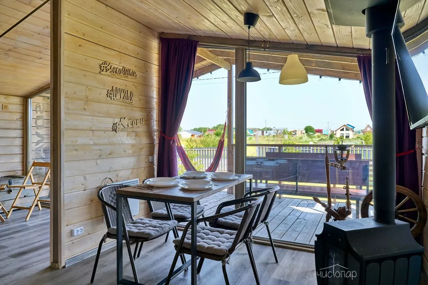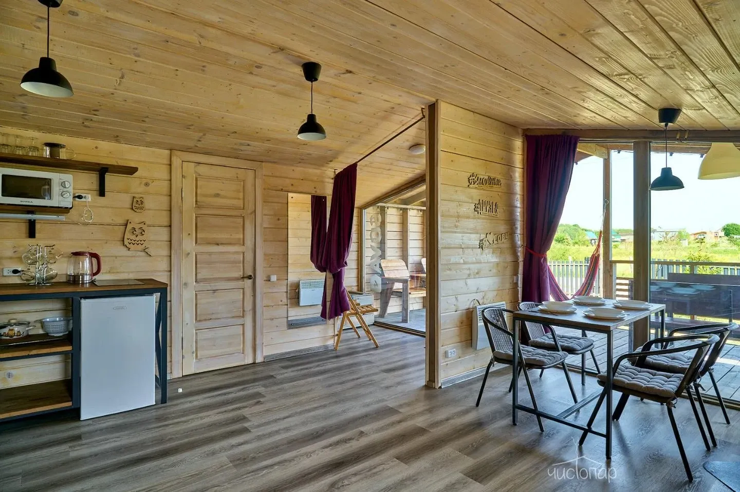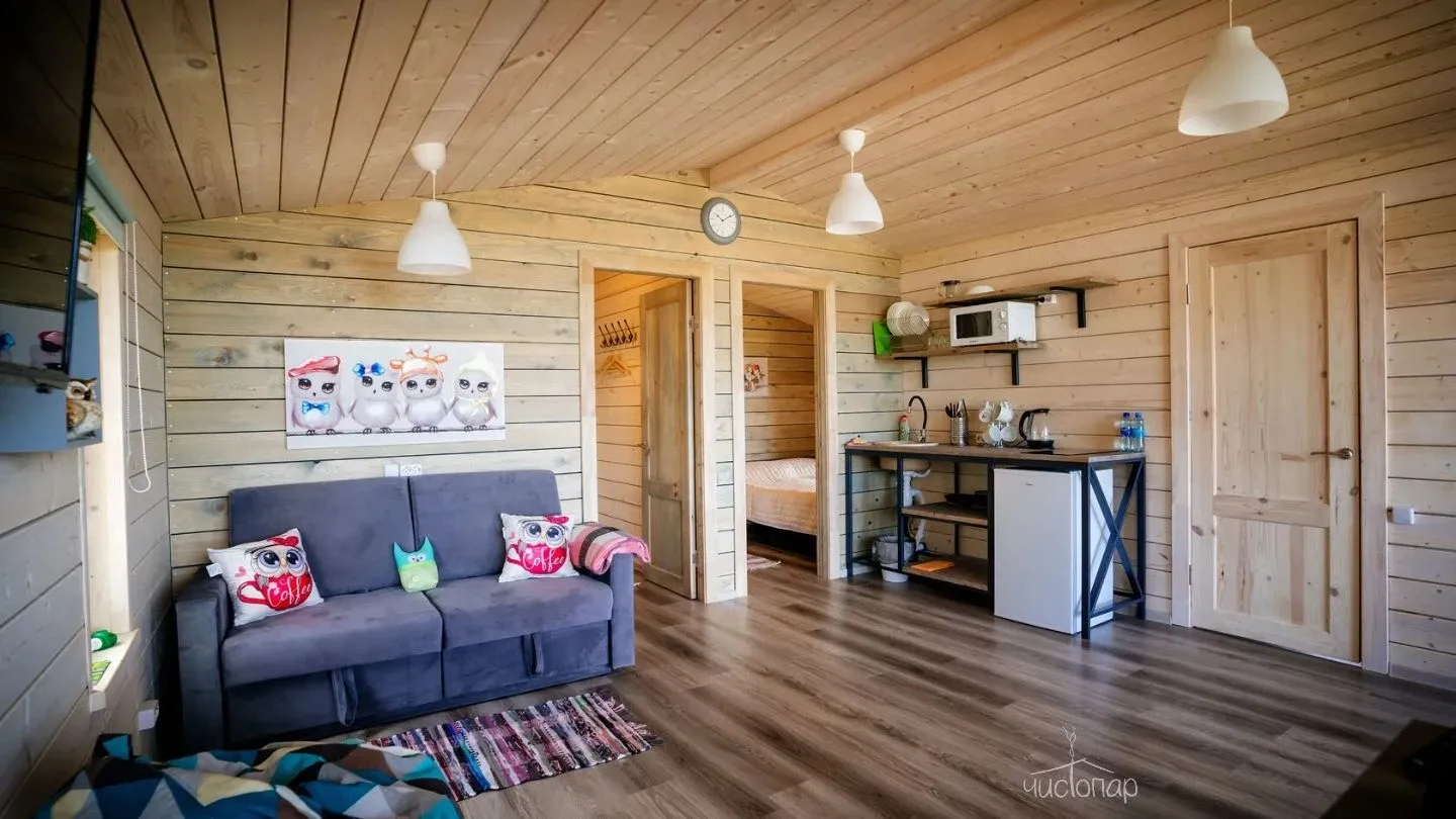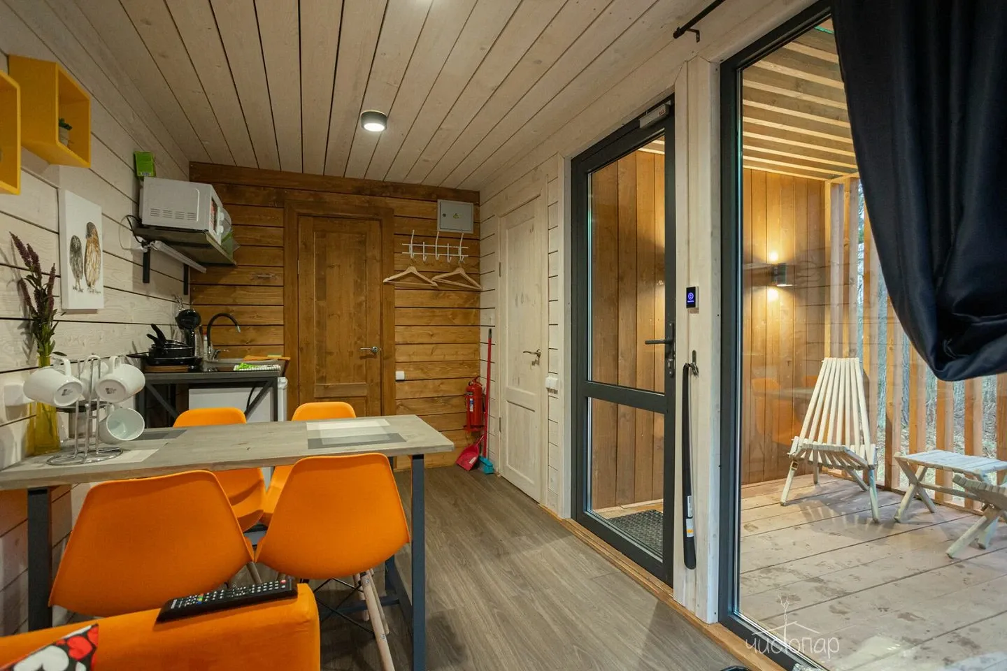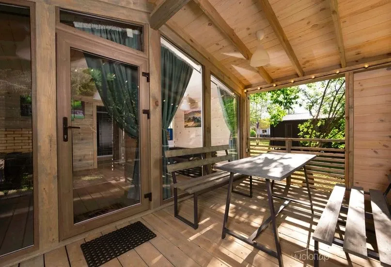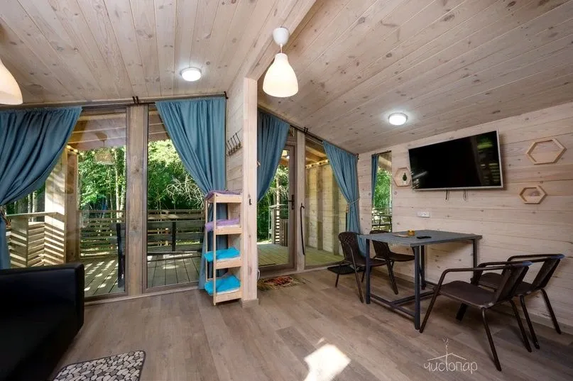 Гостиная с кухонной зоной, столом и диваном, посуда, чайник, кулер, микроволновая печь, телевизор, Wi-Fi, отопление, санузел, душ, крытая терраса со столом и скамейками.