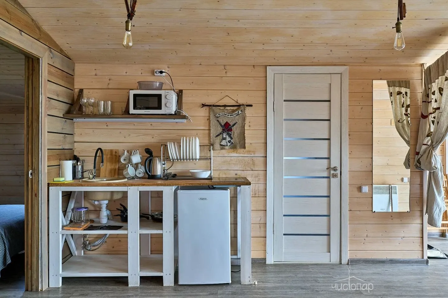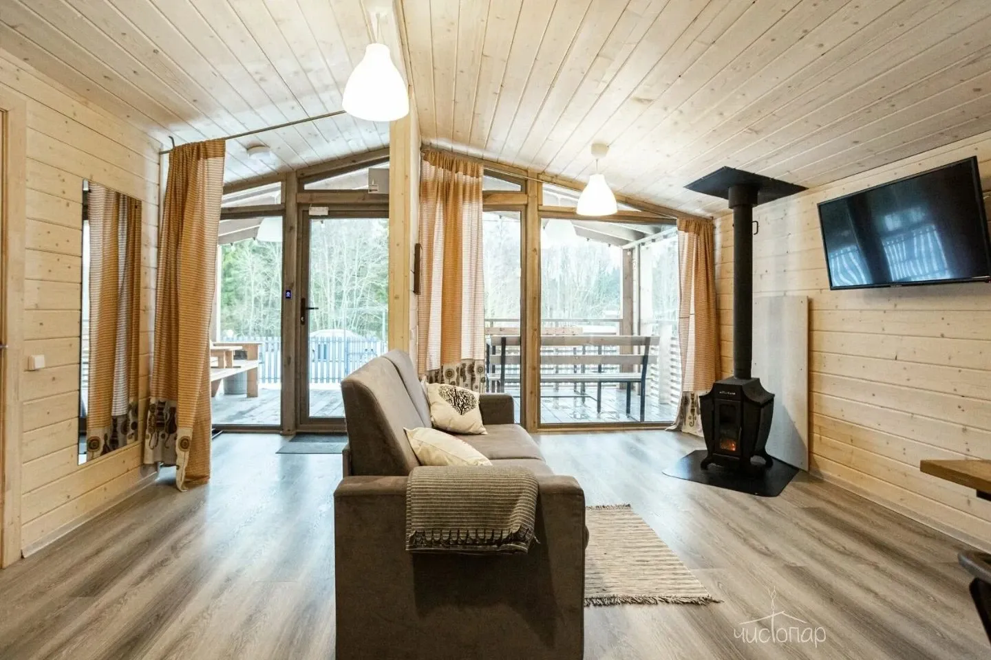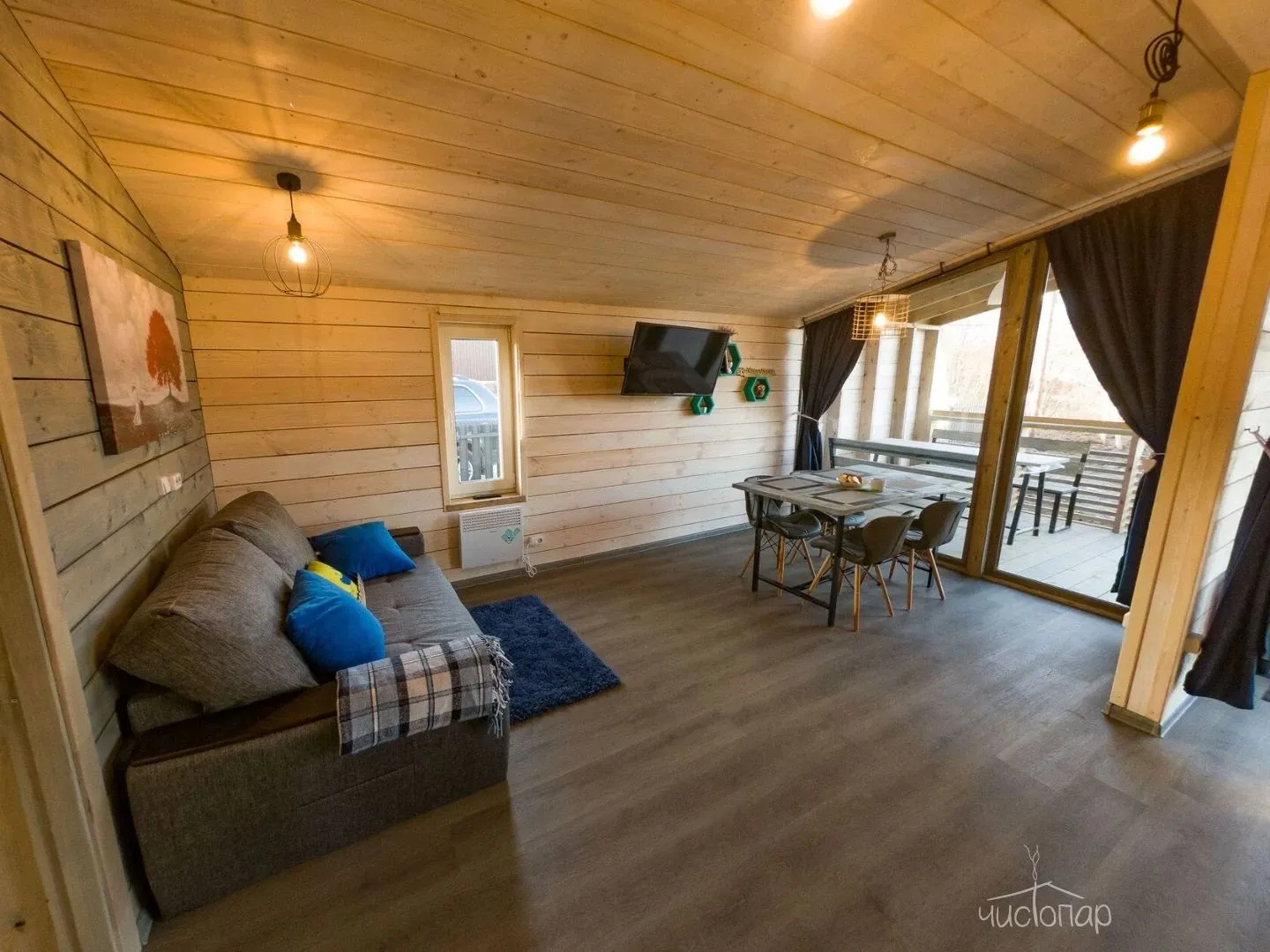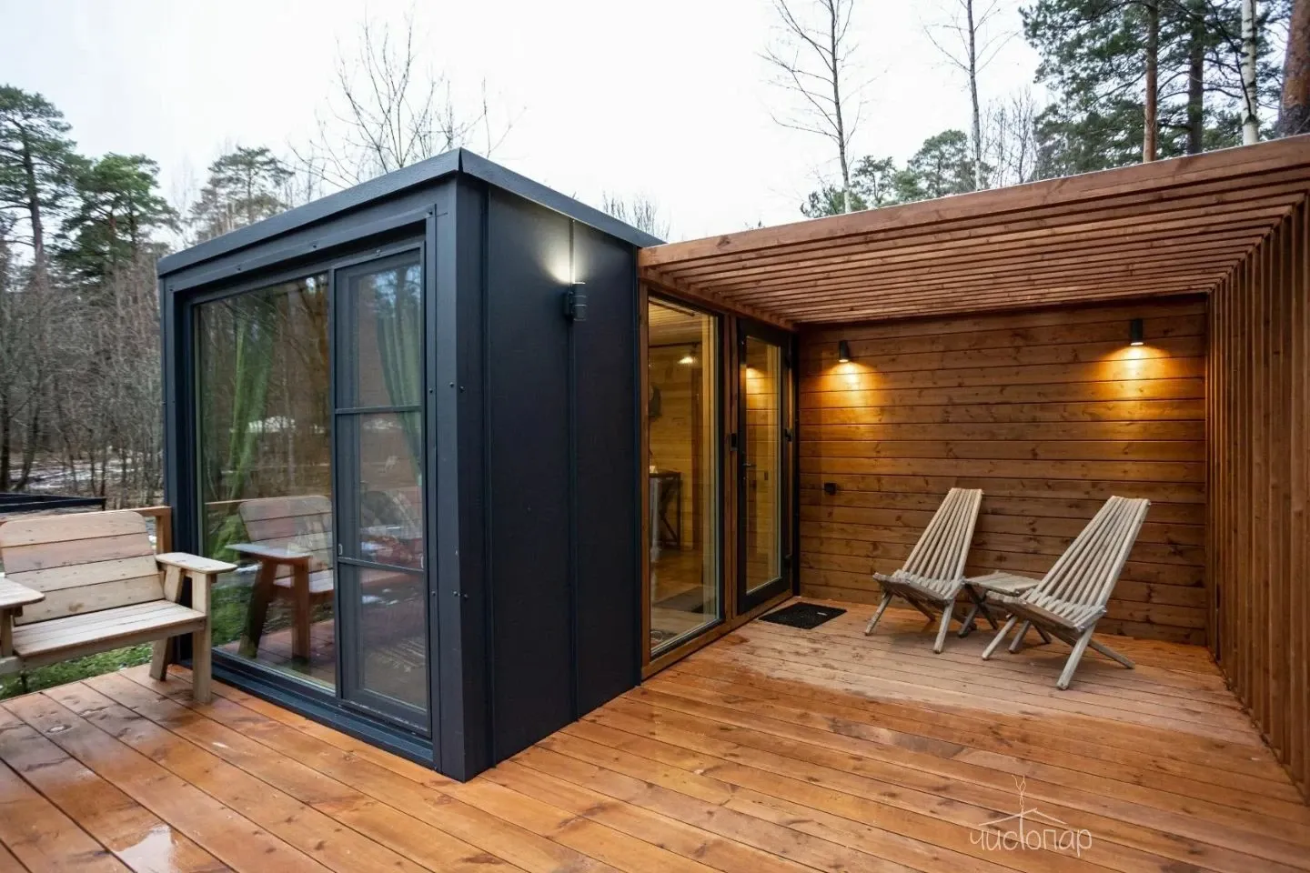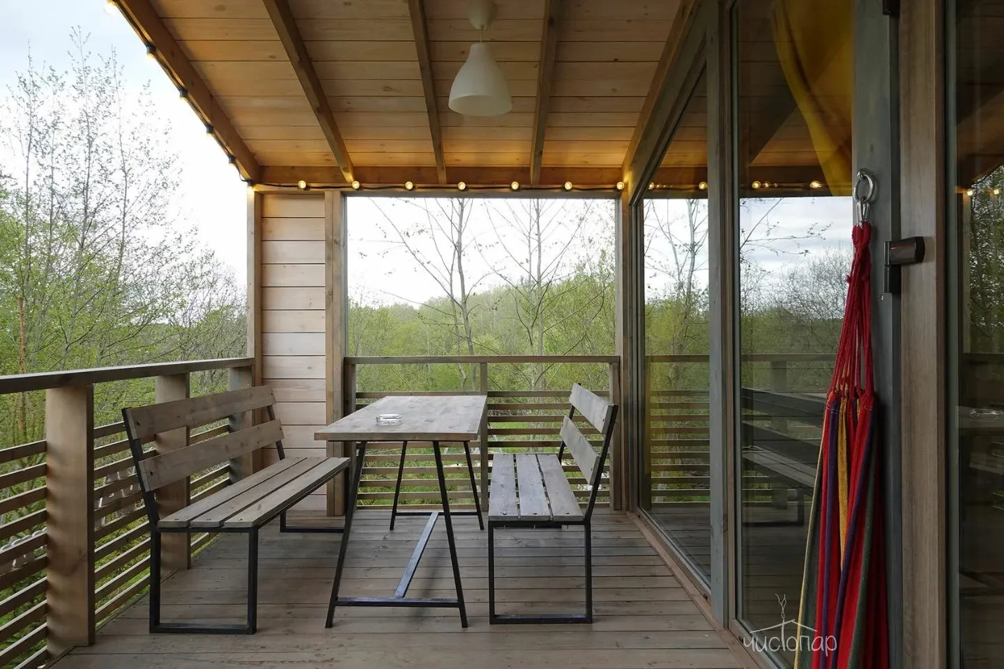 Гостиная с кухонной зоной, столом и диваном, посуда, чайник, кулер, микроволновая печь, телевизор, Wi-Fi, отопление, санузел, душ, крытая терраса со столом и скамейками.