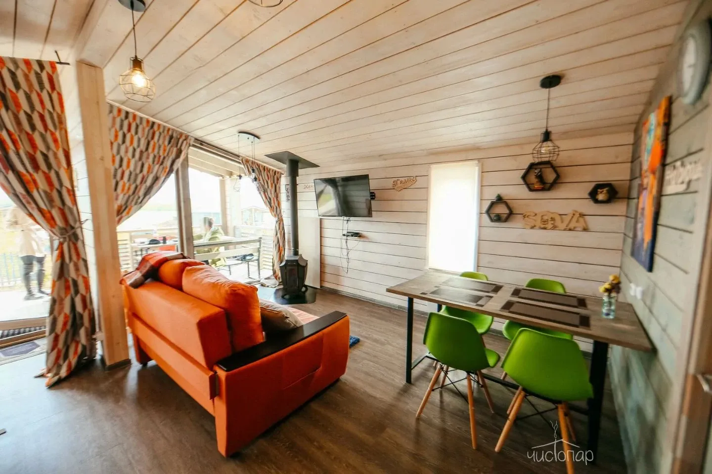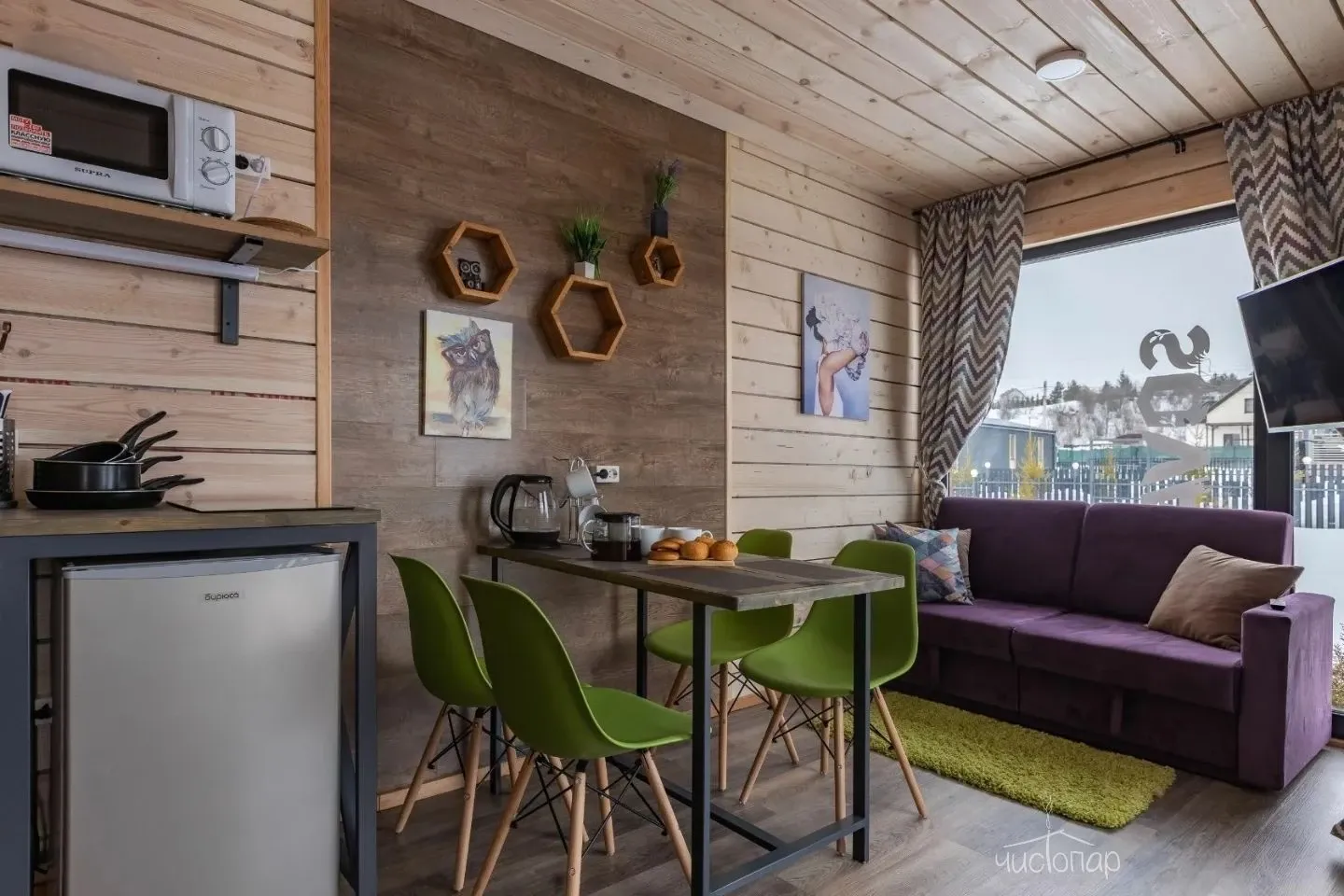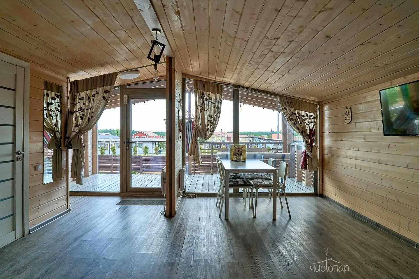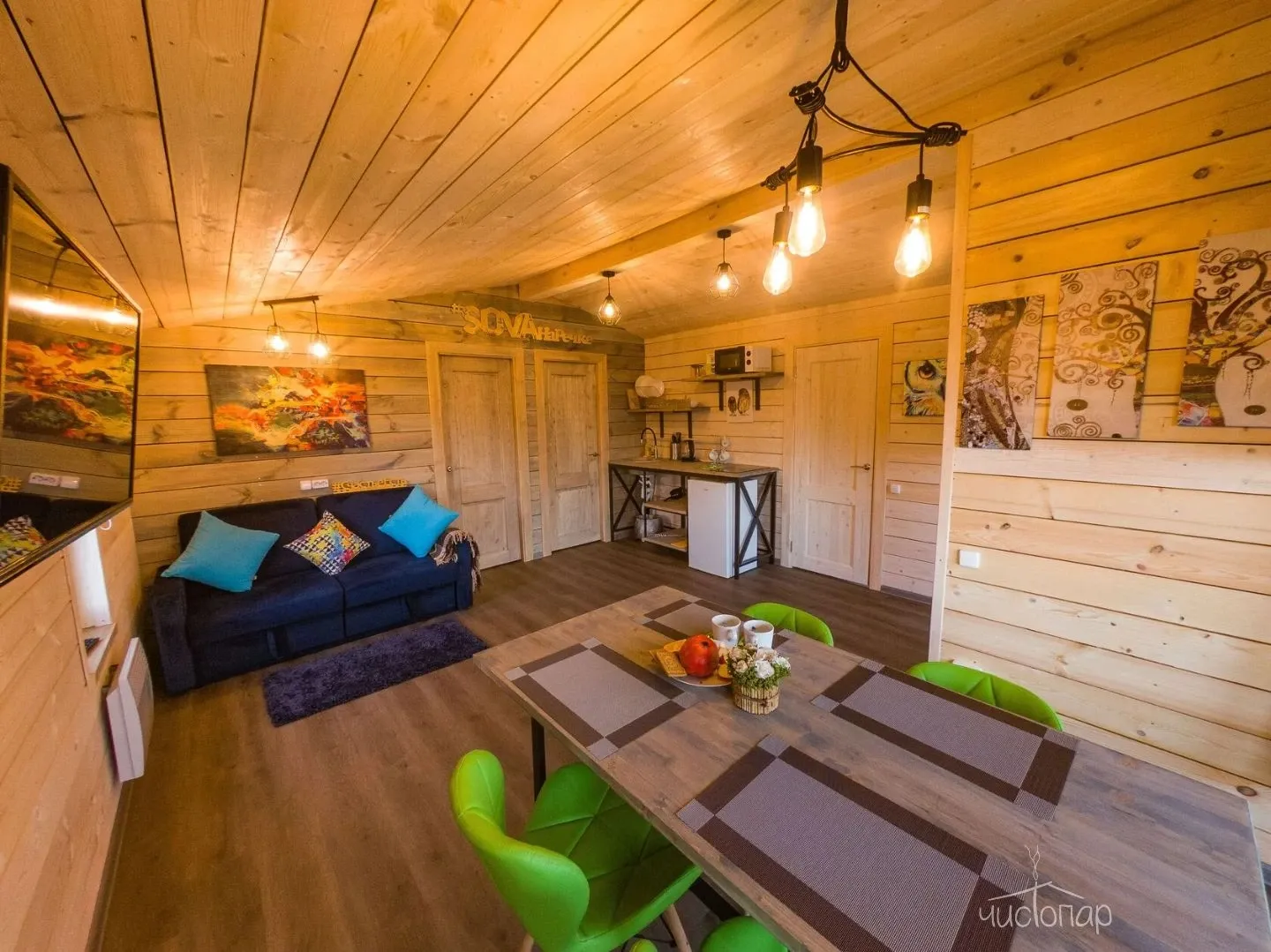 Гостиная с кухонной зоной, столом и диваном, посуда, чайник, кулер, микроволновая печь, телевизор, Wi-Fi, отопление, санузел, душ, крытая терраса со столом и скамейками.