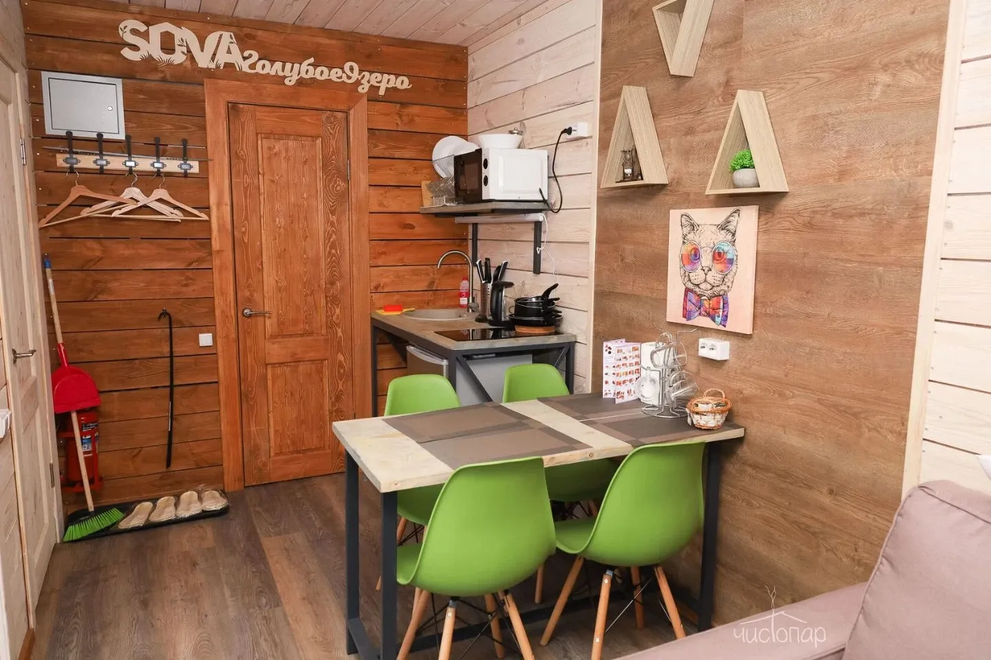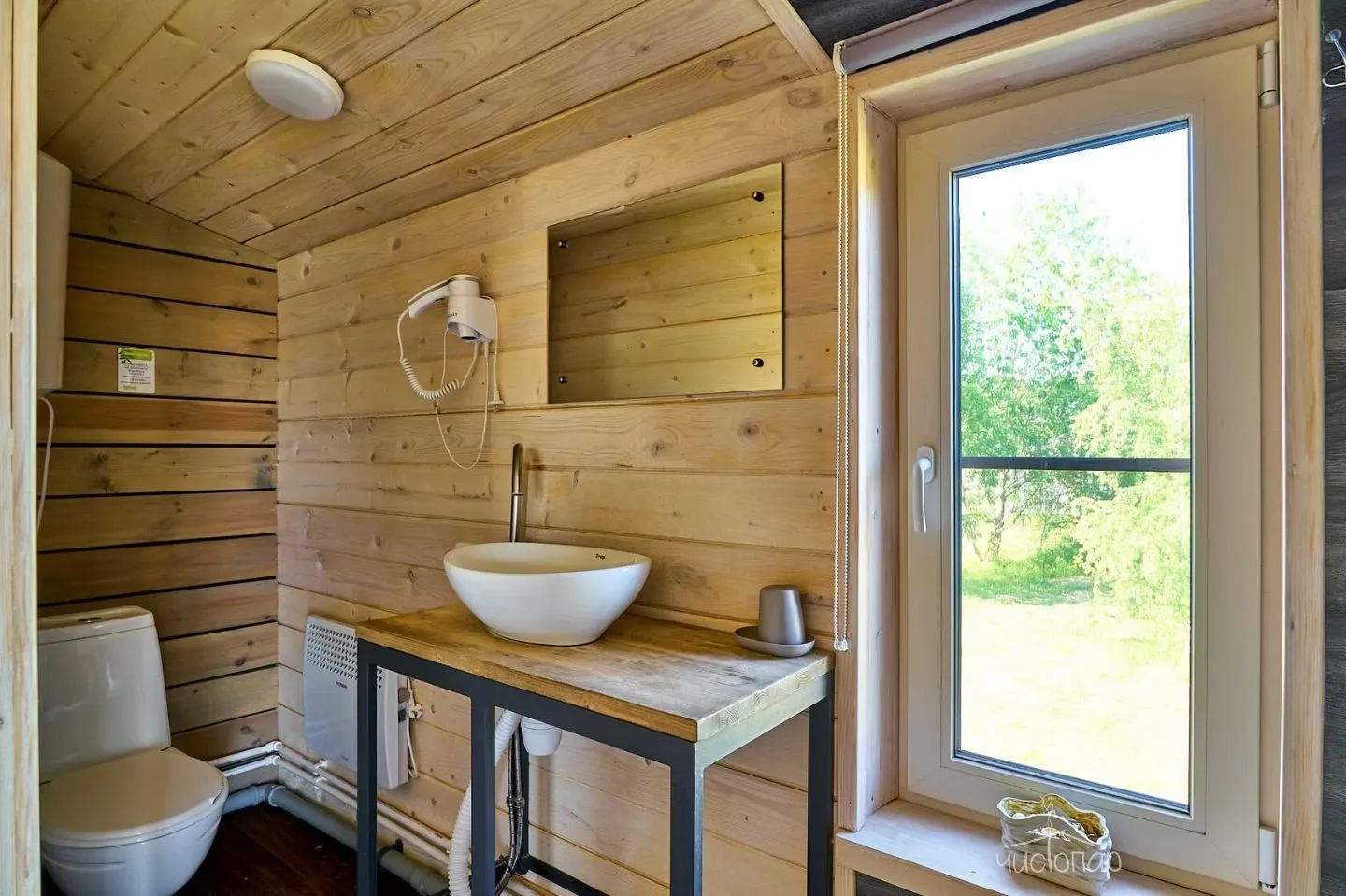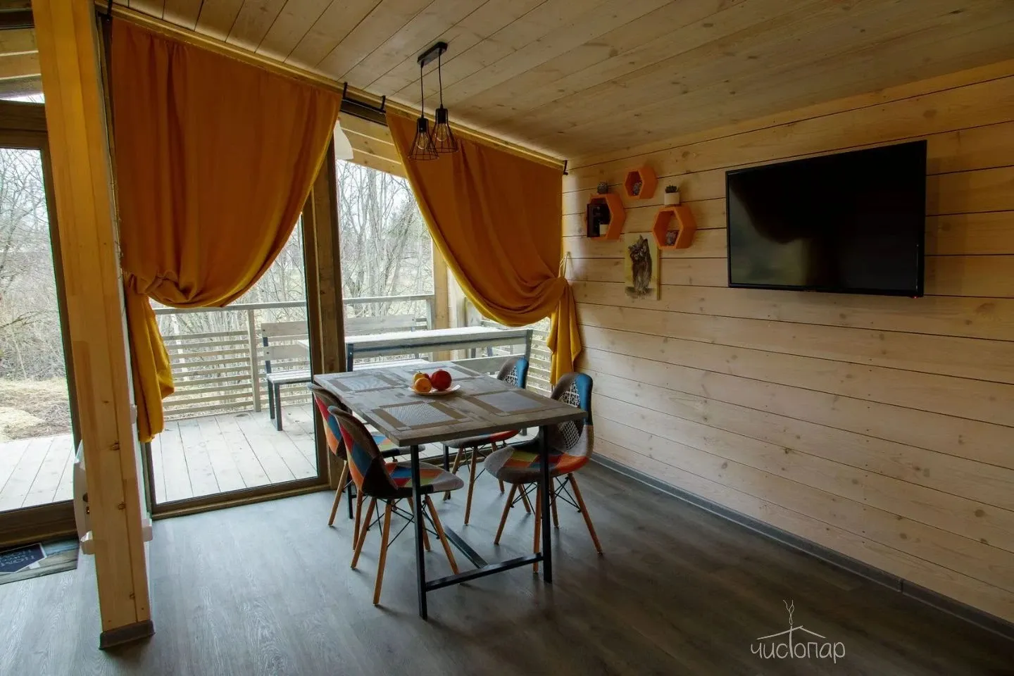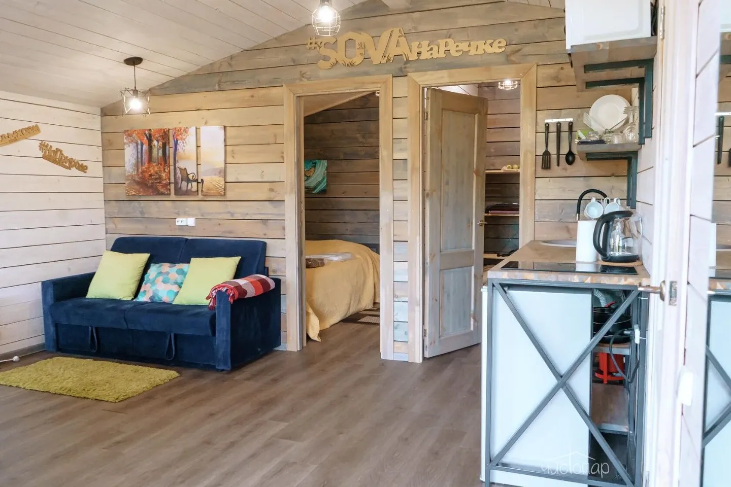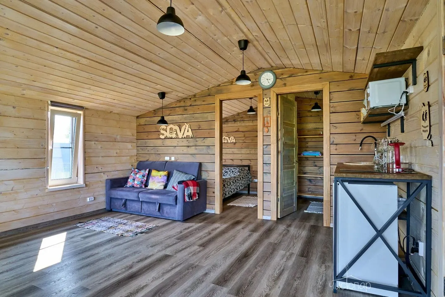Гостиная с кухонной зоной, столом и диваном, посуда, чайник, кулер, микроволновая печь, телевизор, Wi-Fi, отопление, санузел, душ, крытая терраса со столом и скамейками.