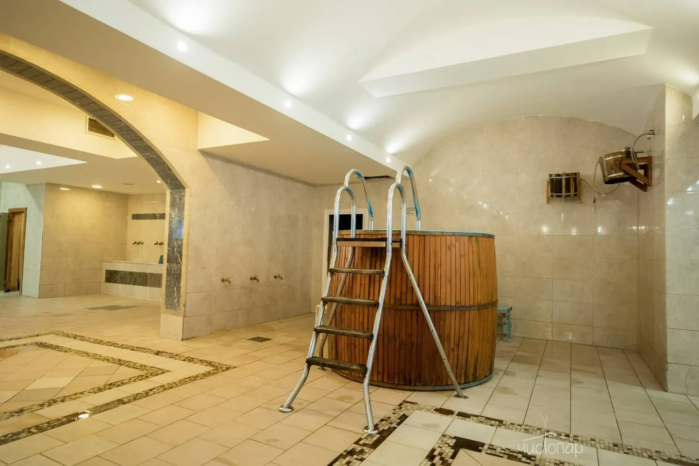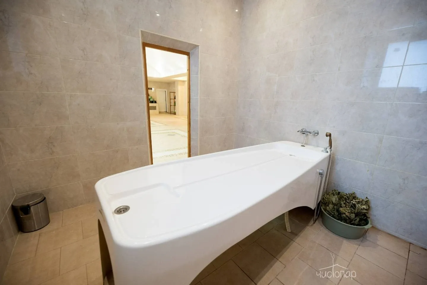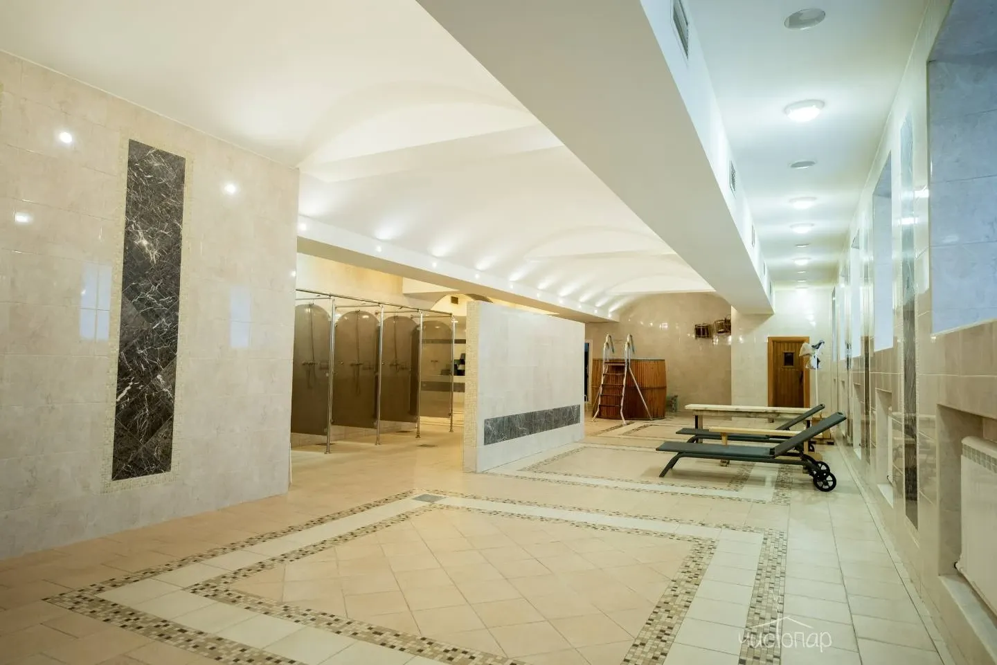 Люкс женский оборудован семейными и персональными раздевалками с вещевыми шкафчиками. К вашим услугам на выбор парение в традиционной финской или русской саунах, а также экзотическом турецком хамаме в менее раскаленном, чем в сауне, воздухе на теплых плитах. Из парилки вы можете сразу пройти к бассейну с функцией гидромассажа.