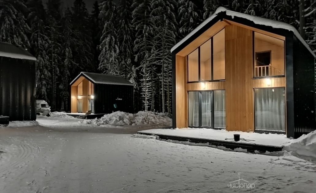 В лесу, среди вековых елей прячутся  2 коттеджа вместимостью по 8 человек (площадь 110 кв.м). Установлены двухярусные двуспальные кровати. В домиках установлены новые кухни с индукционной плиткой и набором необходимой посуды, холодильник, стол со стульями, жк телевизор с цифровыми каналами. Санузел с унитазом, раковиной и душевой кабиной. в санузле установлены теплые полы. Имеется небольшой коридор(прихожая) и помещение для спортивного инвентаря. Отопление централизованное. У каждого дома установлен комплект уличной садовой мебели. В наличии мангалы.