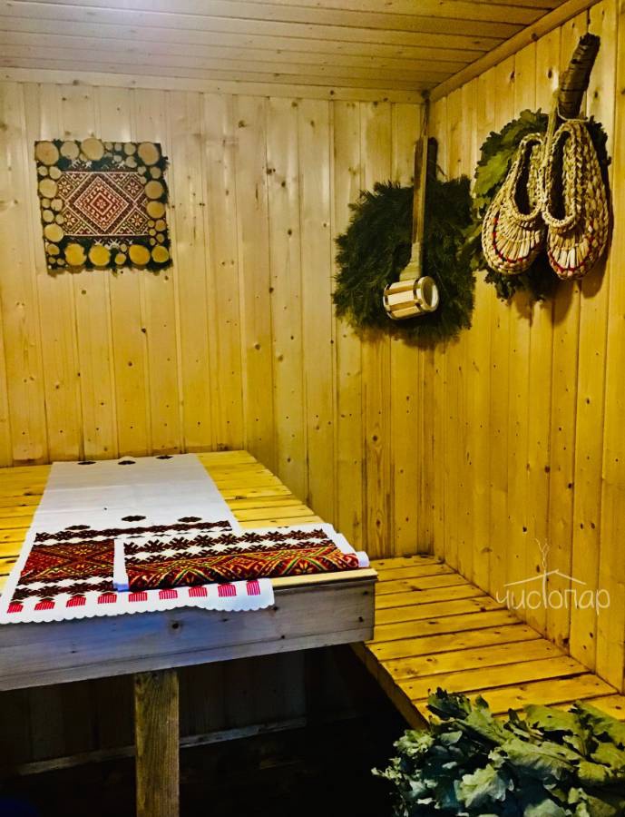 В комнате отдыха имеются лавки и стол, в парилке – полати.